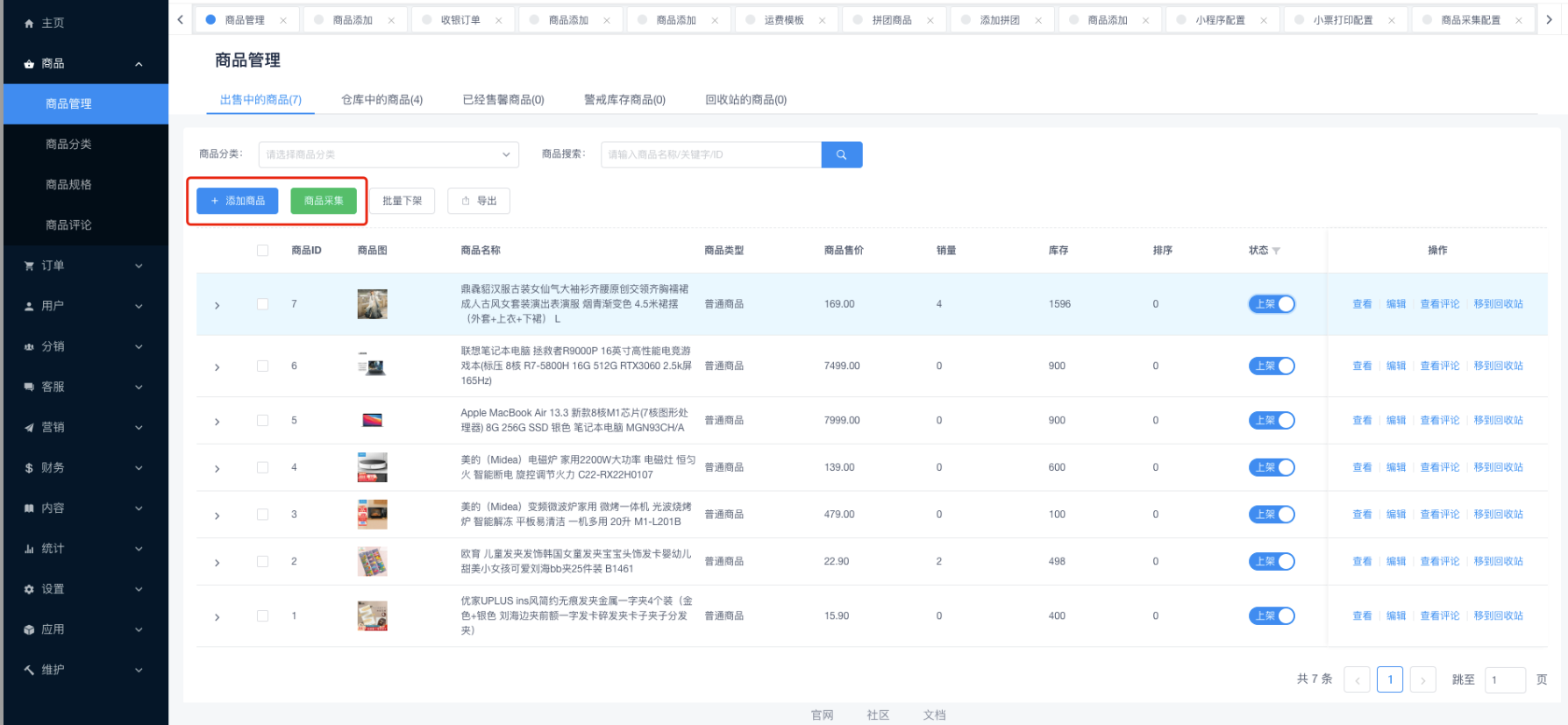 #发布商品 ###商品 > 商品管理  商品添加为分步添加:基础信息→规格库存→商品详情→物流设置→营销设置→其他设置,带 * 为必填选项