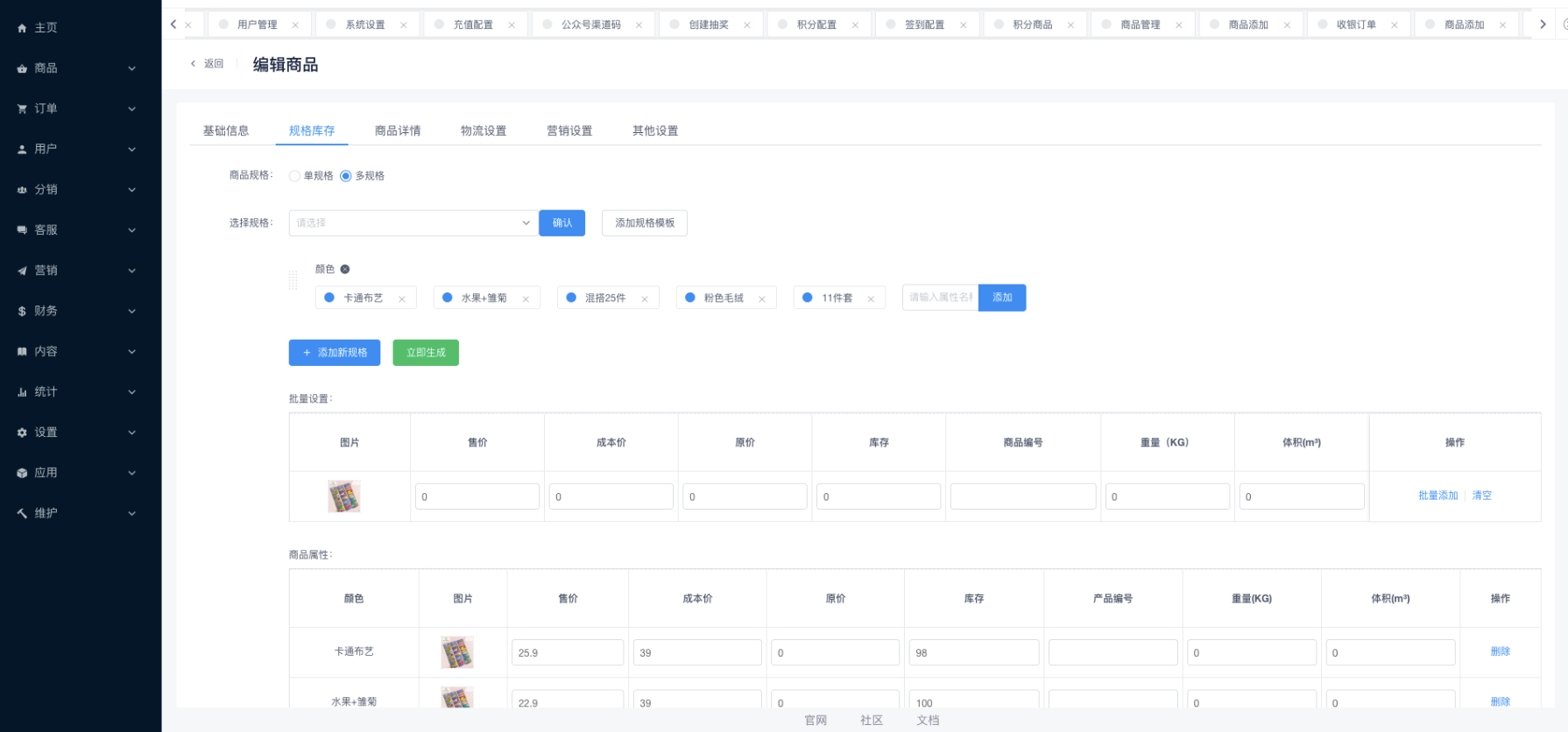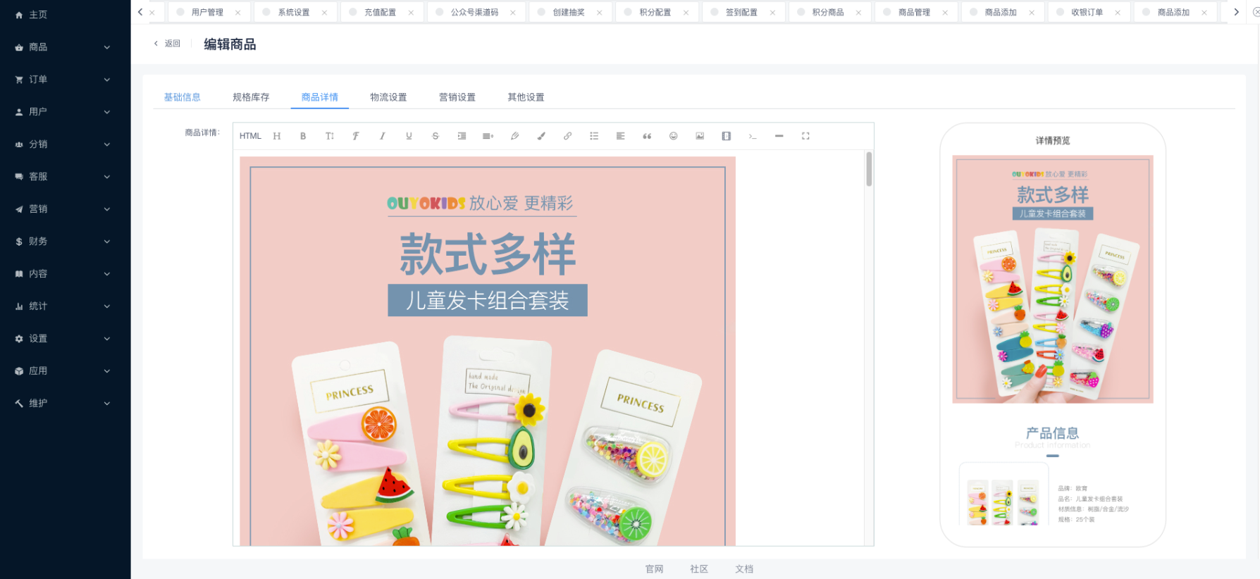 #规格库存  支持单规格和多规格 ####商品详情  (注:内容视频与主图视频一样,支持外链视频或本地上传)