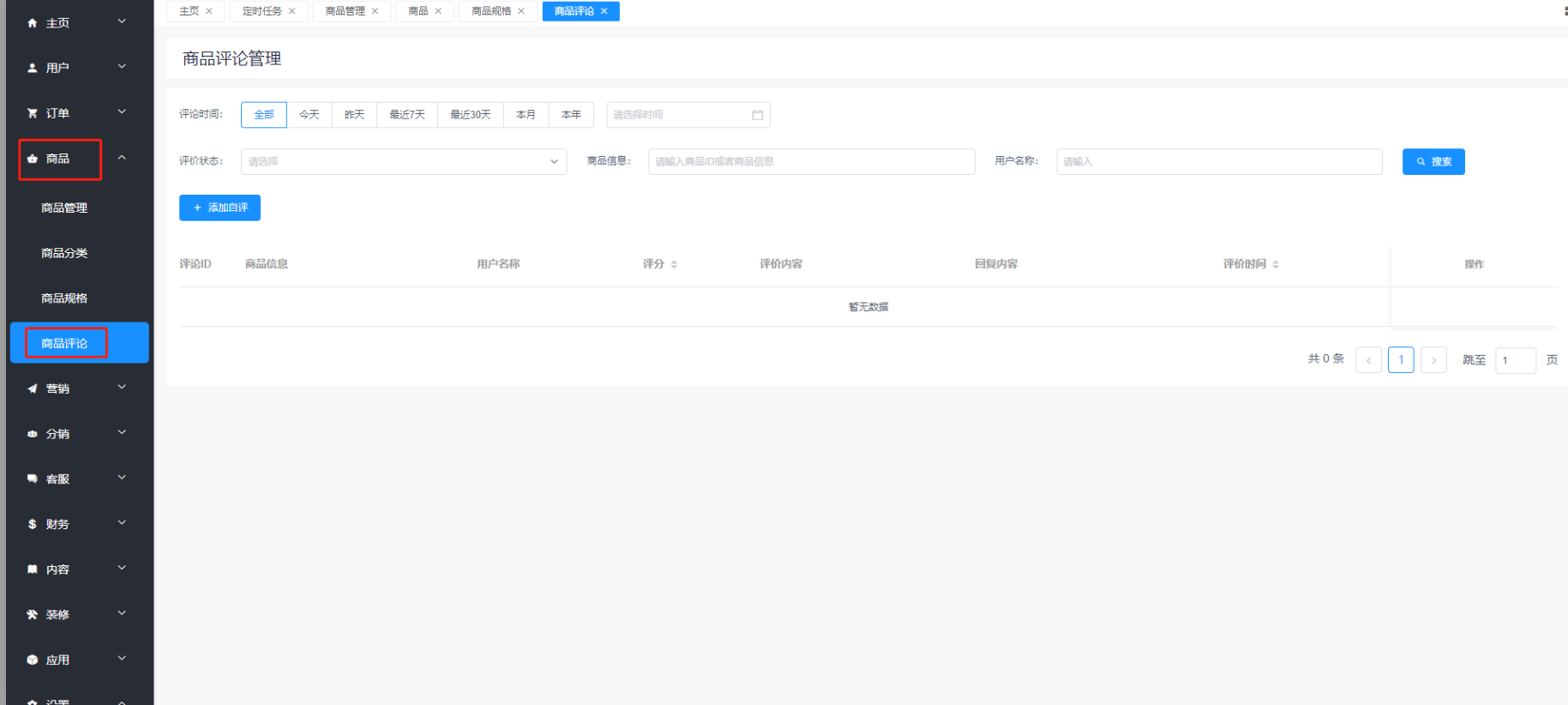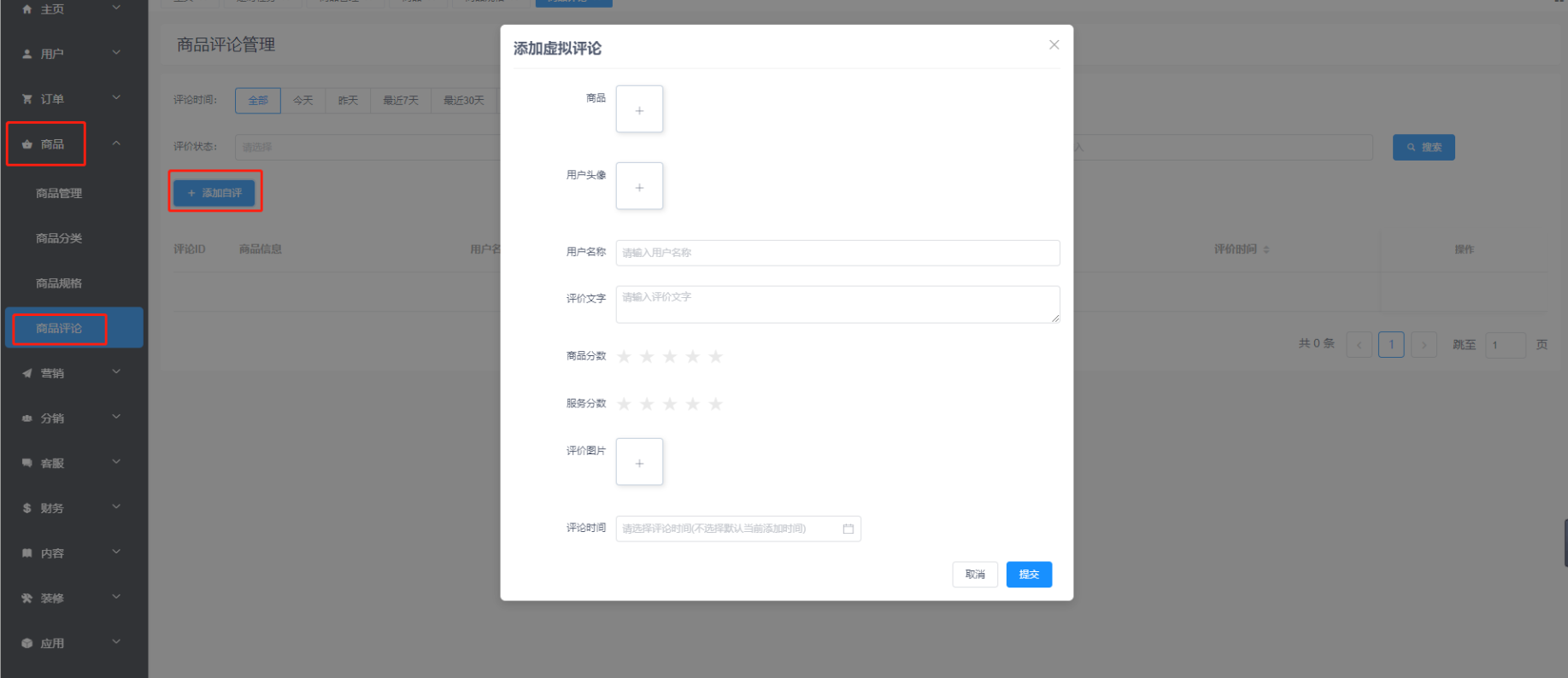 #商品评价 ###商品评价 ####位置: 商品 > 商品评论  添加虚拟评论 #####位置: 商品 > 商品评价 > 添加虚拟评论  ####商城自动评价 #####位置 设置 > 系统设置 > 商城配置>商城基础配置