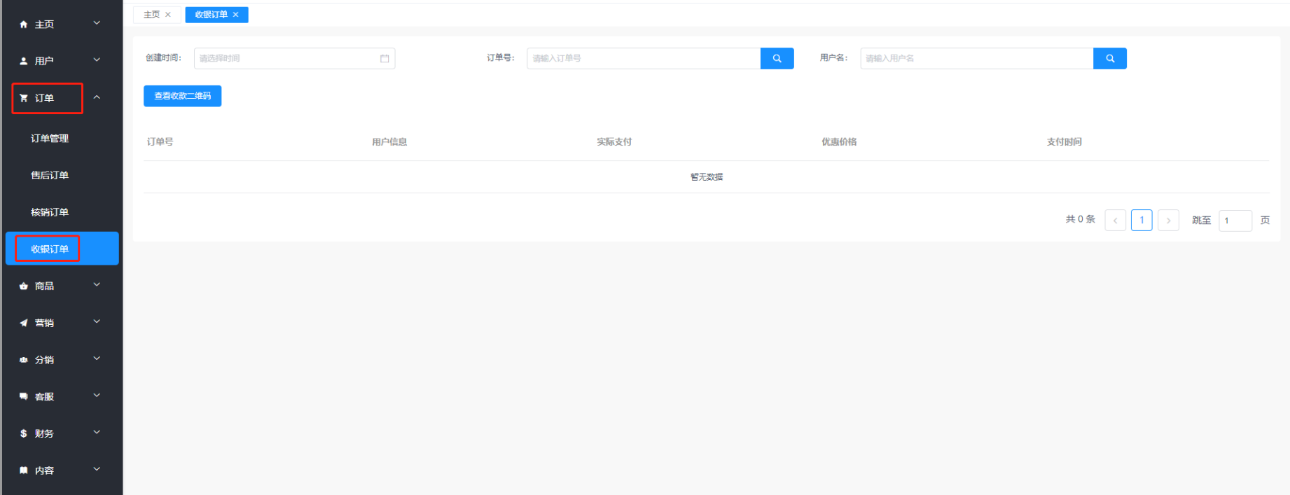 #二维码收银订单 使用方法 后台生成公众号/小程序收款码,可下载图片后打印使用 用户扫码支付后,后台有订单记录  收银订单记录 位置:订单 > 收银订单
