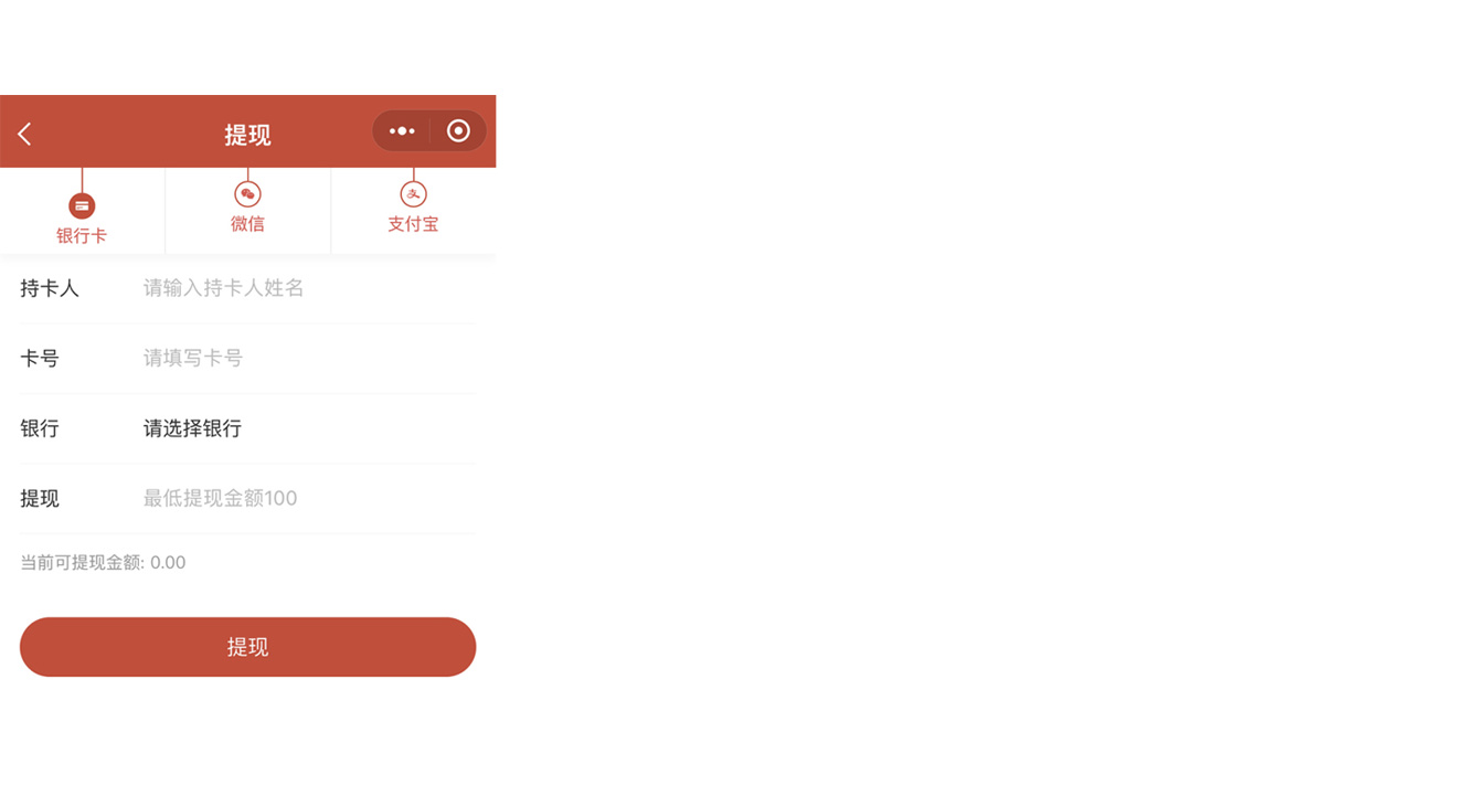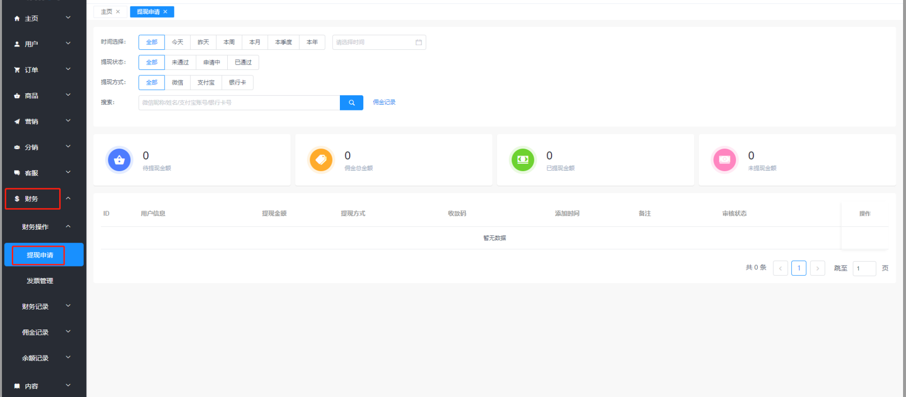#佣金提现 ##佣金提现 ###用户申请提现 用户需要在前端申请提现 可选择银行卡、微信、支付宝三种方式 商家通过后台的申请记录,线下人工转账  ##线下转账 财务 > 财务操作 > 提现申请  ##佣金冻结 冻结的佣金不可提现,达到解冻时间后方可提现;冻结期从用户获得返佣时开始计算