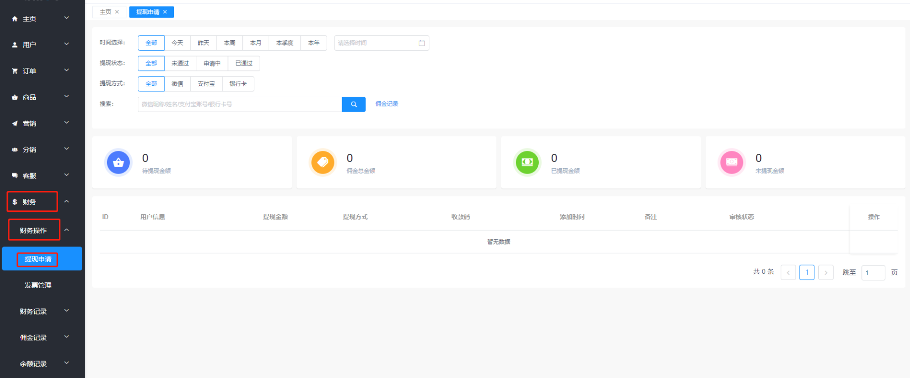 1.系统后台点击:财务→财务操作→提现申请