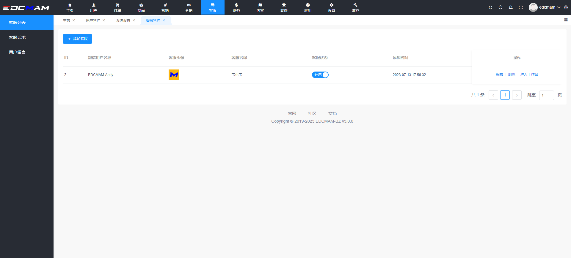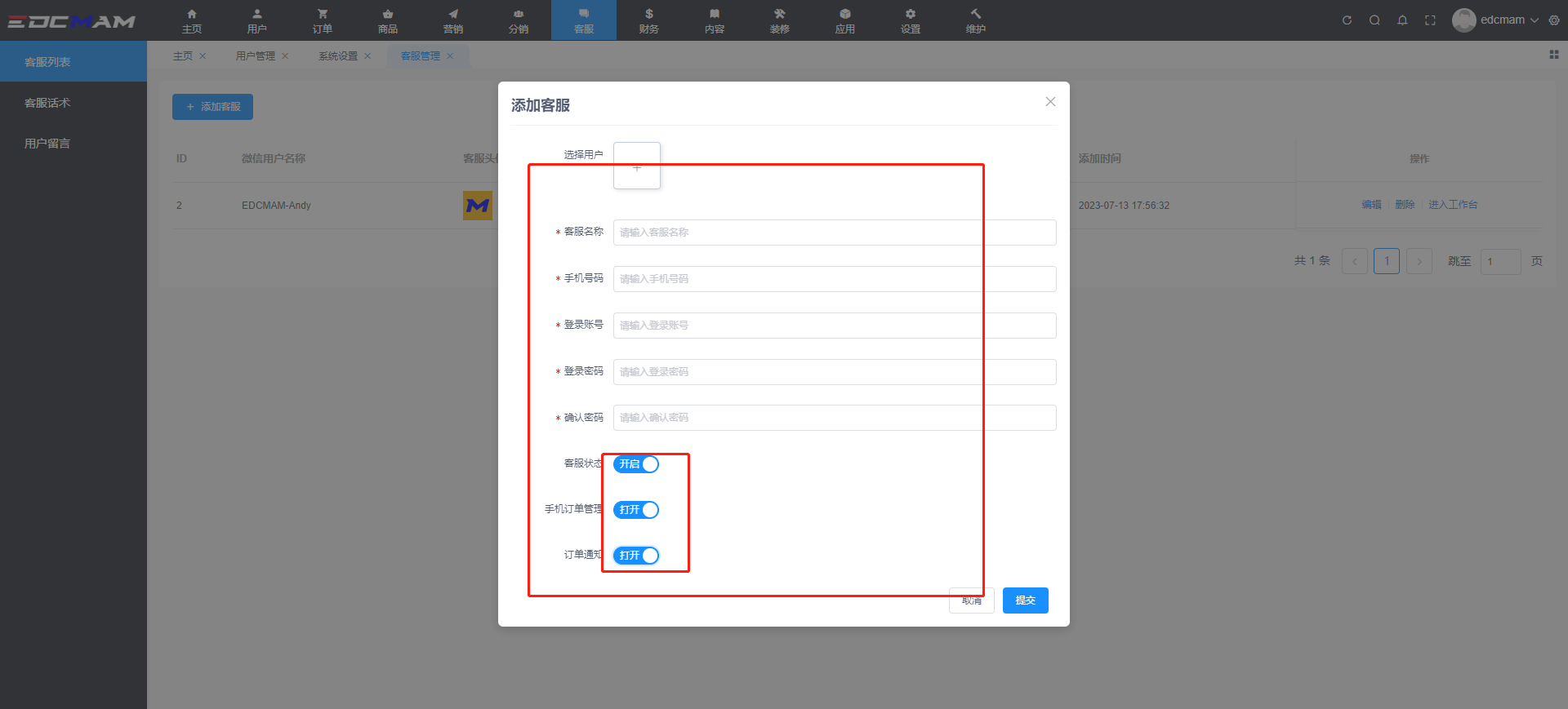 填写客服名称(方便管理)填写手机号(给客服发送订单通知等消息提醒)设置登录账号密码(登录客服工作台)客服状态:开启或关闭此用户的客服身份,关闭后该用户的客服功能不能使用手机订单管理:控制移动端的手机订单管理权限订单通知:控制给客服发送消息提醒功能
