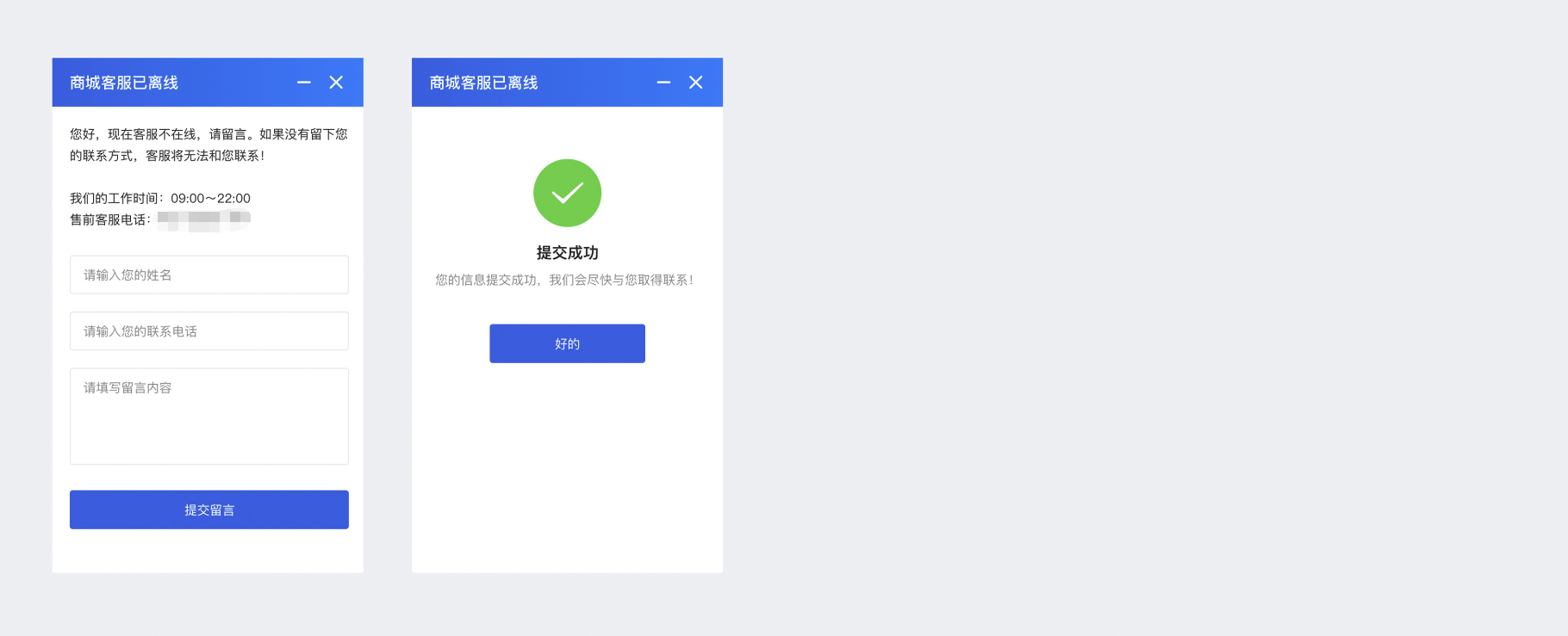 商城客服均离线时,用户端有客服反馈表单,方便用户将问题反馈给平台
