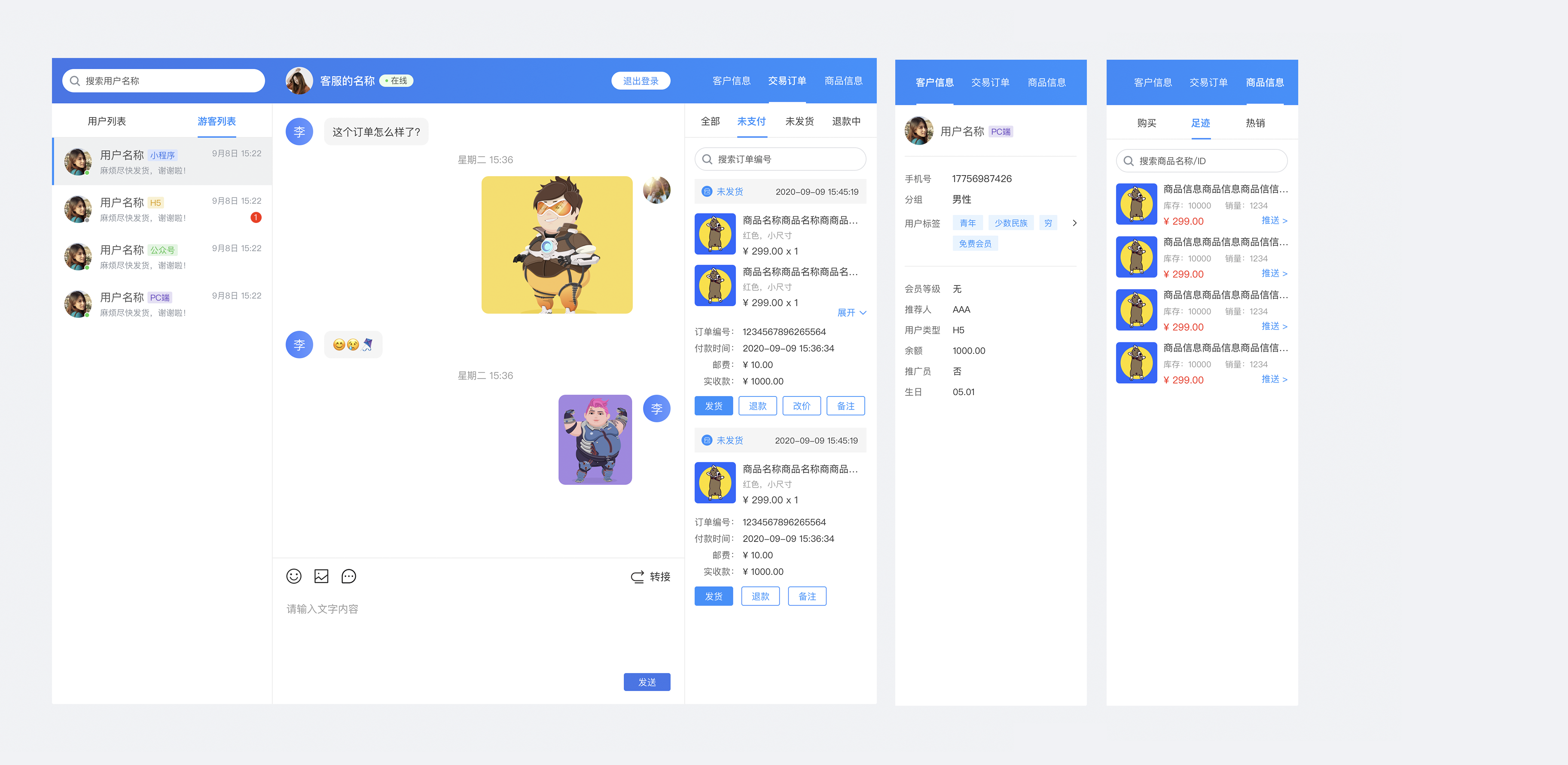 发送内容:文字、图片、表情、订单信息、商品信息