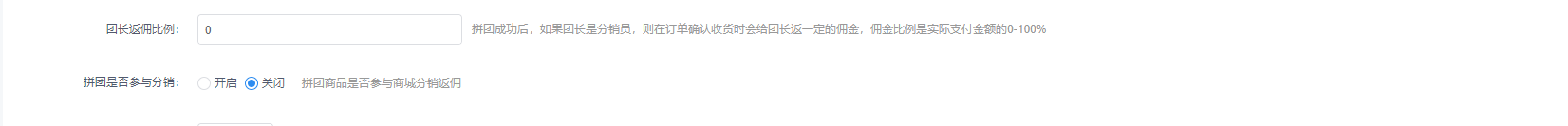 #拼团返佣 ##拼团返佣说明 ####拼团商品在添加的时候,可以设置该拼团商品是否参加程序的正常返佣逻辑以及团长是否有单独的佣金  #####拼团商品开启参与分销之后,用户购买了拼团商品在收货之后,会给上级用户返系统配置的比例佣金 #####设置了团长返佣比例,成团之后团长收货会给自己返支付金额的百分比作为佣金