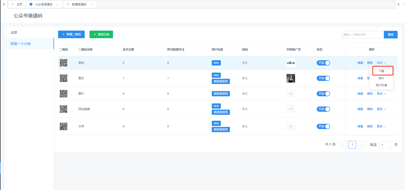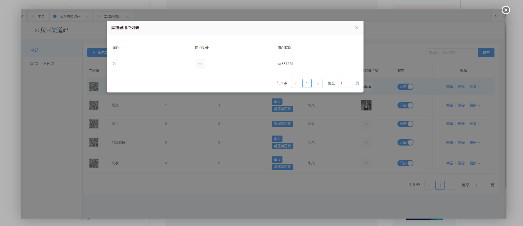 6、然后在后台 更多—-用户列表中可以查看推广的用户和二维码统计