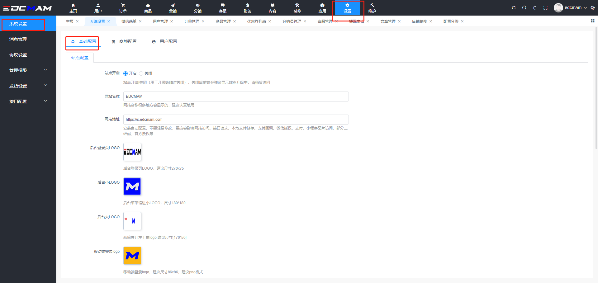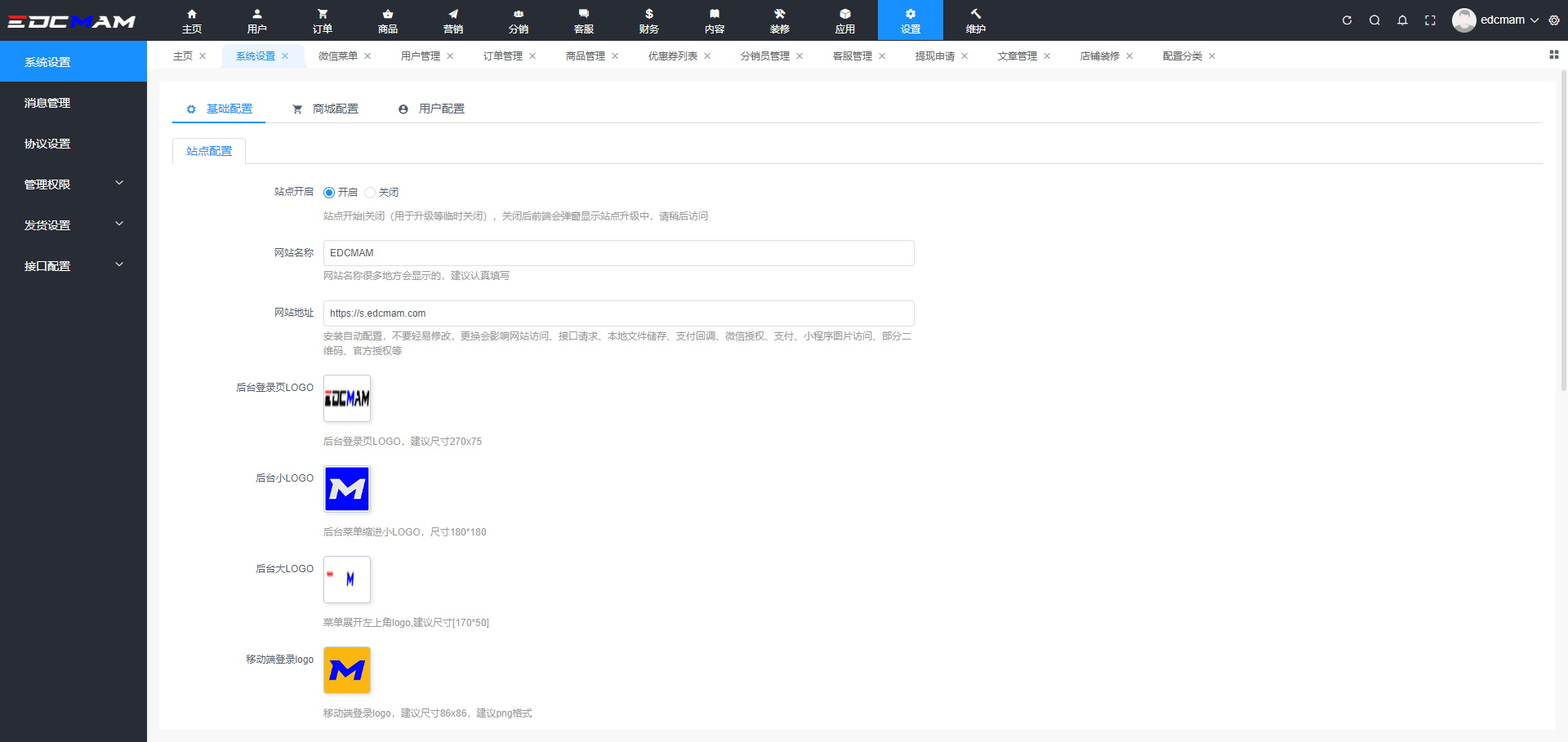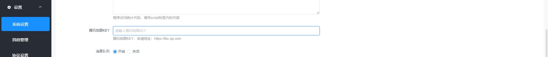 位置: 设置 > 系统设置 > 基础配置 > 站点配置地图配置: 门店自提功能需要腾讯地图KEY(具体可查看配置说明 > 物流配置)