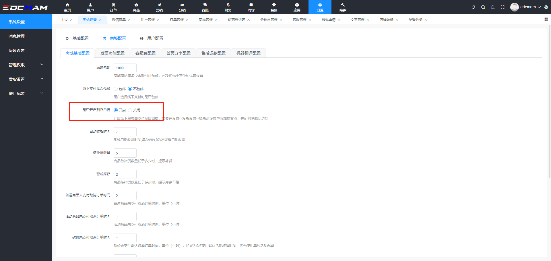开启后下单页面支持到店自提,需要在设置->发货设置->提货点设置中添加提货点,关闭则隐藏此功能位置: 设置 > 发货设置 > 提货点设置 > 提货点