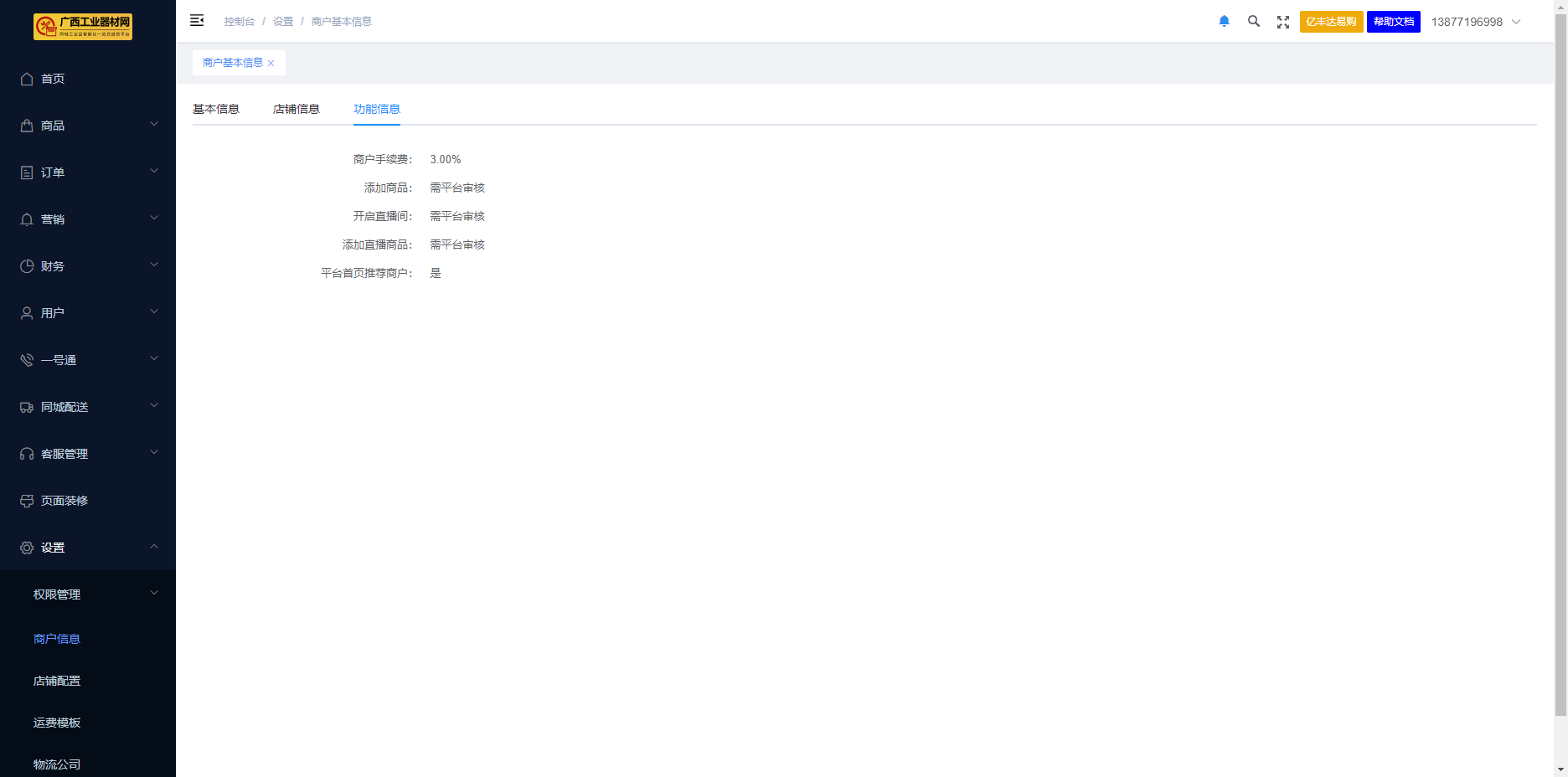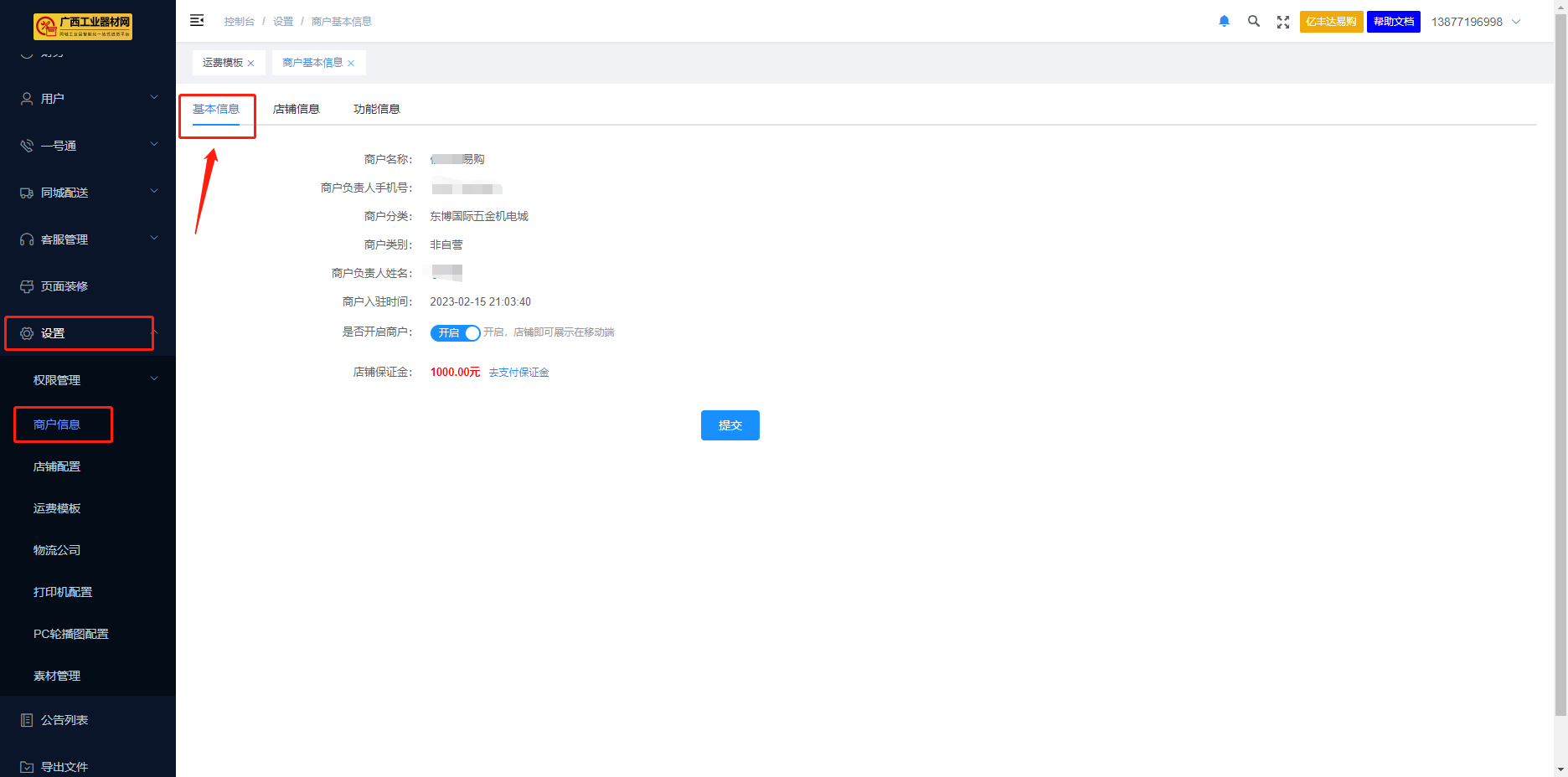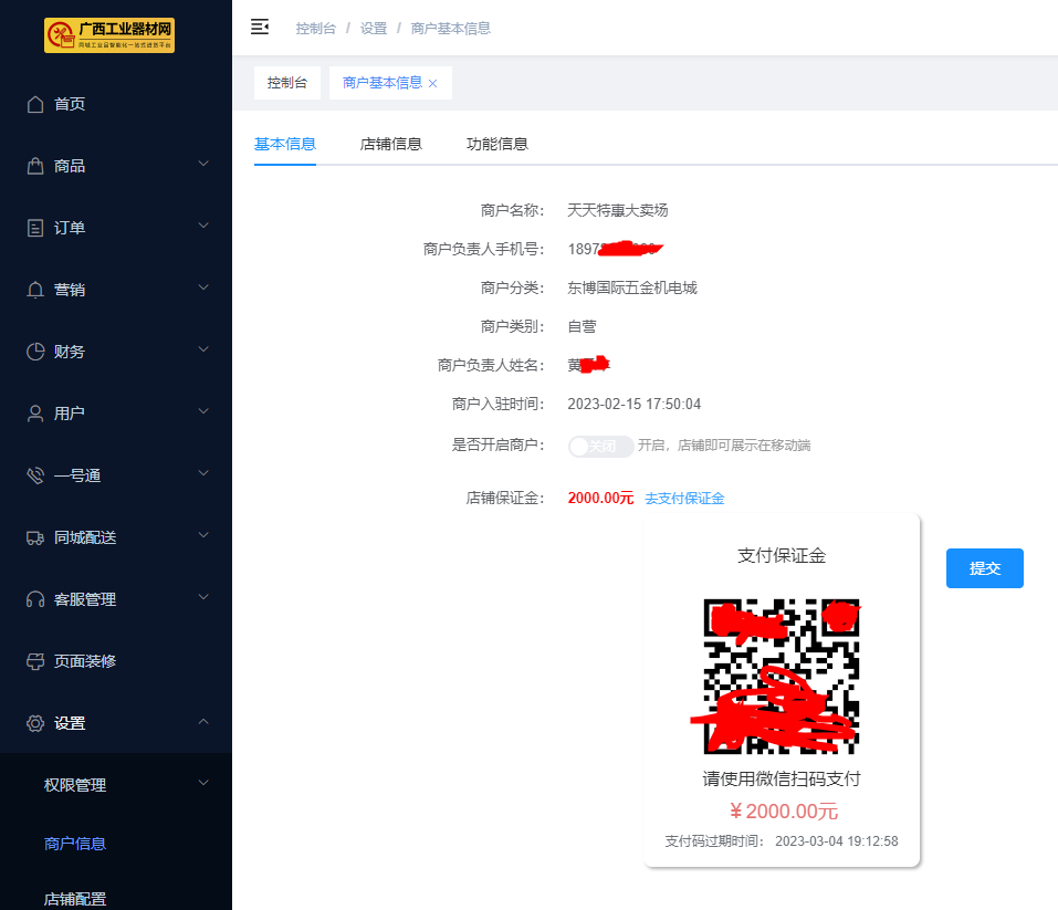 ### 店铺设置 ##### 1、打开浏览器,在网址栏中输入“[s.hoki.info/merchant](http://s.hoki.info/merchant "s.hoki.info/merchant")”进入商户门店管理系统  首次登录时,输入平台下发的登录账号及密码 已经登录过或已经修改过密码的,请使用修改后的账号密码进行登录 > 特别注意 > 使用员工账号登录时,一定要确保该账号拥有配置店铺信息的权限。推荐用主账号进行配置 ------------ ##### 2、成功登录后,点击页面侧边栏,【设置】 - 【商户信息】  ------------ ##### 3、店铺开启按钮默认为关闭状态,需要支付相应的保证金后,方可点击开启。  ##### 4、移动鼠标到蓝色 “去支付保证”上即可获得支付二维码 > 特别提醒 未支付保证金的商户无法开启 店铺保证金是平台向门店收取用于该商铺经营过程中履行用户保障及平台规则保障的资金保证。详细内容见商户保证金用途。 不同的店铺类型,所需支付的保证金额不同。平台的分为以下几种类型 (1)社区店:指社区/小区周边面向终端客户的五金店为主; (2)专卖店:指在专业五金机电市场(如东博国际五金机电城)开设有实体门店的专业经营门店; (3)旗舰店:指在专业五金机电市场(如东博国际五金机电城)开设有实体门店,且实体门店面积达到要求、有用户到店体验能力的门店; (4)工厂店:指拥有实际生产工厂,进入平台进行厂家直接销售的店铺; (5)品牌自营:指品牌持有方自主通过平台开设店铺向外销售的门店,该门店类型可以没有实际的生产工厂(例如:使用代工生产方式); (6)无实体电商:指没有实体门店、工厂,专业从事互联网销售的线上门店。 具体的店铺类型详见《店铺类型说明》。  ####2、左边菜单栏“设置”、“商户信息”、右边对应“基本信息、店铺信息、功能信息”。 #####1)基本信息  #####2)店铺信息,配置店铺背景图、头像、配送方式、提货地点、经营时间、商家简介,填写完成后点“提交”,商户信息配置完成。 #####3)功能信息,显示手续费、添加商品、开启直播间、添加直播商品、平台首页推荐商户等是否需要审核。
