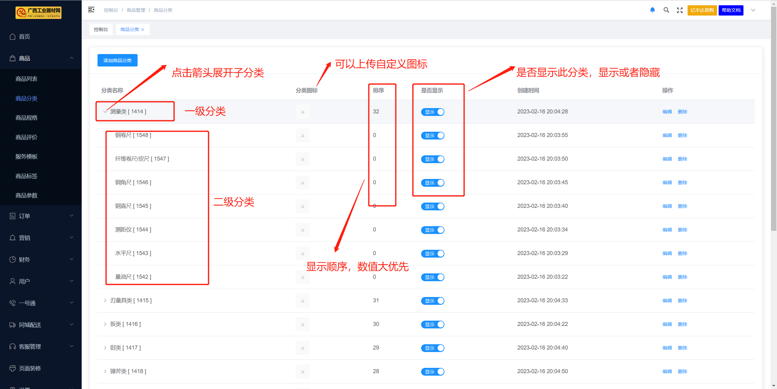 ### 1.排序,数值大的优先 ### 2.商品必须选择在二级分类下,且只能选择一个分类,否则前台不展示; ### 3.隐藏分类直接关闭显示按钮。 ### 4.分类下有产品或者下级分类,则该分类无法直接删除,需先删除分类下的下级分类和产品;
