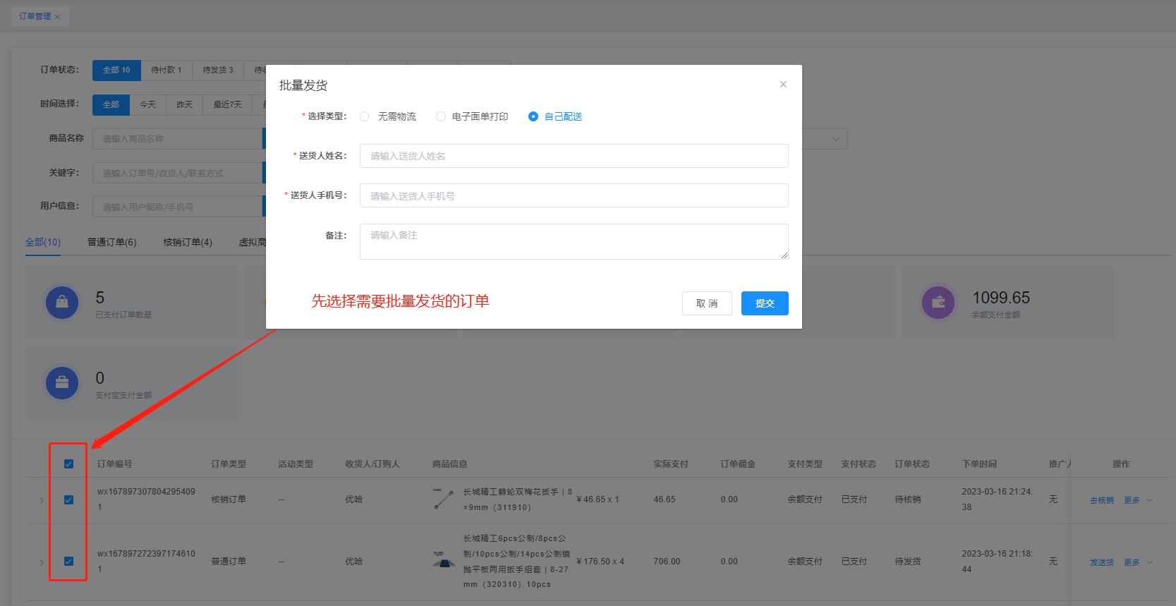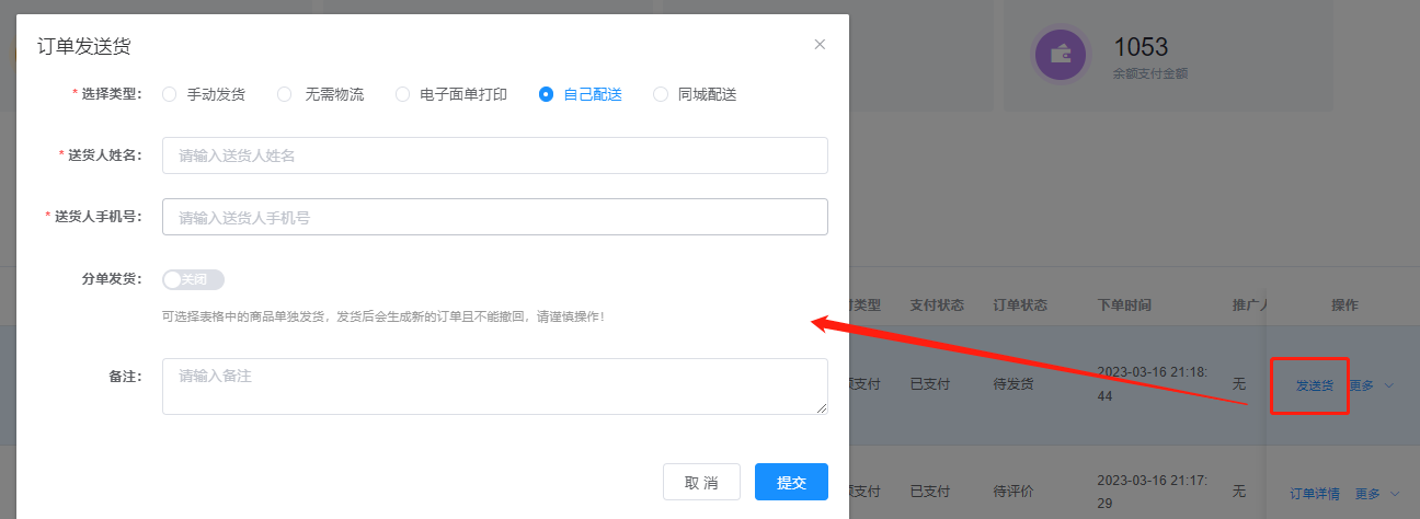 自己配送:输入送货人名称、送货人手机号,点击【提交】;