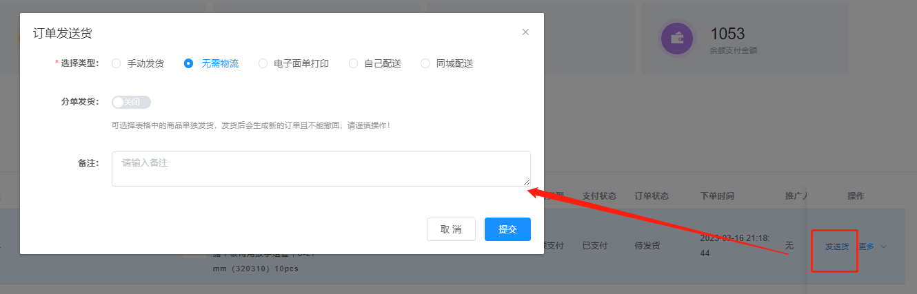 无需物流:可开启【分单发货】,即为可选择表格中的商品单独发货,发货后会生成新的订单且不能撤回,请谨慎操作!