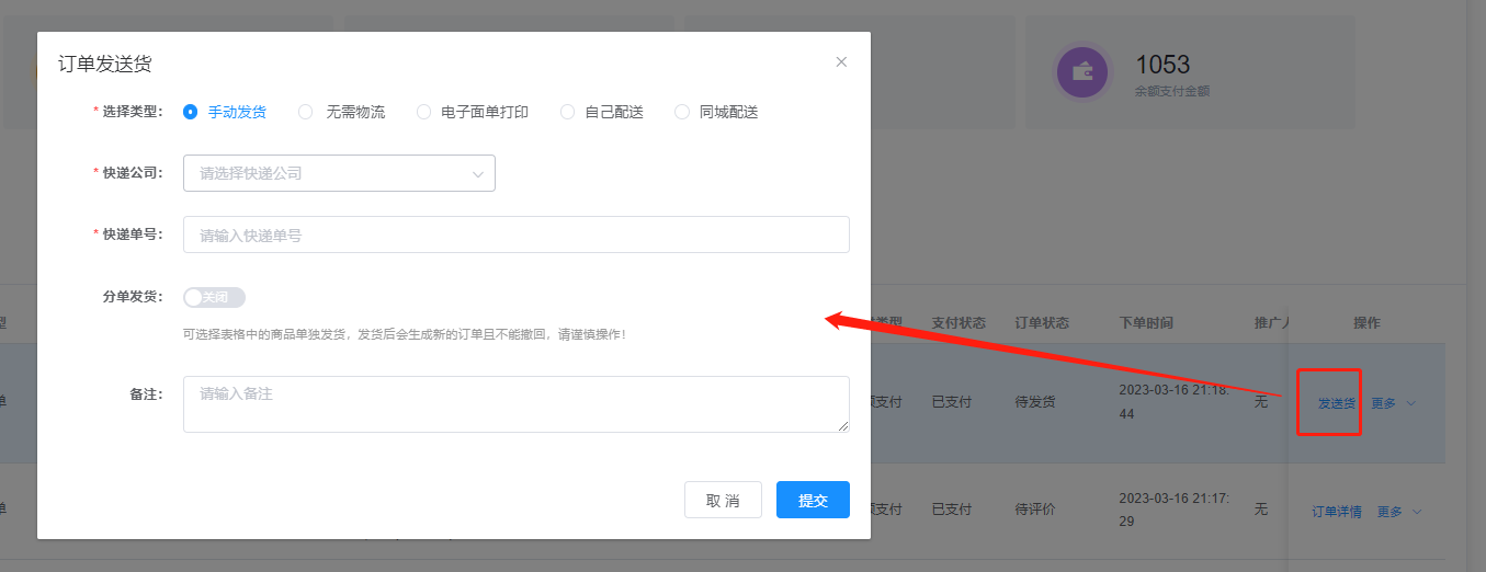 手动发货:在输入栏下拉选择发货的快递公司、输入快递单号;