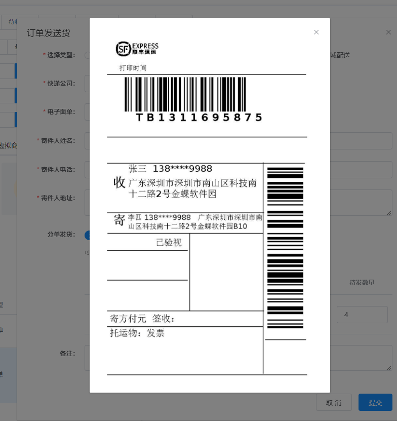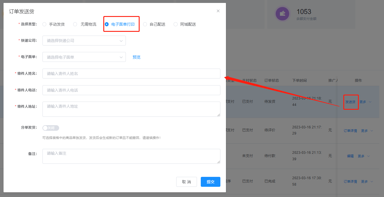 电子面单打印:在下方输入栏下拉选择发货的快递公司、选择电子面单、寄件人、寄件人电话、寄件人地址;