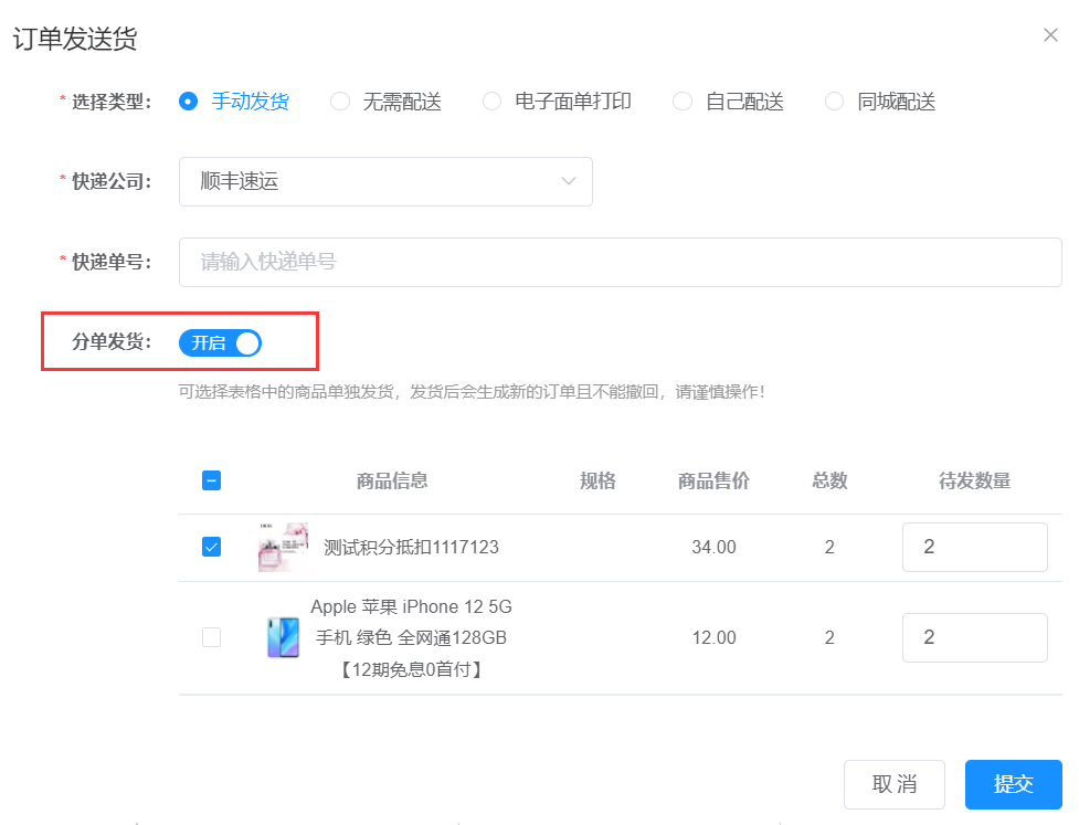 (1)订单中有多件商品,且需要在不同的地方发货时,可以选择分单发货;