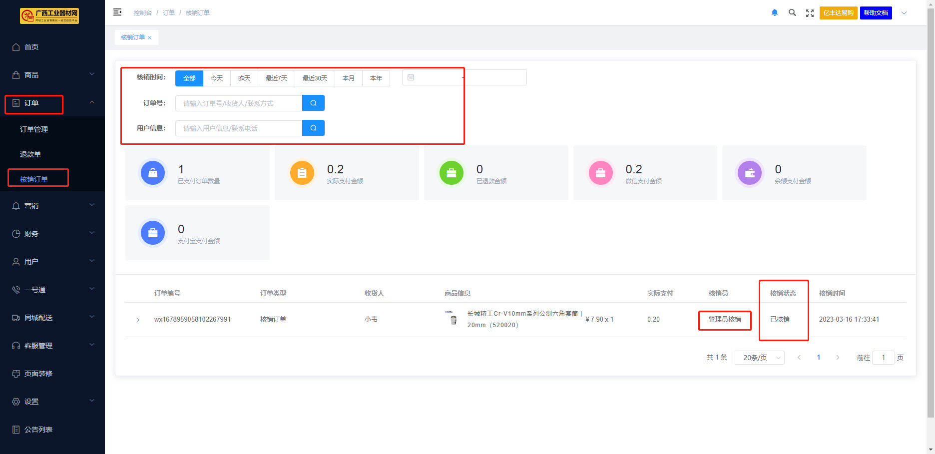 核销时间:【全部、今天、昨天、最近7天、最近30天、本月、本年、自定义选择时间段】,可按需要查询的时间段进行选择,下方列表展示相关的核销订单信息。