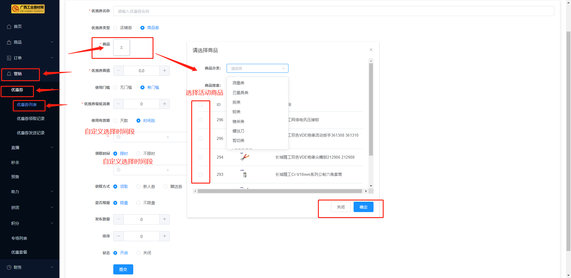 优惠券类型::【店铺券】、【商品券】; 选择店铺券是针对整个店铺的商品进行发放优惠券活动,选择商品是针对某个产品类别、某一个商品或多个商品进优惠券活动。操作:点击下方【商品】弹窗进入选择商页面,选择完成点击确定系统返回到添加优惠劵届面;