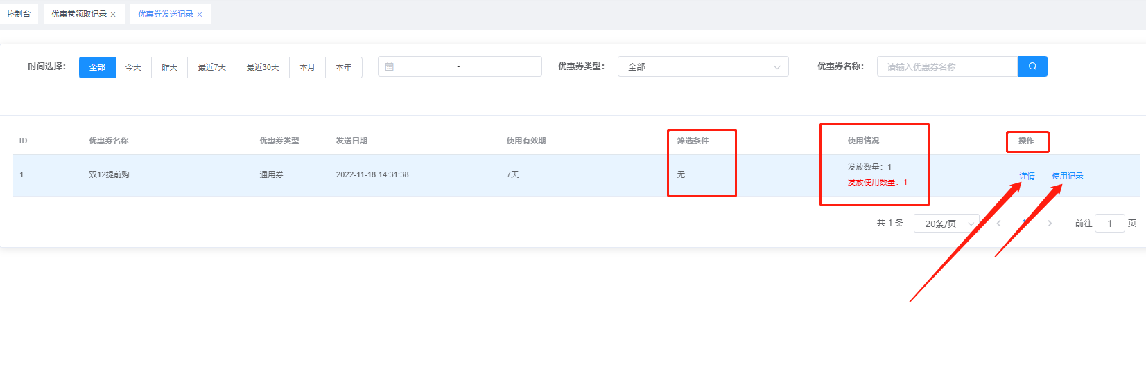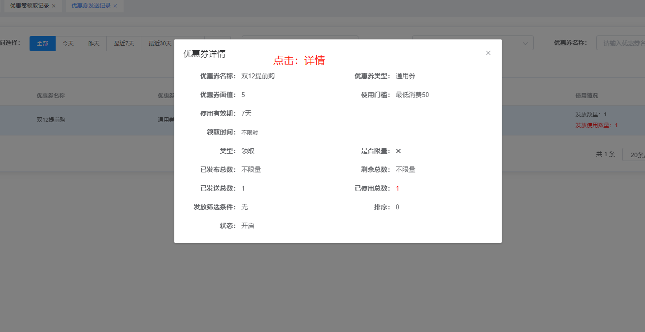 优惠劵发放记录列表右侧【操作】下方点击【详情】弹窗此优惠劵发放的详情;