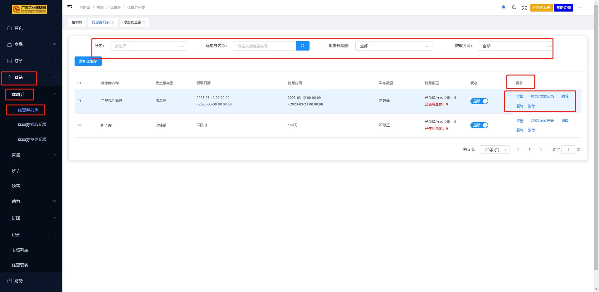 状态:【开启】、【关闭】,点击开启优惠劵,此活动即将生效;关闭则此活动暂不生效;