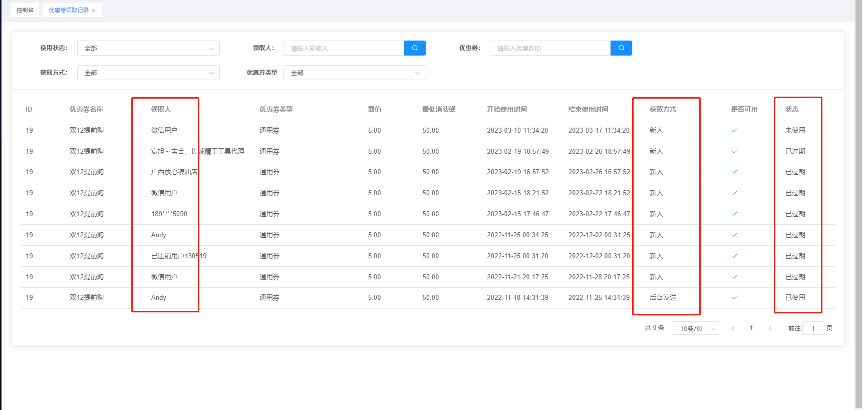 使用状态:点击【^】下拉选择:全部、已使用、未使用、已过期;