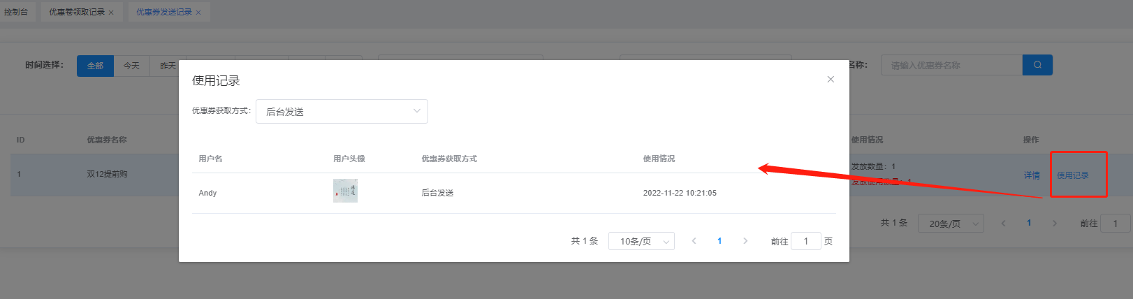 使用记录:弹窗此优惠劵获取方式、用户名、用户头像、具体使用时间;