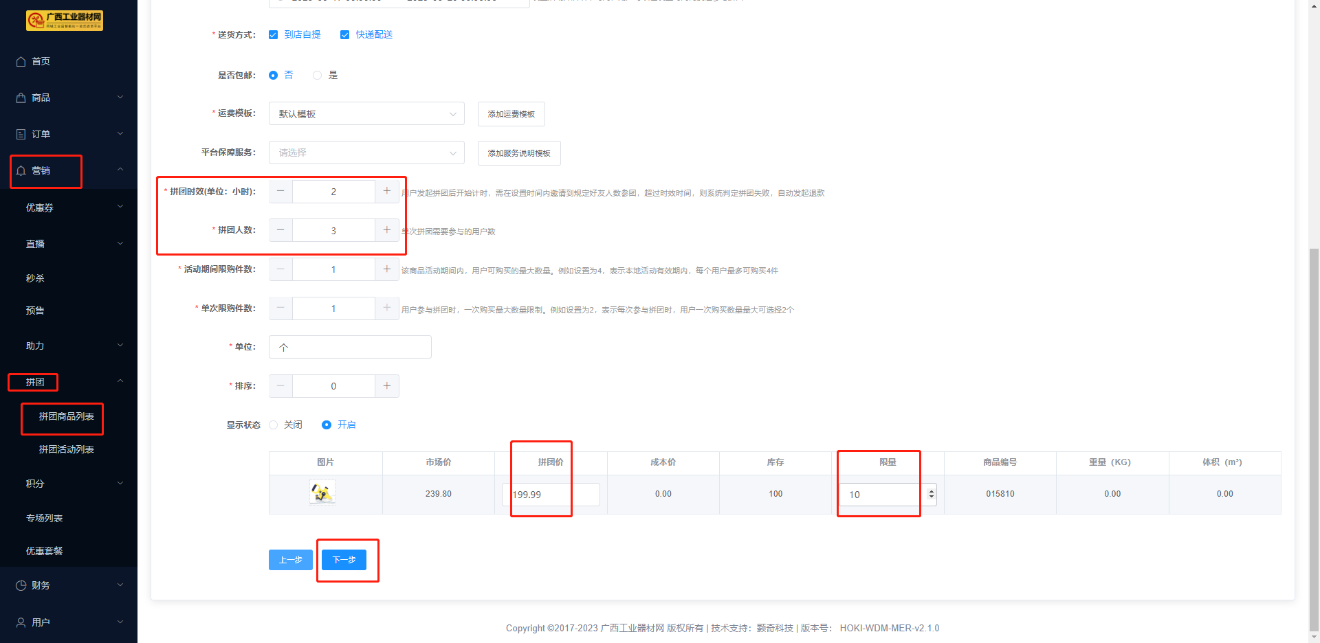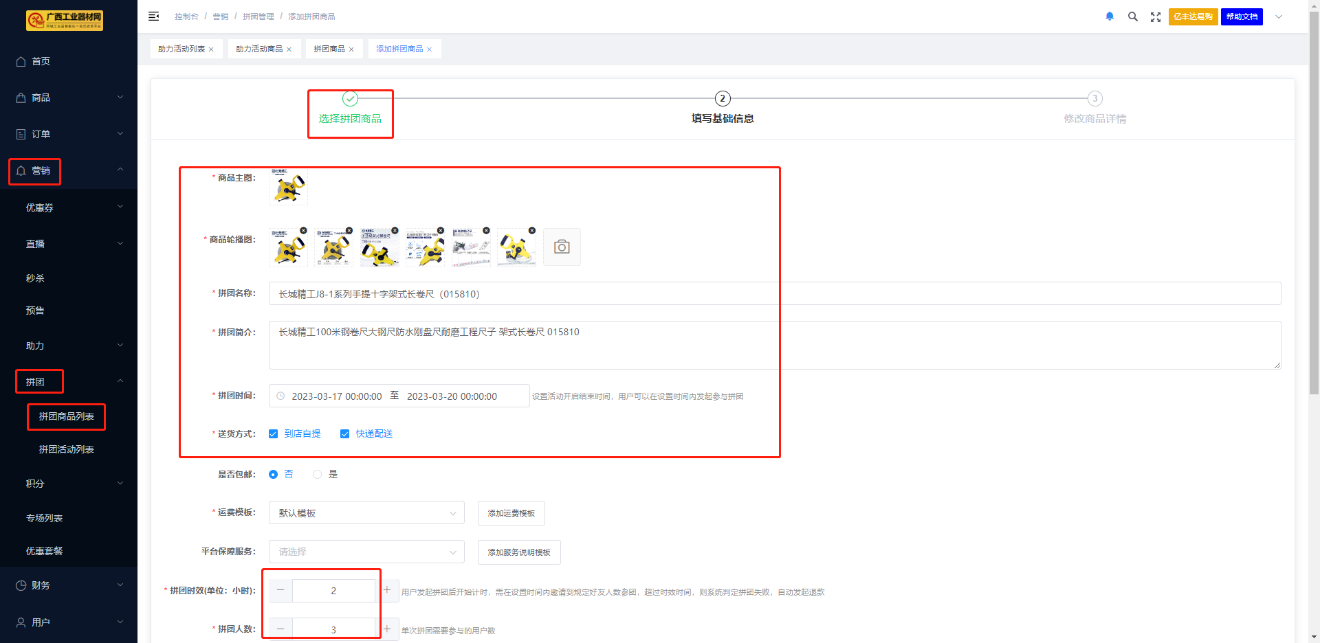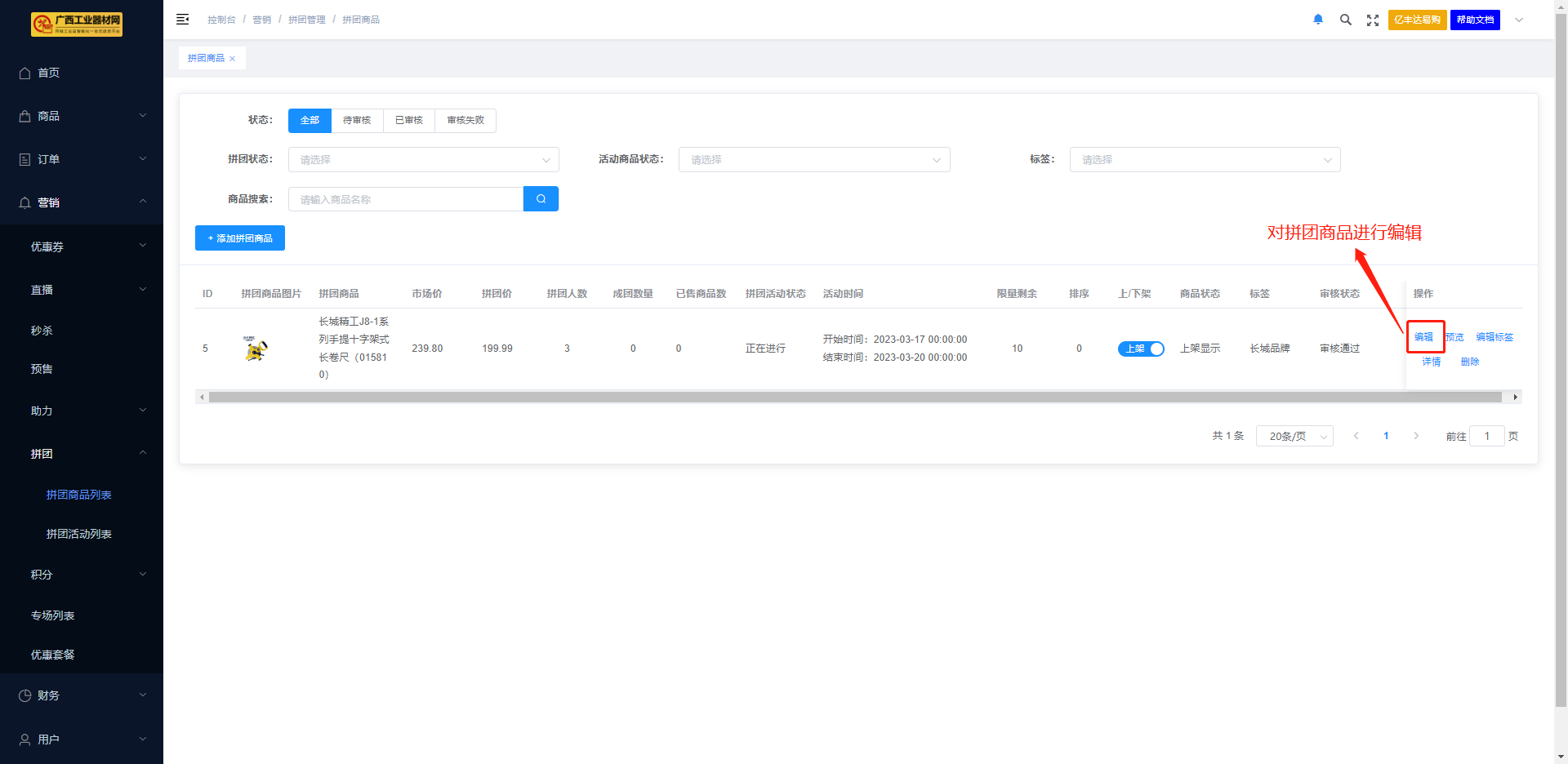 ###位置:营销>拼团 ####功能介绍:“拼团”功能是由商家针对特定商品,在约定时间内,以成团人数为条件,用优惠价格出售商品的营销活动。商家可在后台自行设置拼团商品、拼团价格、活动时效、参团人数及活动商品限购等信息。通过鼓励买家发起拼团,邀请好友以折扣价格购买优质商品,同时给店铺带来更好的传播效果。 ```json 拼团商品属于活动商品,因此不支持加入购物车和其他商品进行结算,只支持原价直接购买和拼团直接购买; 为配合拼团活动,微页面会有对应的拼团组件,商家可以使用拼团组件,搭建拼团专题活动页,打造营销氛围,第一时间曝光活动; 拼团库存需小于商品本来的库存(拼团库存是从商品本来的库存中减),拼团价需小于原价,拼团价格独立,拼团活动结束快速恢复原价,流量不浪费,产生更多的交易; 活动有效期内,如果参团人数不足,则商家不能发货,等待成团,反之,一旦达到参团人数数量,则该拼团成功,商家发货; 活动有效期内,拼团失败,订单关闭并自动退款给用户; 在同一时间段一个商品只能参与一个拼团或秒杀活动; 商家可以在后台设置拼团活动是否与优惠券、满立减等营销功能叠加使用; 如果该拼团商品是推广员推广商品列表里面的,推广员成功推广后仍可以获取佣金(按拼团价计算); 添加了拼团功能的商品在默认的商城列表页有“拼团”的标签。 ``` #####营销>拼团>拼团商品>添加拼团商品 步骤:选择助力商品>填写基础信息>修改商品详情; ```json 点击【添加拼团商品】,选择需要进行拼团活动的商品; 填写基础信息,商品图片、活动名称可以进行编辑;选择拼团活动的时间段;(注:设置活动开启结束时间,用户可以在设置时间内发起参与拼团) 拼团时效:指本次拼团活动时长,以小时为单位,如:2小时; 拼团人数:指本次拼团需要参与的用户数;如:3人一起拼团下单才能享受拼团的价格; 单次限购次数:指本次拼团一个用户购买次数; 规格列表:拼团价格,指本次设定拼团活动的价格,如:原价为238.9元,现拼团价为:199.99元,当3个用户同时在拼团链接同时间段内购买该商品时间即可享受199.99元; 限量:指本次活动的数量,该限量数量不得大于库存数量; 基础信息设定完成后点击【下一步】,进入商品详情,若需要对此详情页进行修正,可重新上传图片; 点击【上一步】对基础信息进行查看或编辑;点击【提交】,返回到添加拼团商品页面, 等待后台审核; ```