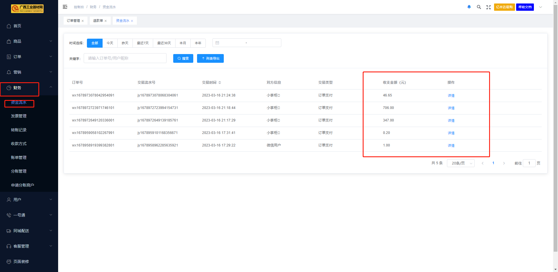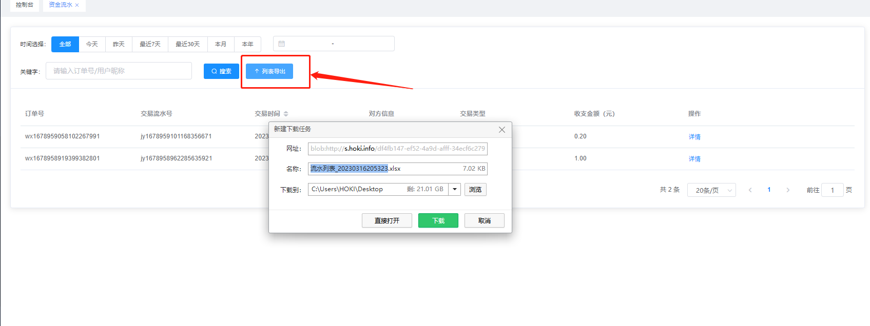 ####位置:财务>资金流水 #####功能介绍: #####此功能可查询到整个店铺的经营收支情况;  ```json 时间选择:【全部】【今天】【昨天】【最近7天】【最近30天】【本月】【本年】【自定义选择时间段】 关键字:在输入栏输入“订单号或用户昵称”,点击【搜索】,相关订单号、交易流水号、交易时间、对方信息、交易类型、收支金额、操作等信息在下方列明; 在列表中【操作】点击【详情】跳转到订单管理页面; 列表导出:点击直接下载,如下图: ```