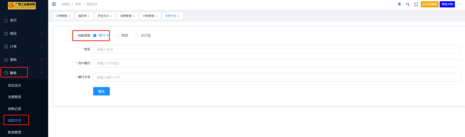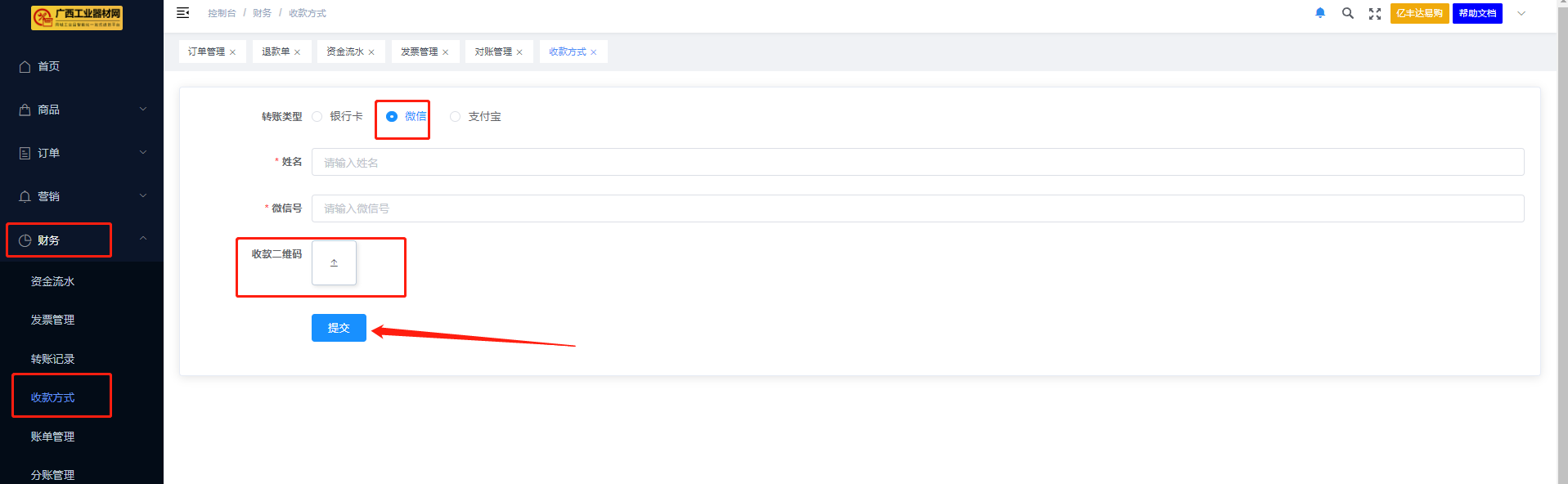 ####位置:财务>收款方式 ####转账类型:选择【银行卡】,输入需要转账人的姓名、开户银行、银行卡号,点击【提交】;  ####转账类型:选择【微信】【支付宝】,输入需要转账人的姓名、微信号、支付宝账号,上传微信/支付宝收款二维码,点击【提交】;