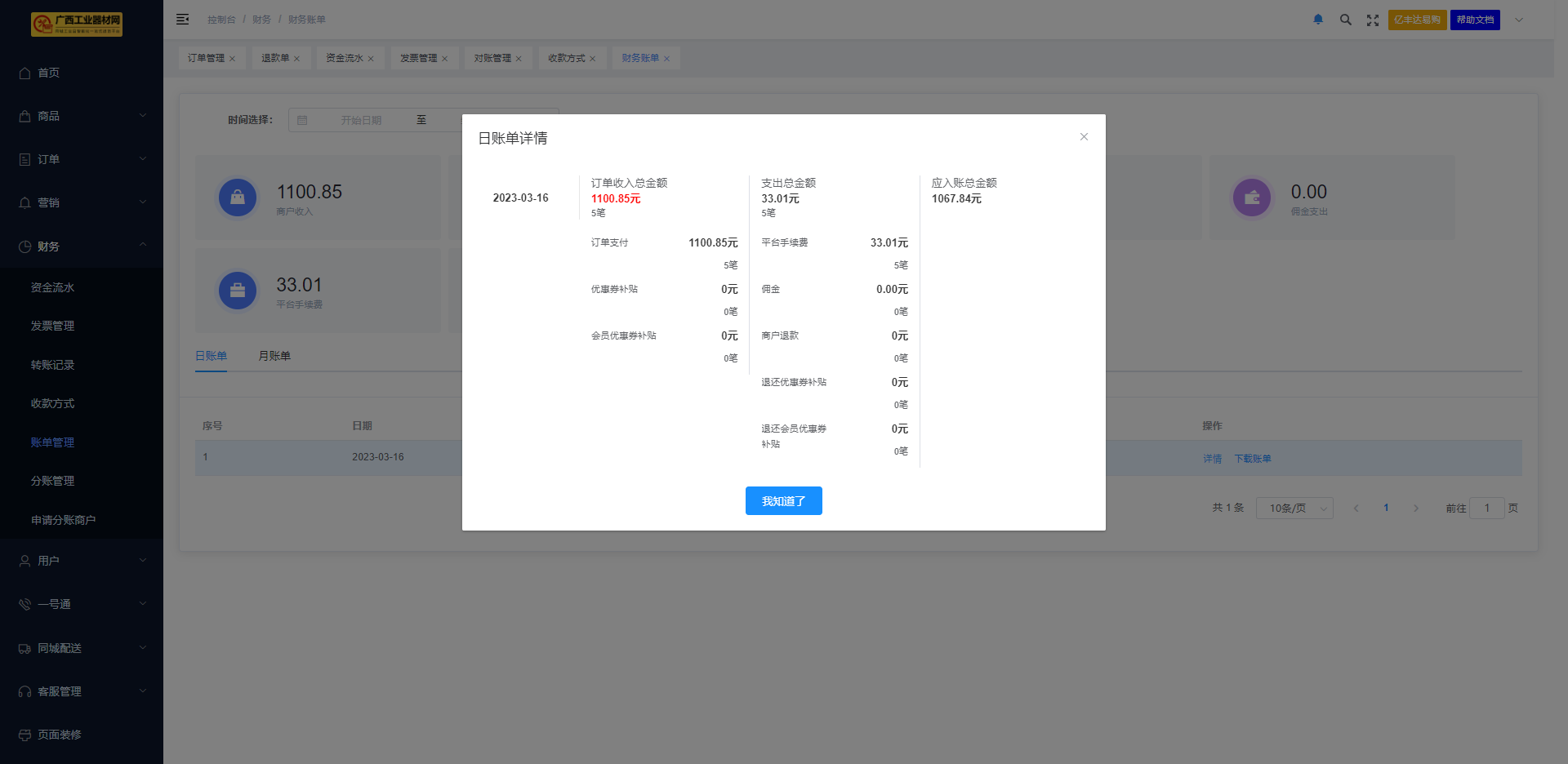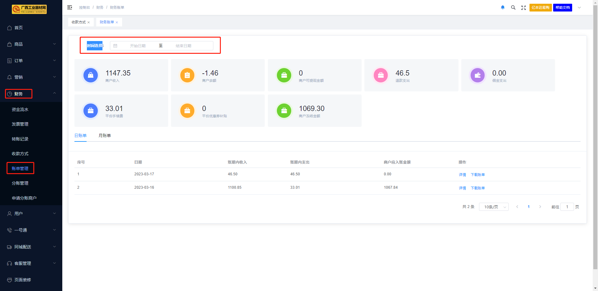 ####位置:财务>账单管理 ####时间选择:选择需查询的时间段; ####下方列表显示整个店铺的收支流水情况,包括:商户收入、退款支出、佣金支出、平台手续费等图表显示; ####列表可按【日报表】【月报表】查询相关报表;  ####报表【操作 】,点击【详情】查看【日账单详情】或【月账单详情】;点击下载账单,则将账单详情以excel表格下载;