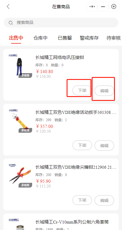 ###位置:手机端>我的>个人中心 (有订单管理权限的客服人员)>商家管理中心>商家管理>在售商品   ###出售中的商品,即为有库存、正在销售的商品,可对出售中的商品进行【下架】【编辑】; ###点击【编辑】系统跳转到【添加商品】页面可对此商品信息进行编辑;