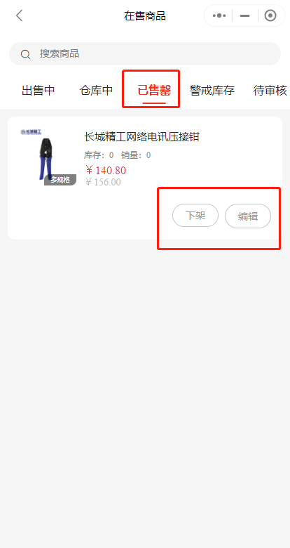###位置:手机端>我的>个人中心 (有订单管理权限的客服人员)>商家管理中心>商家管理>已售馨商品   ###已售馨的商品,即为无库存的商品,可对已售馨的商品进行【下架】【编辑】; ###点击【编辑】系统跳转到【添加商品】页面可对此商品信息进行编辑;