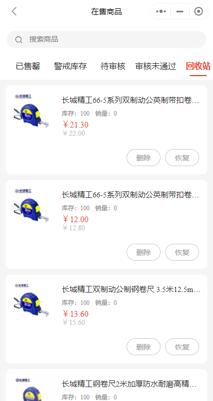 回收站的商品,即为无需上架销售或上架重复或下市的商品放入回收站;可对回收站中的商品进行【删除】【恢复】; 点击【删除】该商品则永久删除无法恢复; 点击【恢复】对该商品恢复到库存中,可对该商品进行上架销售;