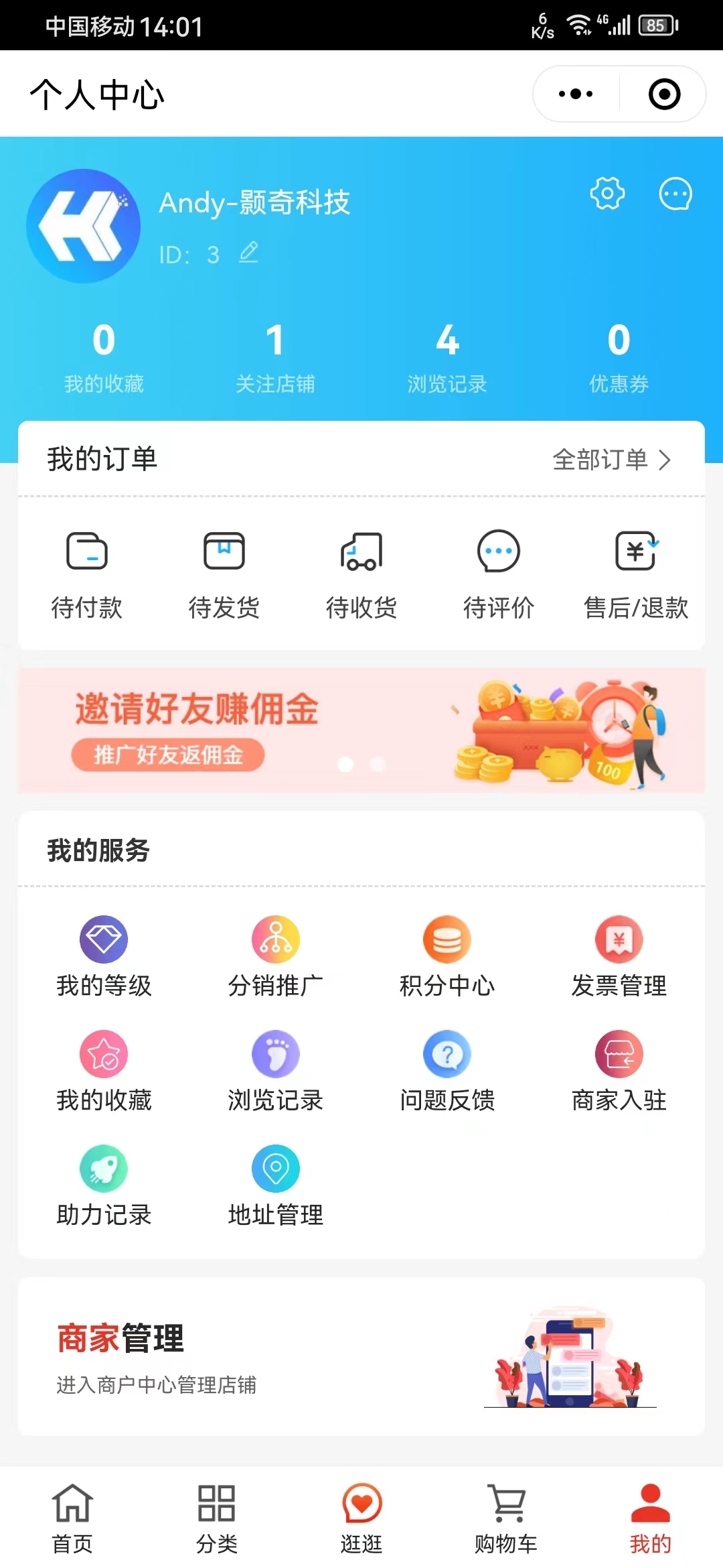 7、按上述流程设置完成后即可使用,若没有看到有【商家管理】按钮,可能是因为该手机号此前已经单独注册并绑定过,可以点击头像切换账户即可