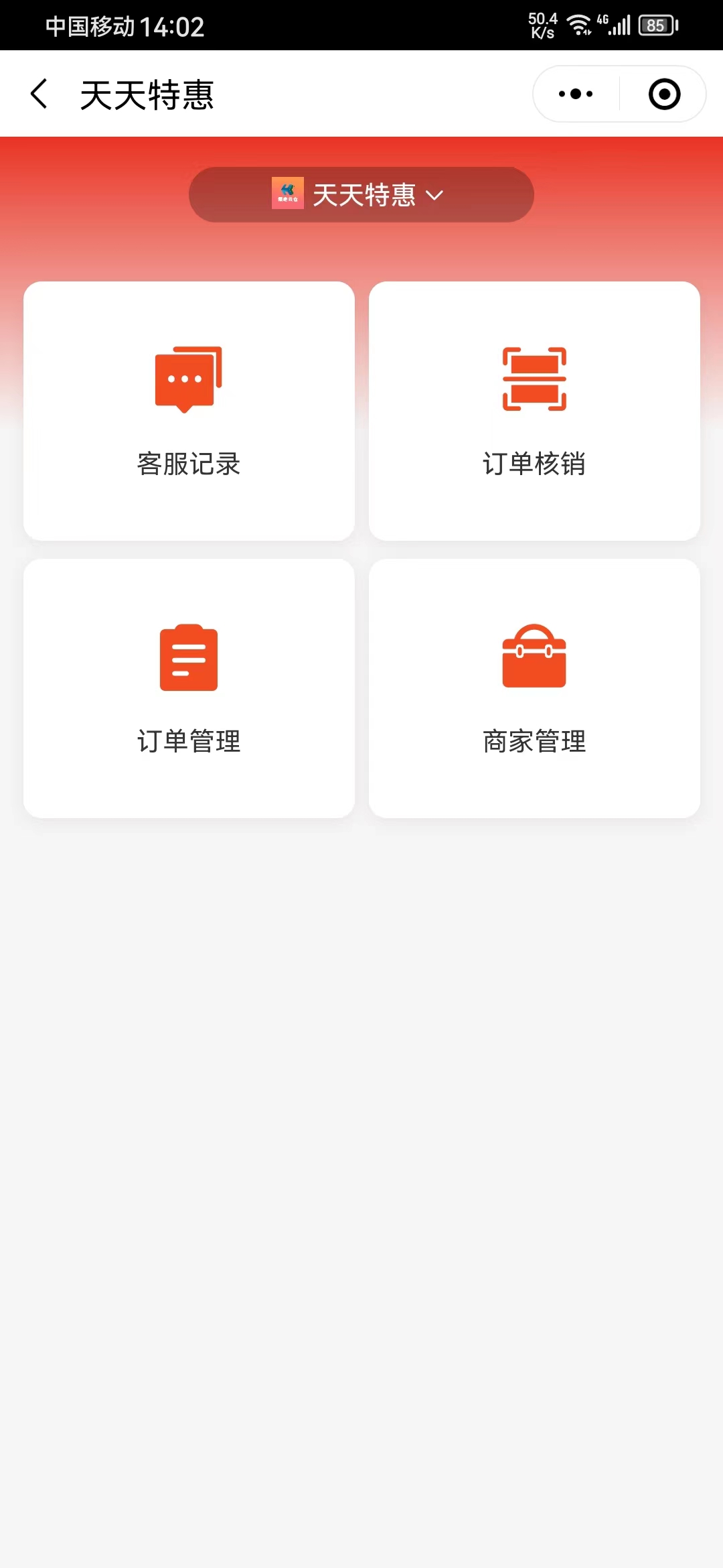 门店管理功能分为客服记录、订单核销、订单管理、商家管理,门店主账号可以通过门店的权限设置员工可使用的功能