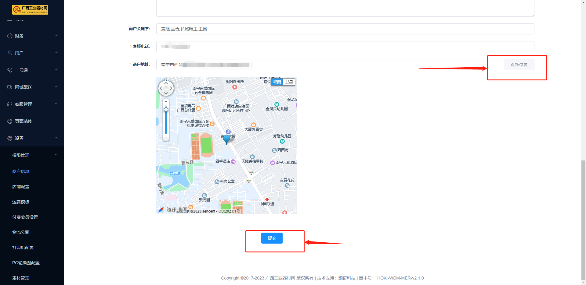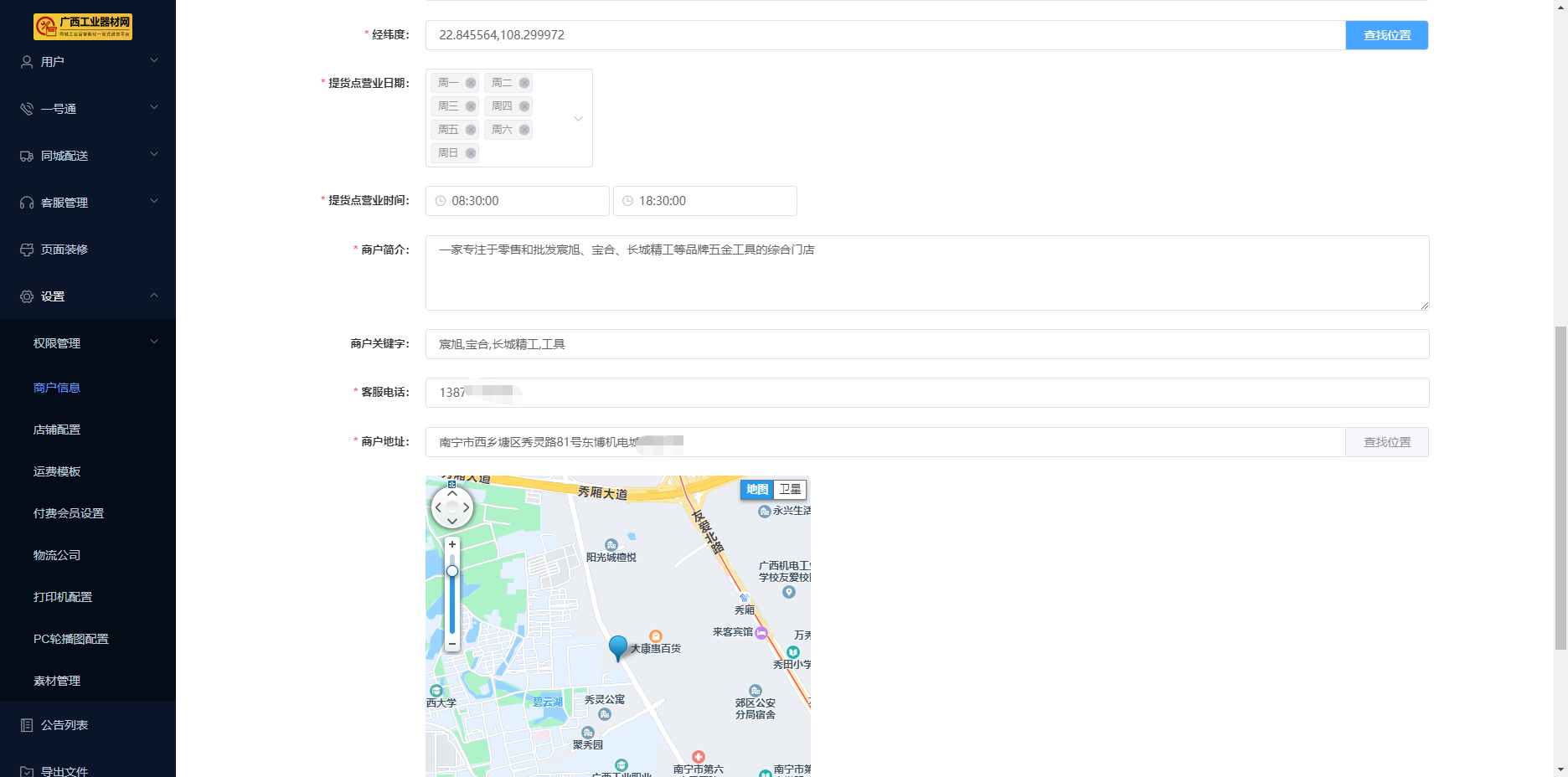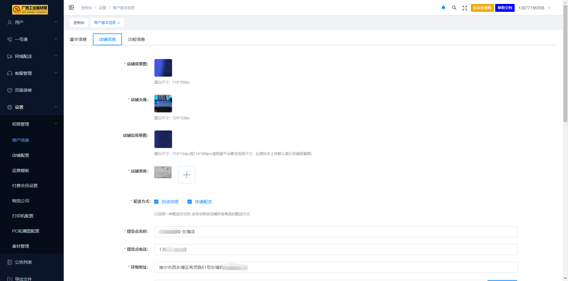 ####点击页面侧边栏,【设置】 - 【商户信息】.【店铺信息】 #####1)店铺背景图:建议使用尺寸为:710*200px,该背景图在平台手机端的【店铺街】店铺头像同时展示。  #####2)店铺头像:建议使用尺寸为:120*120px,建议使用本店铺的门头照,该头像在平台【店铺街】首页推荐位置展示。  #####3)店铺街背景图:建议尺寸:710*134px或710*460px(请根据平台要求选择尺寸,此图如未上传默认展示店铺背景图) #####4)店铺资质:即上传营业执照。 #####5)配送方式:【到店自提】、【快递配送】。 ```json 勾选【到店自提】,就必须填写下列的信息:【提货点名称】、【提货点电话】、【详细地址】、【经纬度】、【提货点营业日期】、【提货点营业时间】;【快递配送】无需填写。 ```  ```json 举例: 【经纬度】点击右侧【查找位置】,在弹窗搜索栏输入“东博生活驿站”,选择好位置,弹窗右侧点“X”,完成经纬度的设置。 ```  #####6)商户简介:填写商户的企业介绍、主营产品介绍 #####7)商户关键字:填写主营业产品的关键字,如:长城精工、正泰、工具等 #####8)客服电话:填写购买用户能够联系到商户的联系电话。  #####9)商户地址:填写商户经营地址,并点击【查找位置】选择具体位置定位,点击【提交】,完成店铺信息的设置。