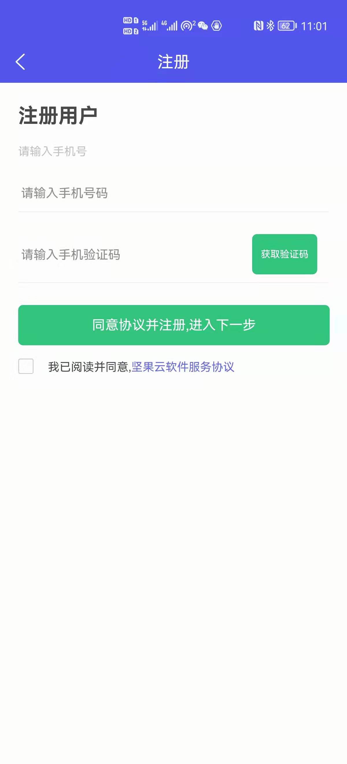 第三步 在收到短信验证码后,输入至第二行空白栏内,【请输入手机验证码】,然后勾选(我已阅读并同意,龙州坚果软件服务协议),点击按钮,即可成功注册。