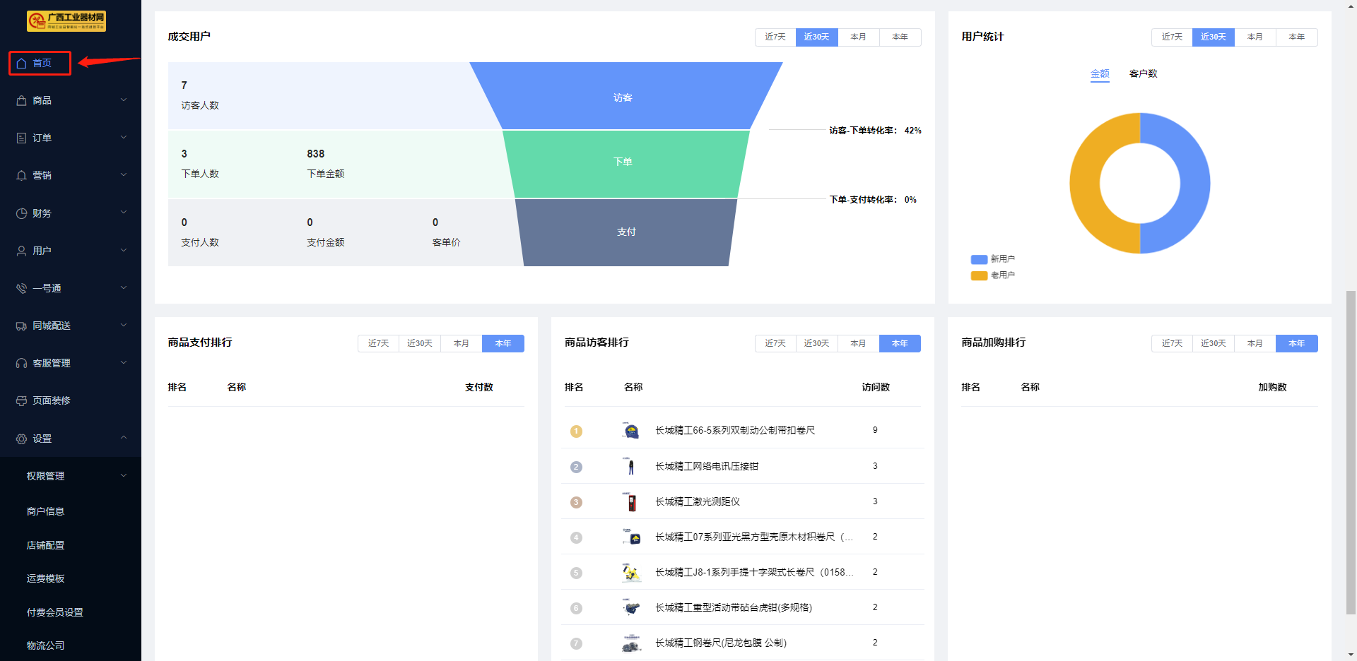 ####点击页面侧边工具栏,首页>控制台 数据统计功能可以实时查看到店铺核心数据,如订单量、收入情况、商品销售情况、会员消费情况,并以图表展示,能够时刻掌握到店铺经营变化。   #####1、模块一:【支付金额】 ```json 支付金额:即为今日收到客户支付金额总数; 周环比是指连续2个统计周期(比如连续两周)内量的变化比,即:环比=(本周数-上周数)/上周数×100% 昨日数据,即为昨天收到支付金额总数。 ``` #####2、模块二:【支付人数】 ```json 支付人数:即为今日收到支付金额的客户次数; 周环比是指连续2个统计周期(比如连续两周)内量的变化比,即:环比=(本周数-上周数)/上周数×100% 昨日数据,即为昨天收到支付金额次数; ``` #####3、模块三:【访客】 ```json 访客:即为今日访问店铺的客户次数 周环比是指连续2个统计周期(比如连续两周)内量的变化比,即:环比=(本周数-上周数)/上周数×100% 昨日数据:即为昨天访问店铺的客户次数; ``` #####4、模块四:【关注店铺】 ```json 关注店铺:即为今日关注店铺的客户人次; 周环比是指连续2个统计周期(比如连续两周)内量的变化比,即:环比=(本周数-上周数)/上周数×100% 昨日数据,即为昨天关注店铺的客户人次; ``` #####5、模块五:【支付订单】 ```json 在图表右侧上方点击【近7天、近30天、本月、本年】选择所要查询时间段内的交易订单数、支付人数、支付金额的数据透视图列表; ``` #####6、模块六:【成交用户】 ```json 在图表右侧上方点击【近7天、近30天、本月、本年】选择所要查询时间段内的成交用户数据的分析; 访客:选择所查询时间段内的访客人数总次数,访客下单转化率 下单:选择所查询时间段内的下单人数总次数、下单金额总金额,以及下单支付转化率; 支付:选择所查询时间段内的支付人数总次数、支付总金额以及客单价; ``` #####7、模块七:【用户统计】 ```json 在图表右侧上方点击【近7天、近30天、本月、本年】选择所要查询时间段内的新用户、老用户的客户总数据、交易金额; ``` #####8、模块八:【商品支付排行】 ```json 在图表右侧上方点击【近7天、近30天、本月、本年】选择所要查询时间段内的商品成交量的排名数据分析; ``` #####9、模块九:【商品访问排行】 ```json 在图表右侧上方点击【近7天、近30天、本月、本年】选择所要查询时间段内的商品被访问的次数排行,从最高访问次数排名; ``` #####10、模块十:【商品加购排行】 ```json 在图表右侧上方点击【近7天、近30天、本月、本年】选择所要查询时间段内的商品被复购(加购)次数排行,从最高加购次数排名; ```