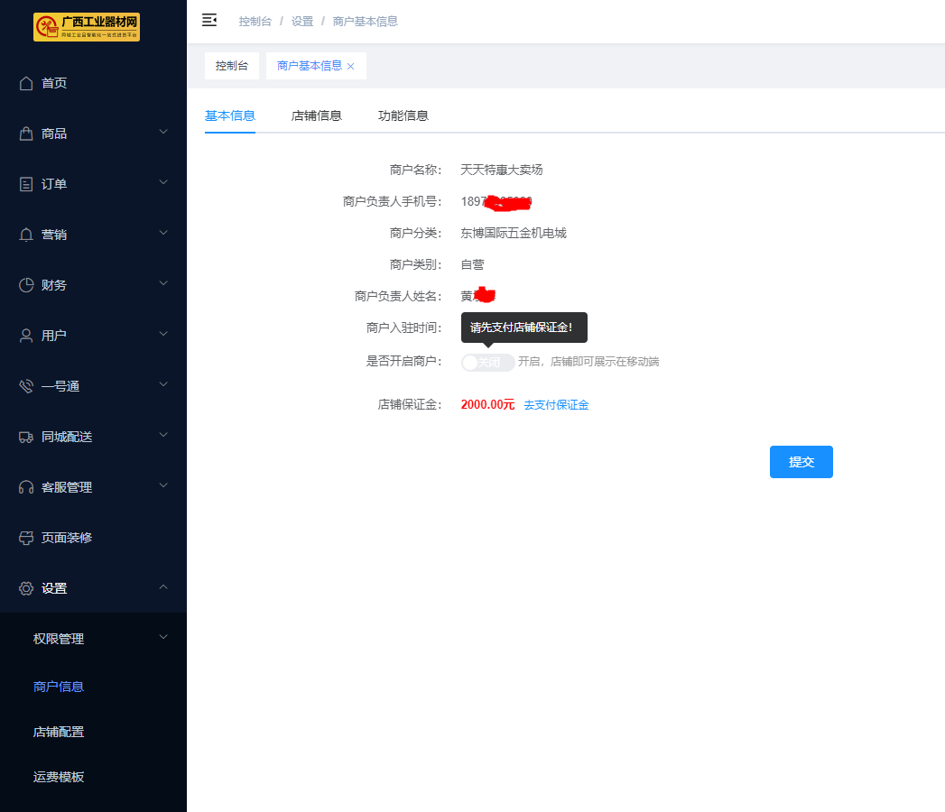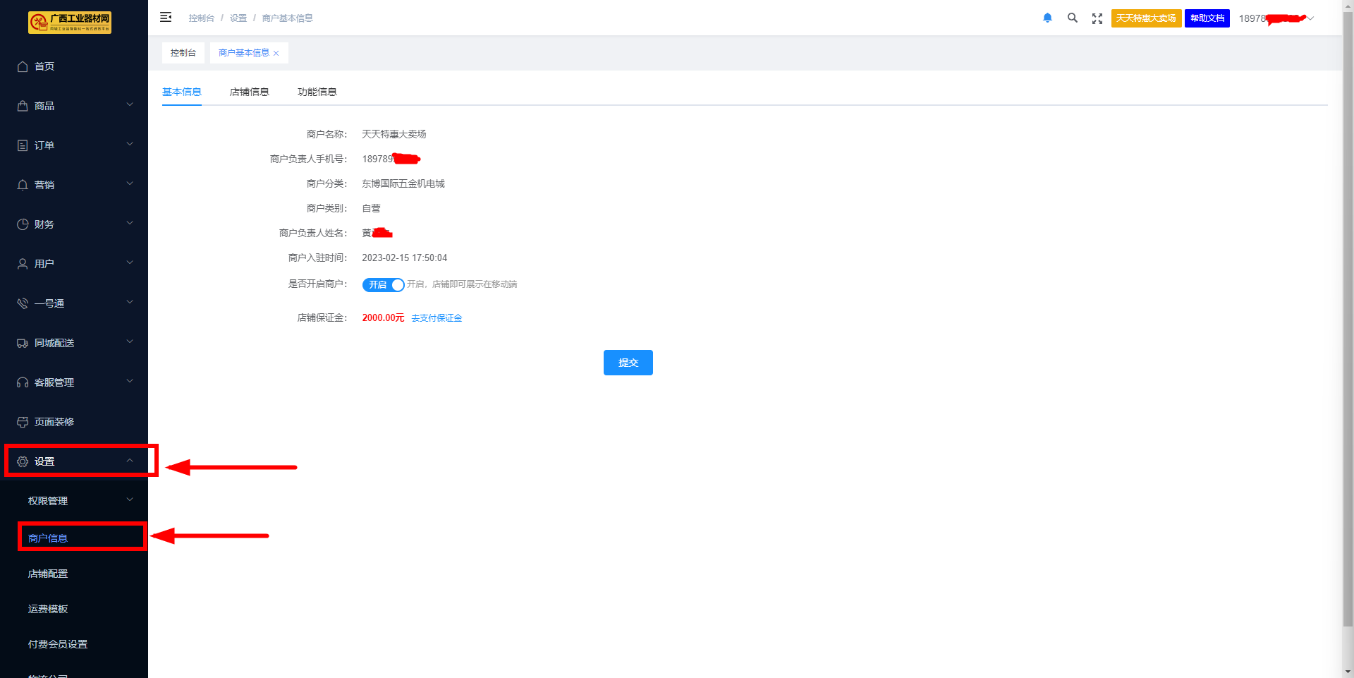 ### 店铺设置 ##### 1、打开浏览器,在网址栏中输入“[s.hoki.info/merchant](http://s.hoki.info/merchant "s.hoki.info/merchant")”进入商户门店管理系统  首次登录时,输入平台下发的登录账号及密码 已经登录过或已经修改过密码的,请使用修改后的账号密码进行登录 > 特别注意 > 使用员工账号登录时,一定要确保该账号拥有配置店铺信息的权限。推荐用主账号进行配置 ------------ ##### 2、成功登录后,点击页面侧边栏,【设置】 - 【商户信息】  ------------ ##### 3、店铺开启按钮默认为关闭状态,需要支付相应的保证金后,方可点击开启。  ##### 4、移动鼠标到蓝色 “去支付保证”上即可获得支付二维码 > 特别提醒 1)未支付保证金的商户无法开启。 2)店铺保证金是平台向门店收取用于该商铺经营过程中履行用户保障及平台规则保障的资金保证。详细内容见商户保证金用途。 3)店铺保证金在门店停止经营后,可申请退回。 4)不同的店铺类型,所需支付的保证金额不同。平台的分为以下几种类型 (1)社区店:指社区/小区周边面向终端客户的五金店为主; (2)专卖店:指在专业五金机电市场(如东博国际五金机电城)开设有实体门店的专业经营门店; (3)旗舰店:指在专业五金机电市场(如东博国际五金机电城)开设有实体门店,且实体门店面积达到要求、有用户到店体验能力的门店; (4)工厂店:指拥有实际生产工厂,进入平台进行厂家直接销售的店铺; (5)品牌自营:指品牌持有方自主通过平台开设店铺向外销售的门店,该门店类型可以没有实际的生产工厂(例如:使用代工生产方式); (6)无实体电商:指没有实体门店、工厂,专业从事互联网销售的线上门店。 5)具体的店铺类型详见《店铺类型说明》。 ##### 5、成功支付保证金后,店铺开启或关闭开关可由门店自由切换。