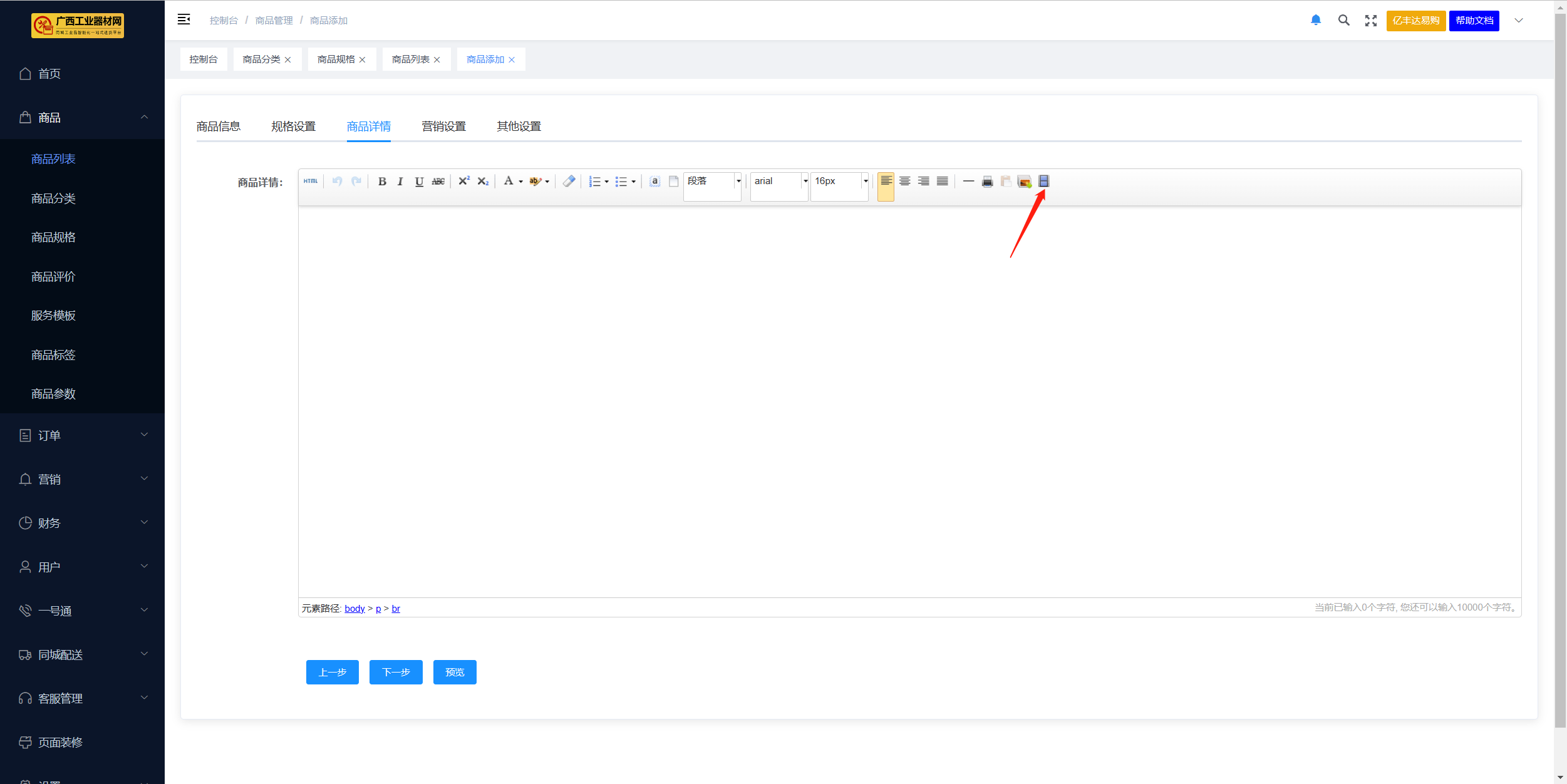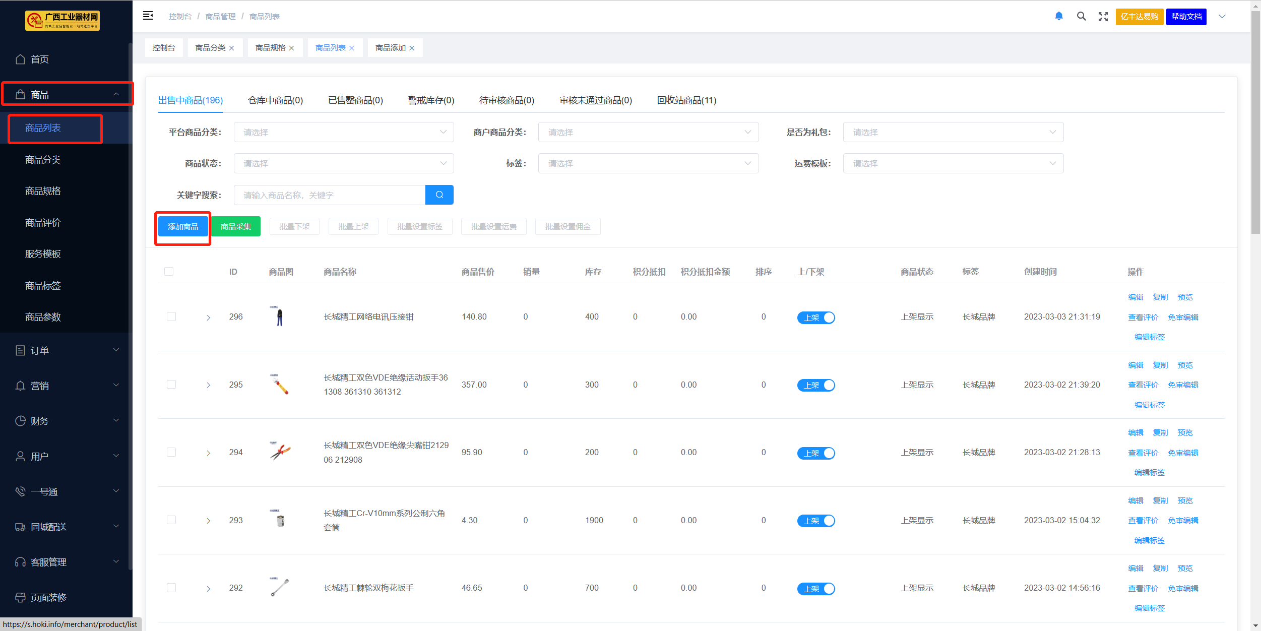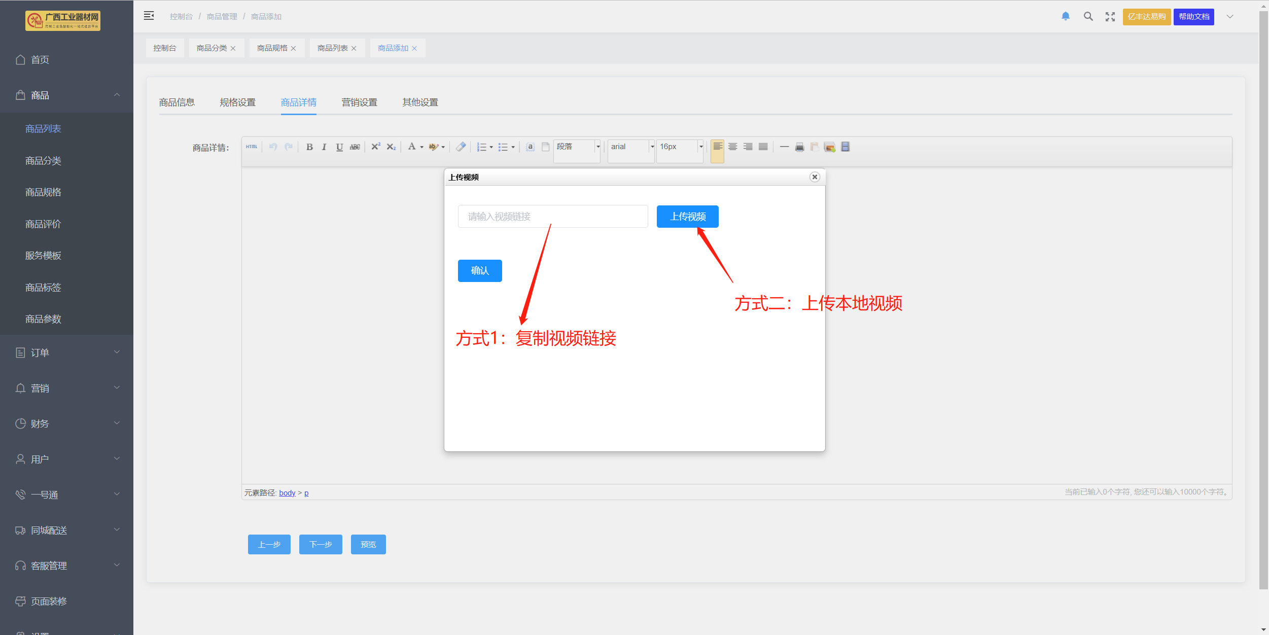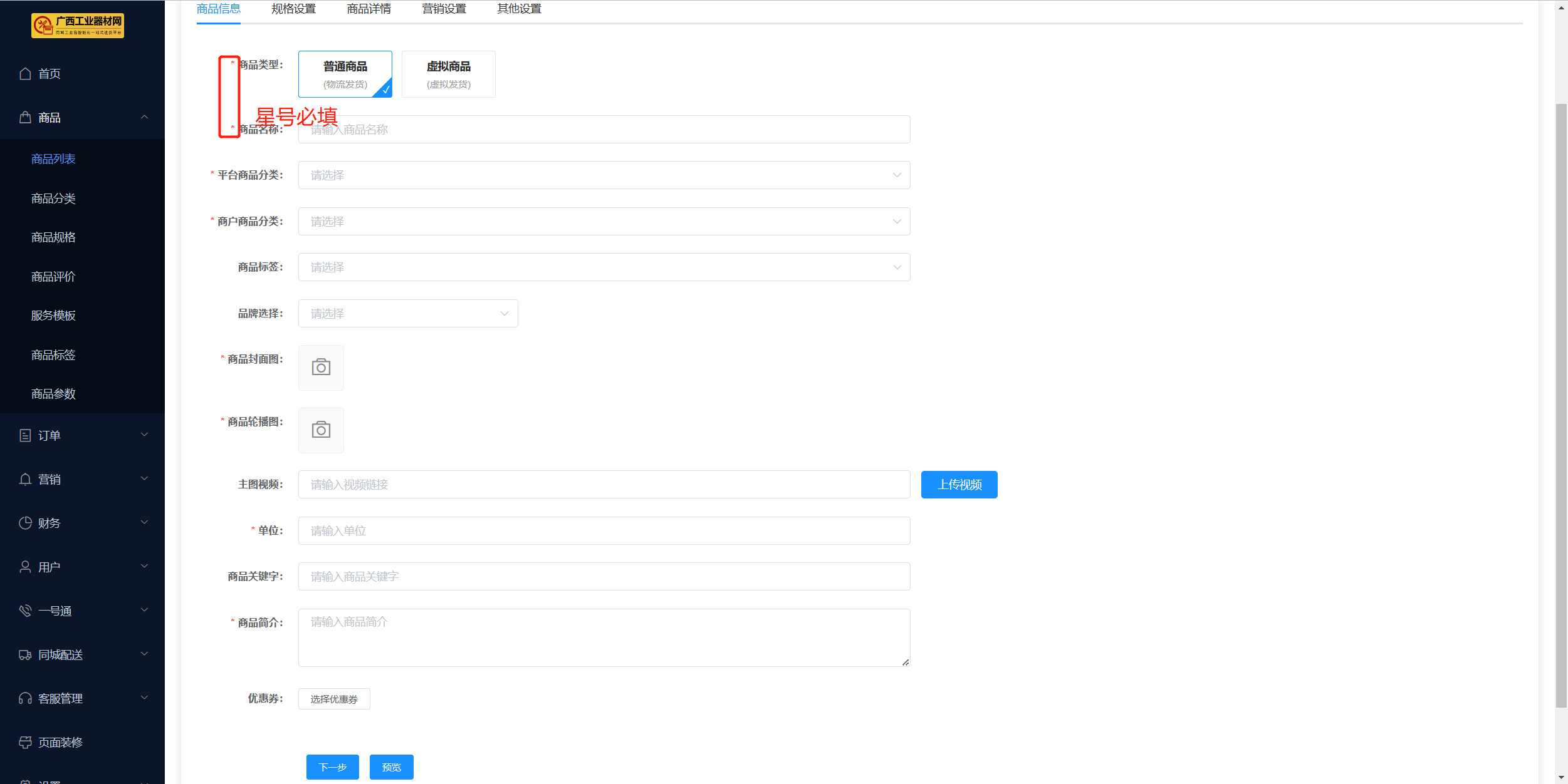 ## 一、功能介绍 商品发布功能是商品模块最基本的功能,也是商城运营第一步。 添加商品之前请先添加平台商品分类,平台品牌分类,商户后台商品分类,以上分类按要求添加完成后,才可顺利添加发布商品。 ## 二、操作流程 位置:商品 > 商品列表 > 添加商品  ### 2.1 添加商品前准备工作 1 . 商品添加为分步添加,带 * 为必填选项 2 . 运费模板提前设置 3 . 优惠券需提前设置,此处添加的优惠券是指购买该商品后会自动赠送的优惠券,所以需提前在【优惠券】下创建 ”赠送优惠券”。 4 . 商品规格可选择单规格与多规格,多规格需要先选择规格模板后才可编辑规格属性  [========] **选择分类注意事项**  ### 2.2 商品规格 #### 1. 商品单规格  #### 2. 商品多规格 (1)首先需要选择规格模板,点击确认后生成相应规格 (2)用户可添加新规格,添加完成后点击立即生成,即可生成表格  ### 2.3商品主视频 请先配置视频上传地址,再在商品添加处上传视频 ### 2.4 商品详情 商品详情可添加文字、图片、视频     ### 2.5 提交前预览商品 商户后台商品编辑、添加页面及列表均可预览商品移动端效果  平台后台商品管理 列表页可预览商品移动端效果  ## 三、后台商品列表展示规则说明 位置:商户后台>商品>商品列表 平台后台>商品>商品管理 上架或下架由商户后台控制,特殊情况,平台可通过强制下架,限制商户商品显示;强制下架后,商品进入审核未通过状态; 显示或关闭由平台后台控制; 平台审核通过的默认为显示;待审核和审核未通过的,平台默认关闭; 以上规则同样适用于秒杀、助力、全款预售、定金预售、拼团活动商品列表的显示。