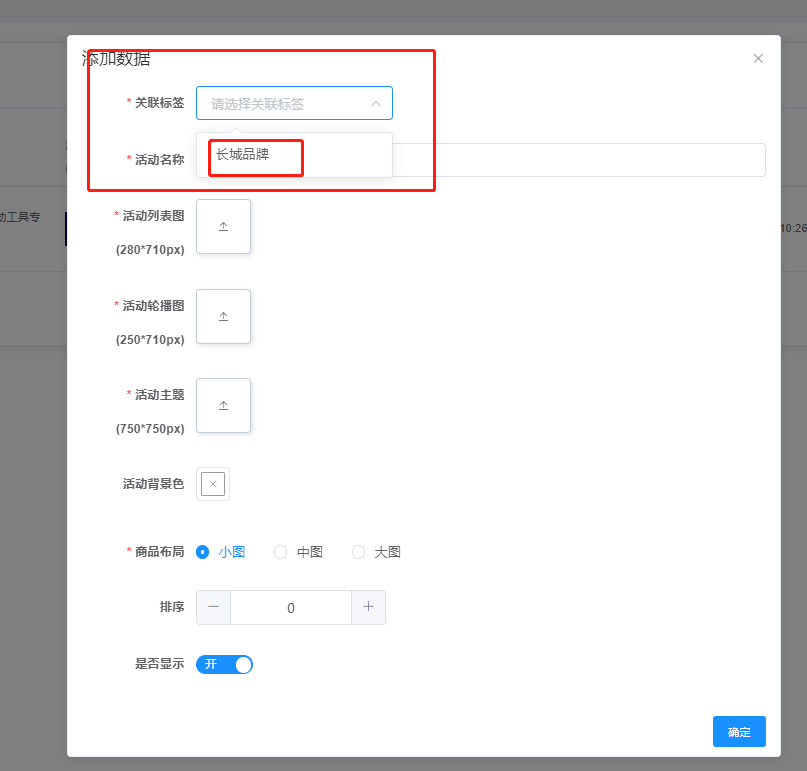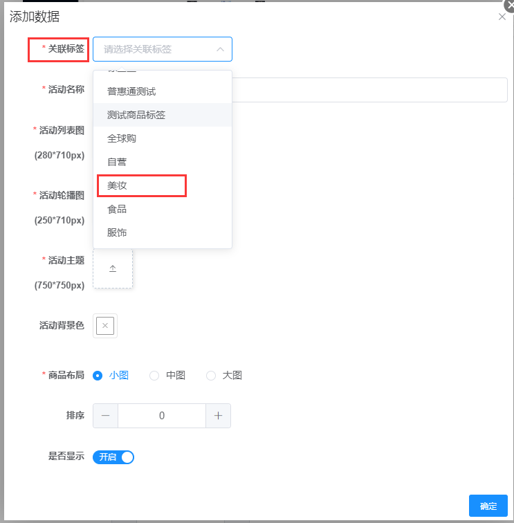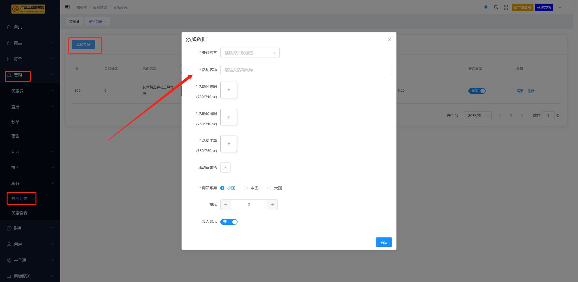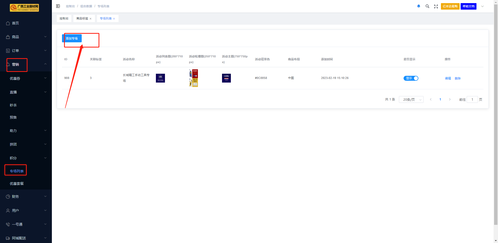 ###位置:营销>专场 ```json 平台和商户都可以分别设置专题活动; 平台专题和商户专题各自独立,平台专题展示在商城首页专题区域;商户专题在店铺详情页右下角【专场】入口 ``` ####添加专题活动方法 ####平台后台 ####第一步:先创建平台商品标签 位置: 商品管理>商品标签  ####第二步:给商品编辑第一步创建的标签 位置:商品管理>商品列表    ####第三步:创建专题,选择第一步创建好的标签。 位置:平台后台<营销<专场列表<添加专场