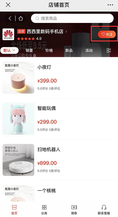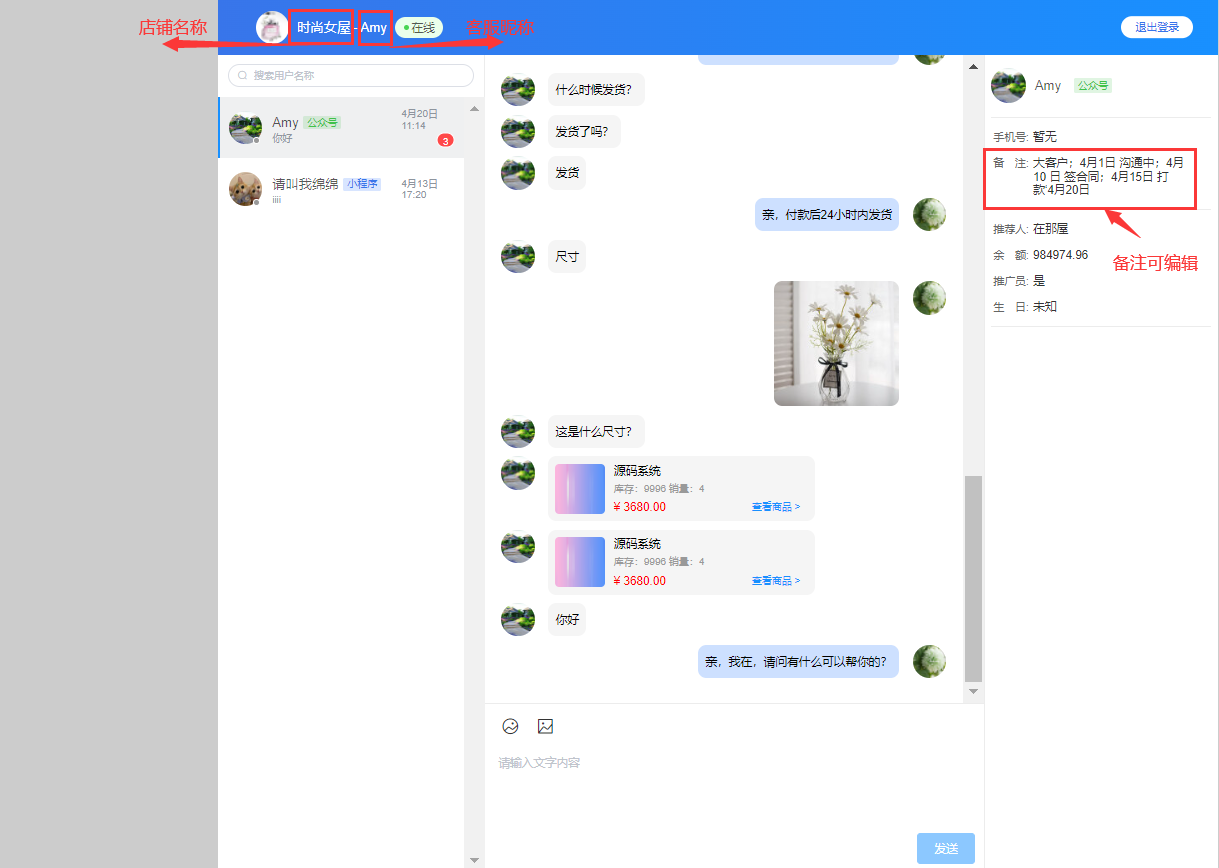 ##添加客服 ###添加商家客服前请先确保用户已关注商城公众号(公众号是您或您的用户将要运营的已认证公众号<服务号> ),并关注对应店铺,之后按如下流程添加客服即可。 ###说明:小程序客服使用的是CRMEB自主开发的客服系统,绑定开放平台可以通过公众号推送消息,不绑定开放平台客服消息不提醒,客服可从移动端或PC管理后台查看消息并回复。 ###移动端客服入口位置:移动端>个人中心>商家管理>客服记录 PC管理后台位置:商户后台>客服管理>进入工作台> ####添加客服流程:比如 添加用户A 为 1号店铺的 客服,请让A 用户先关注你已认证的公众号<服务号> ,再关注商城里的1号店铺,之后在1号店铺的商户后台 添加A用户为客服。 ####第一步:用户关注商城公众号 ####第二步:用户在移动端关注店铺 ####位置:移动端>店铺首页   ####客户记录 #####客服接待分配规则:当用户多时,随机分配给在线客服;如果之前已有交流记录的,优先分配给之前交流过的在线客服。