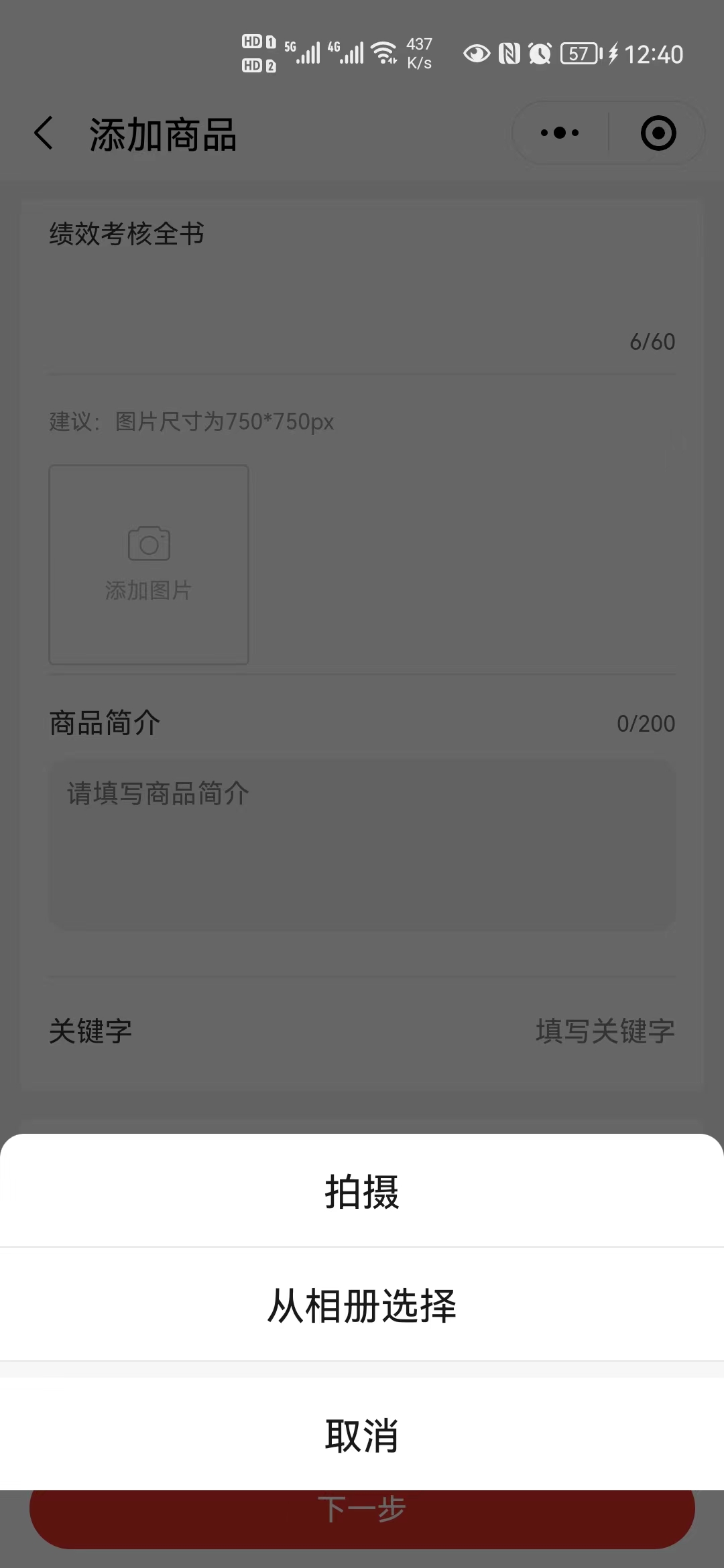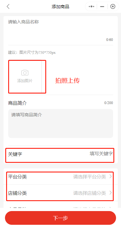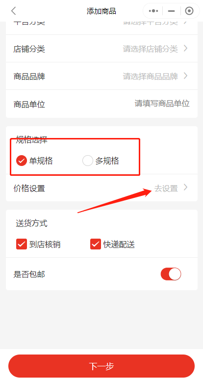 ###位置:手机端>我的>个人中心 (有订单管理权限的客服人员)>商家管理中心>商家管理   ###进入【添加商品】 ```json 输入需要上传的商品名称; 添加图片:可选择直接拍照上传,系统会自动剪切图片尺寸750*750px;或从手机相册选择;最后点击【上传】; 填写商品简介、商品关键字、选择平台分类、店铺分类、商品品牌、商品单位、规格; 送货方式:【到店核销】【快递配送】,是否开启包邮方式; ```     ####价格设置:点击【去设置】,根据弹窗提示填写:售价、成本价、库存等信息;点【保存】,商品添加完成;