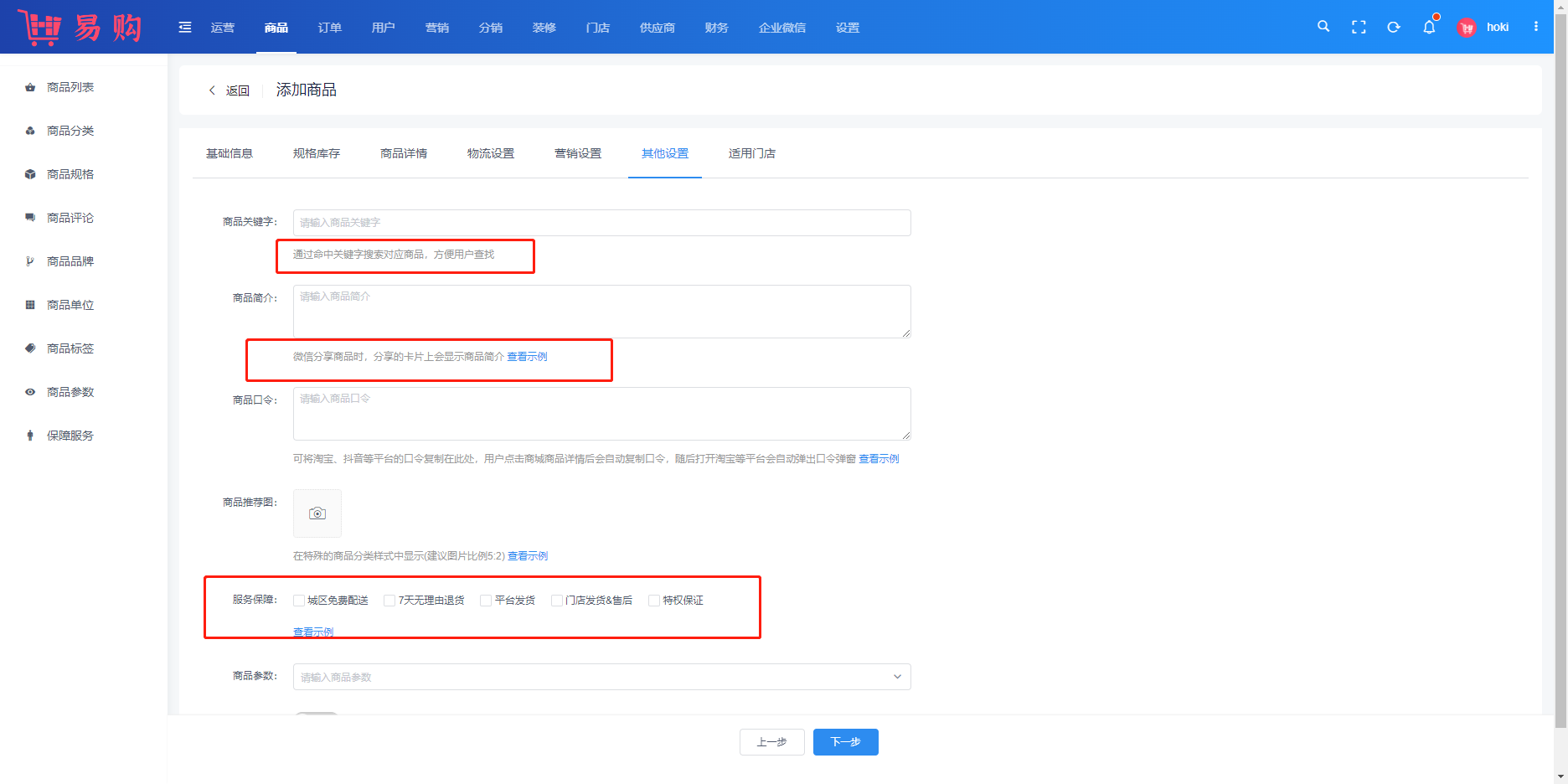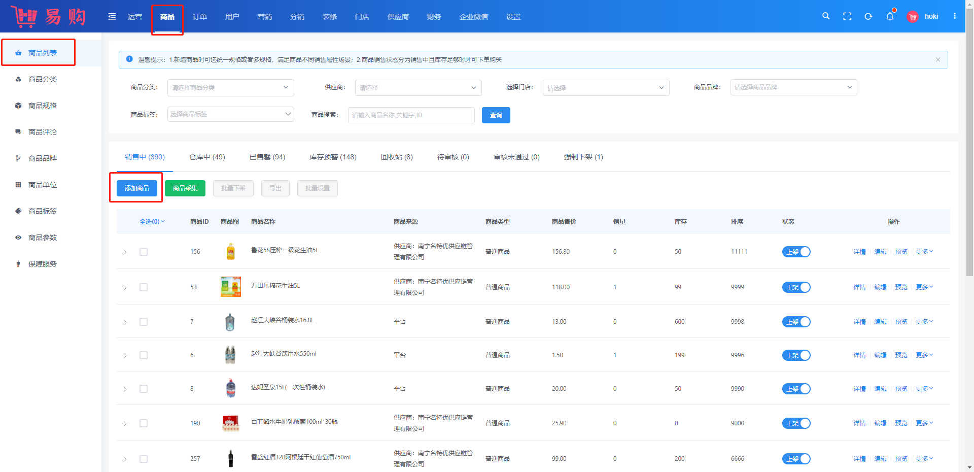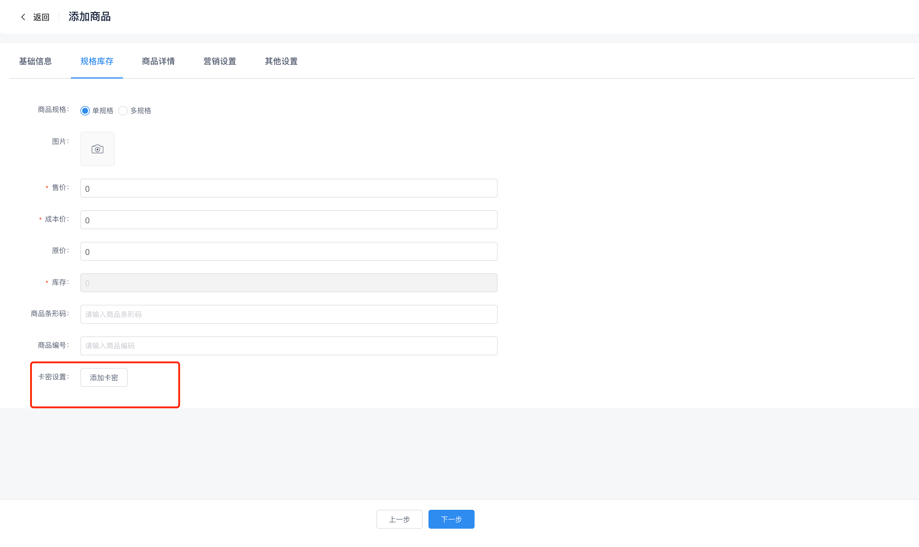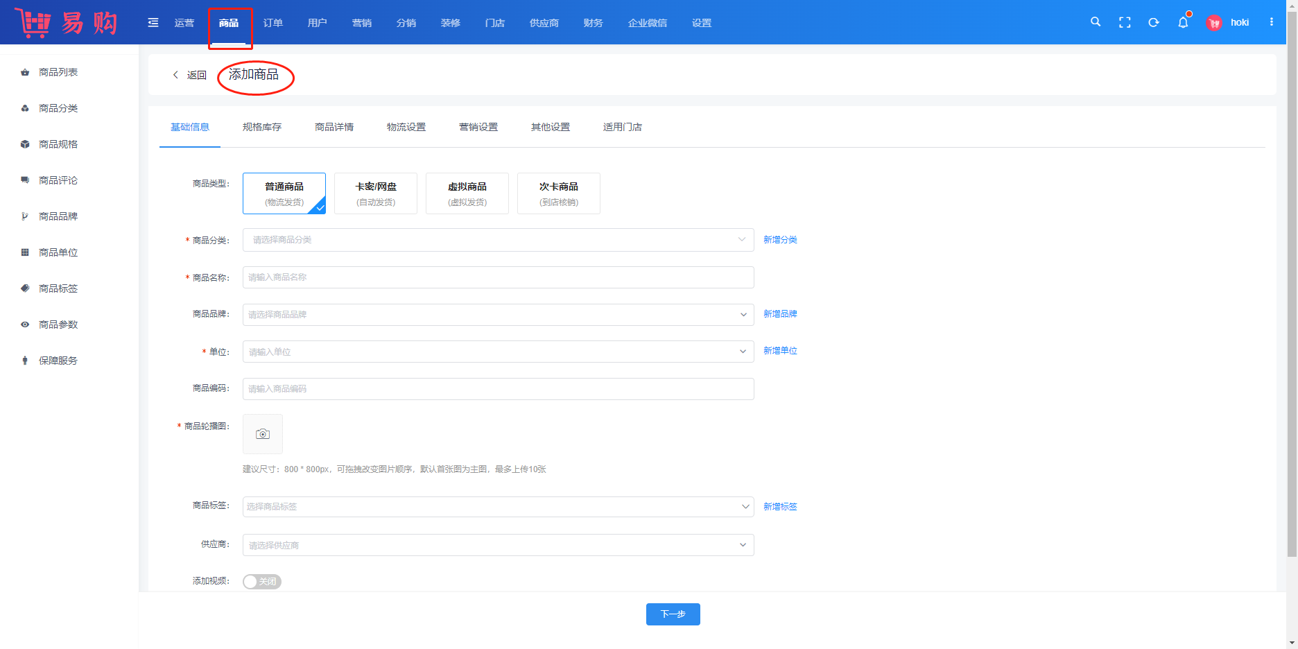 ## 添加商品 #### 一、功能介绍 商品模块是商城的重要模块,商城的运营、活动等均围绕商品展开,添加商品也是运营的第一步 ### 二、操作流程 商品 > 商品列表 > 添加商品  ### 三、功能说明 #### ⚠️ 提前设置 #### 商品分类 商品 > 商品分类 #### 商品规格 商品 > 商品规格 #### 商品运费模板 设置 > 配送设置 > 运费模板 ### 四、普通商品添加 #### 1、商品信息 ```json 商品类型:商品分为普通商品、卡密商品、虚拟商品(虚拟/卡密商品不能加入预售,但可以作为活动商品) 商品分类:选择已有分类或者快捷新增分类 商品名称:名称格式尽量统一,字符数量相差不要过大,因为字符也会影响美观度 商品品牌:选择已有品牌或者快捷新增品牌 单位:选择已有单位或者快捷新增单位 商品编码:方便对接erp系统 商品条码:商品吊牌或标签上的条码,可用于店家扫码搜索商品或扫码加入购物车 商品轮播图:最多可添加10张,图片支持常见格式:jpg、png,单张图片不能超过2M(系统内所有上传图片附件都不能超过2M)。 ``` 主图视频: `外部链接视频:视频连接需要可以直接打开播放,通常以.mp4 结尾` `本地上传视频:本地上传需先配置云储存,不支持直接上传到服务器` 上架设置:分为立即上架、定时上架、放入仓库 定时下架:开启后设置定时下架时间  ####2、规格库存 ①、单规格  ②、多规格  ####3、商品详情 商品详情可添加图片、文字、视频 ⚠️ 注:内容视频与主图视频一样,支持外链视频或本地配置云储存后上传   ####4、物流设置 ```json 物流方式:分为快递与到店核销 运费设置:可设置包邮、固定邮费、运费模板 ```  ####5、营销设置 ```json 虚拟销量:可单个商品设置虚拟销量 赠送积分:用户购买商品后,额外赠送此积分 赠送优惠券:可添加优惠券,用户购买此商品后,会自动赠送 关联用户标签:可多选相关的用户标签,精准营销 付费会员专属:开启后仅付费会员可以看见和购买(开启后不能加入优惠活动) 单独设置:分为佣金设置和付费会员价设置 单独设置佣金 单个商品单独设置返佣金额。商品存在多规格的话,每个规格也可单独设置返佣金额;设置的数字即返佣金额 单独设置付费会员价 单个商品设置付费会员价格,设置后,购买过付费会员的用户,即可用此价格购买商品 预售商品:开启后可设置预售活动时间、发货时间(开启后不能加入优惠活动) 商品推荐:关联相关推荐分类,“精品推荐”、“首发新品”等,开启后该商品推荐至首页对应模块分类下 活动优先级:有默认、拼团、秒杀、砍价四种,最左侧的活动标签优先显示,可拖拽给活动排序 选择优品推荐商品 ```  ####6、其他设置 ```json 商品关键字:多个关键字用英文逗号分开,关键字会影响用户前台搜索商品排名 商品简介:商品简介需简洁明了,字数适中 商品口令:可添加淘宝/抖音等商品口令,添加之后用户可以在移动端复制口令,进入对应的APP弹出口令对应商品 商品推荐图:非必填,若商品列表页需要有大图展示时,可设置此图替代商品封面图 自定义留言:用户可在下单页面填写所设置的相关信息,其中包括邮件、数字、日期、时间、手机号、身份证号、文本框、图片,灵活度较高 ```  ####7、适用门店 可选择将商品同步到哪些门店使用,选择“仅平台适用“则商品不同步任何门店  ###五、卡密商品添加(仅说明区别于普通商品之处) ####1、规格设置 在单规格中可添加卡密  添加卡密  ####2、其他设置 卡密商品和虚拟商品都可以设置不支持退款  ###六、次卡商品添加(仅说明区别于普通商品之处) 1、规格设置 在单规格中添加核销次数、时间设置