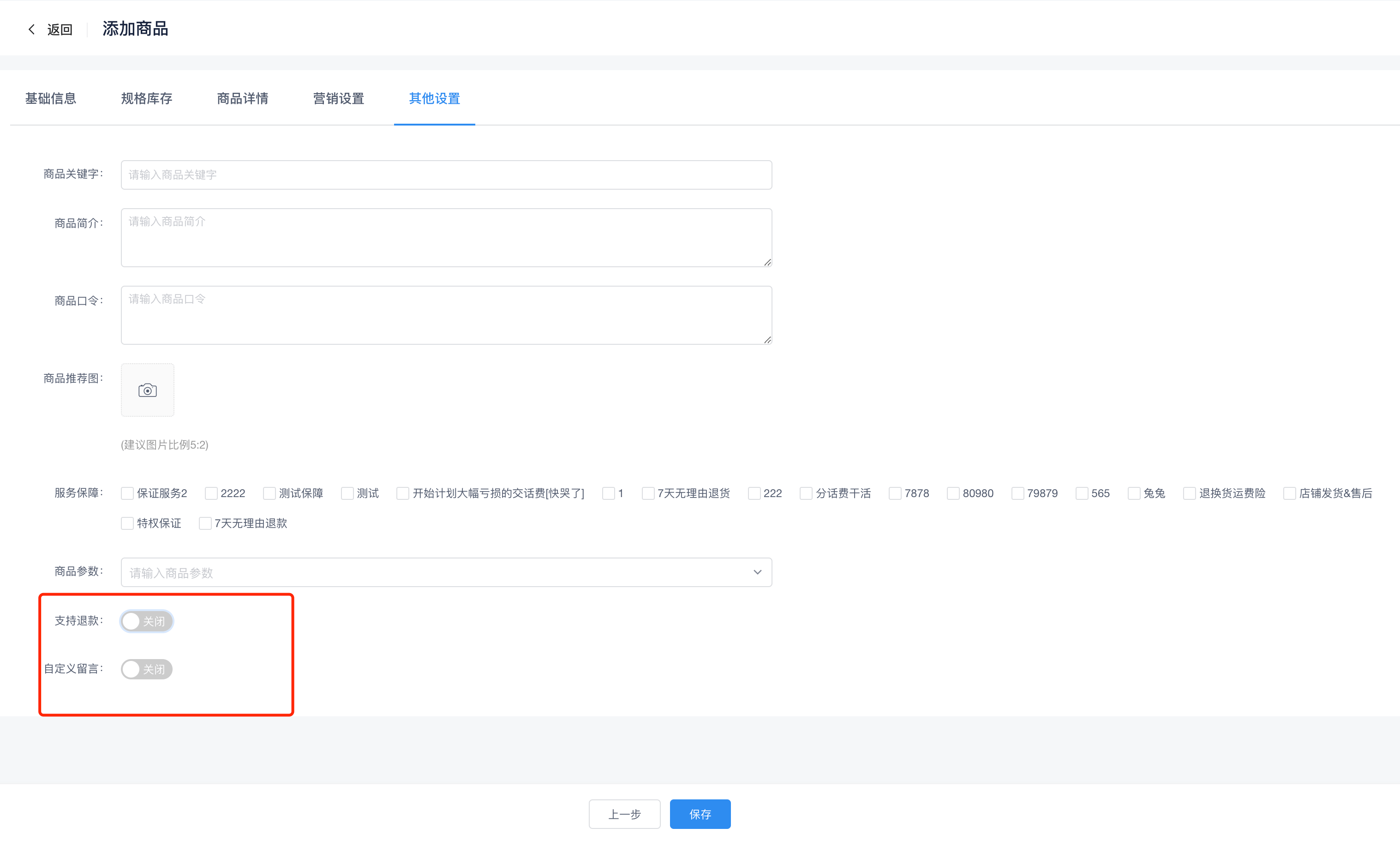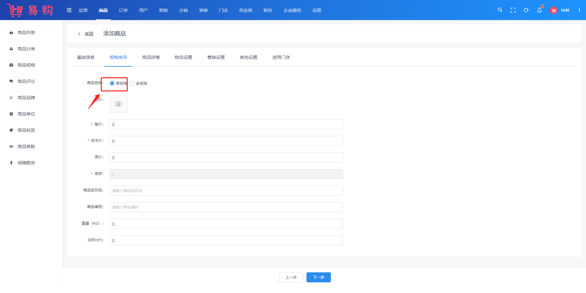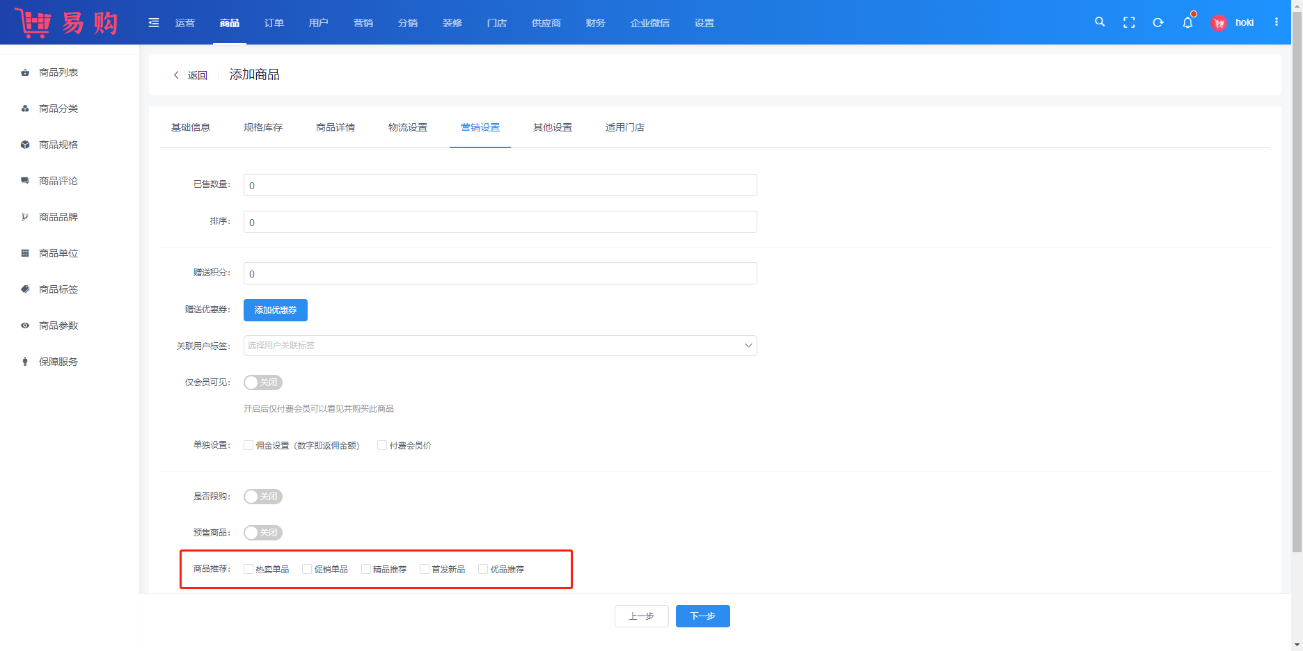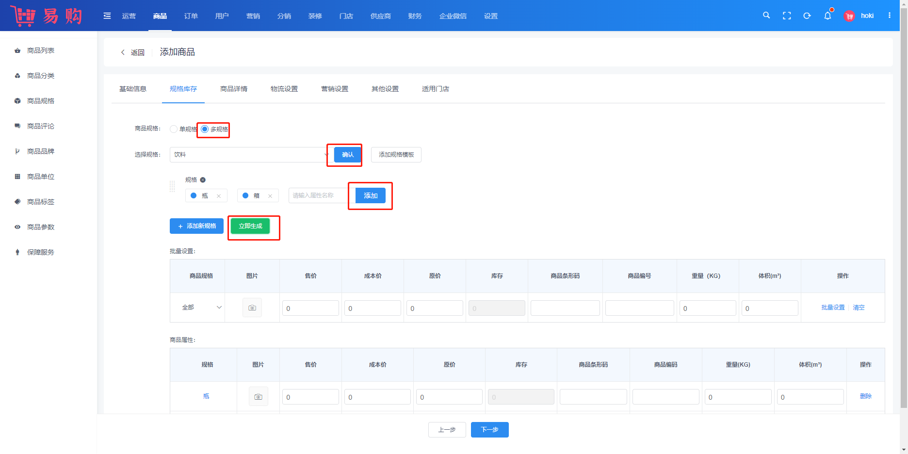 ## 添加商品 #### 一、功能介绍 商品模块是商城的重要模块,商城的运营、活动等均围绕商品展开,添加商品也是运营的第一步 ### 二、操作流程 商品 > 商品列表 > 添加商品  ### 三、功能说明 #### ⚠️ 提前设置 #### 商品分类 商品 > 商品分类 #### 商品规格 商品 > 商品规格 #### 商品运费模板 设置 > 配送设置 > 运费模板 ### 四、普通商品添加 #### 1、商品信息 ```json 商品类型:商品分为普通商品、卡密商品、虚拟商品(虚拟/卡密商品不能加入预售,但可以作为活动商品) 商品分类:选择已有分类或者快捷新增分类 商品名称:名称格式尽量统一,字符数量相差不要过大,因为字符也会影响美观度 商品品牌:选择已有品牌或者快捷新增品牌 单位:选择已有单位或者快捷新增单位 商品编码:方便对接erp系统 商品条码:商品吊牌或标签上的条码,可用于店家扫码搜索商品或扫码加入购物车 商品轮播图:最多可添加10张,图片支持常见格式:jpg、png,单张图片不能超过2M(系统内所有上传图片附件都不能超过2M)。 ``` 主图视频: `外部链接视频:视频连接需要可以直接打开播放,通常以.mp4 结尾` `本地上传视频:本地上传需先配置云储存,不支持直接上传到服务器` 上架设置:分为立即上架、定时上架、放入仓库 定时下架:开启后设置定时下架时间  ####2、规格库存 ①、单规格  ②、多规格  ####3、商品详情 商品详情可添加图片、文字、视频 ⚠️ 注:内容视频与主图视频一样,支持外链视频或本地配置云储存后上传   ####4、物流设置 ```json 物流方式:分为快递与到店核销 运费设置:可设置包邮、固定邮费、运费模板 ```  ####5、营销设置 ```json 虚拟销量:可单个商品设置虚拟销量 赠送积分:用户购买商品后,额外赠送此积分 赠送优惠券:可添加优惠券,用户购买此商品后,会自动赠送 关联用户标签:可多选相关的用户标签,精准营销 付费会员专属:开启后仅付费会员可以看见和购买(开启后不能加入优惠活动) 单独设置:分为佣金设置和付费会员价设置 单独设置佣金 单个商品单独设置返佣金额。商品存在多规格的话,每个规格也可单独设置返佣金额;设置的数字即返佣金额 单独设置付费会员价 单个商品设置付费会员价格,设置后,购买过付费会员的用户,即可用此价格购买商品 预售商品:开启后可设置预售活动时间、发货时间(开启后不能加入优惠活动) 商品推荐:关联相关推荐分类,“精品推荐”、“首发新品”等,开启后该商品推荐至首页对应模块分类下 活动优先级:有默认、拼团、秒杀、砍价四种,最左侧的活动标签优先显示,可拖拽给活动排序 选择优品推荐商品 ```  ####6、其他设置 ```json 商品关键字:多个关键字用英文逗号分开,关键字会影响用户前台搜索商品排名 商品简介:商品简介需简洁明了,字数适中 商品口令:可添加淘宝/抖音等商品口令,添加之后用户可以在移动端复制口令,进入对应的APP弹出口令对应商品 商品推荐图:非必填,若商品列表页需要有大图展示时,可设置此图替代商品封面图 自定义留言:用户可在下单页面填写所设置的相关信息,其中包括邮件、数字、日期、时间、手机号、身份证号、文本框、图片,灵活度较高 ```  ####7、适用门店 可选择将商品同步到哪些门店使用,选择“仅平台适用“则商品不同步任何门店  ###五、卡密商品添加(仅说明区别于普通商品之处) ####1、规格设置 在单规格中可添加卡密  添加卡密  ####2、其他设置 卡密商品和虚拟商品都可以设置不支持退款  ###六、次卡商品添加(仅说明区别于普通商品之处) 1、规格设置 在单规格中添加核销次数、时间设置