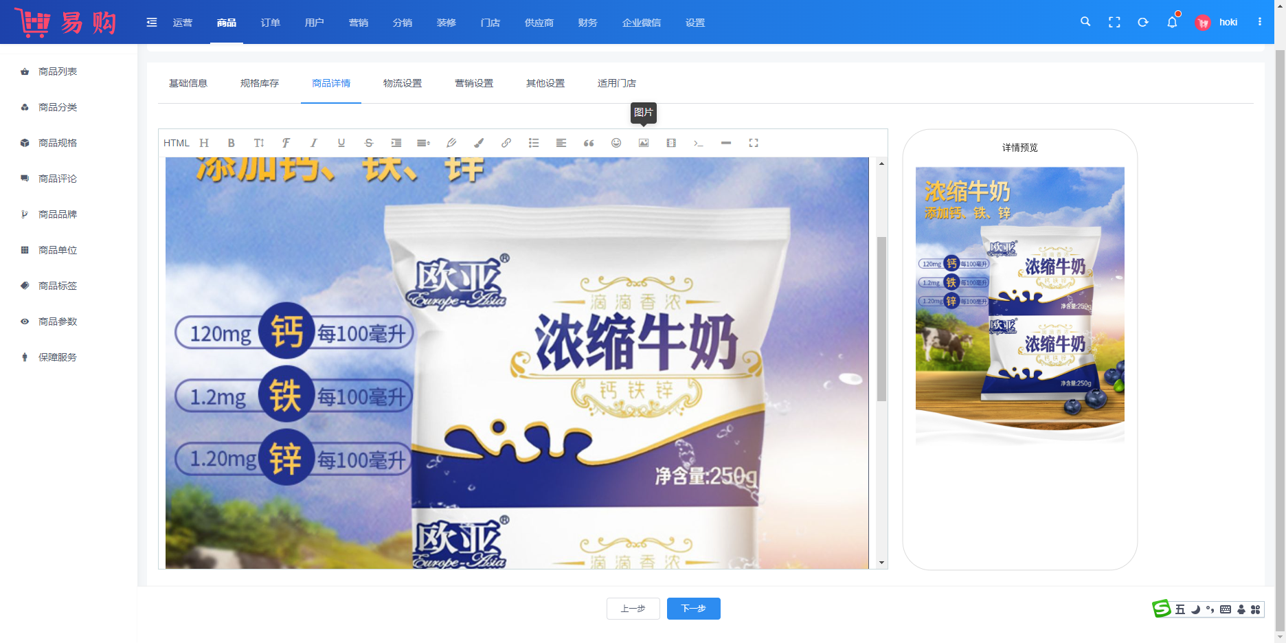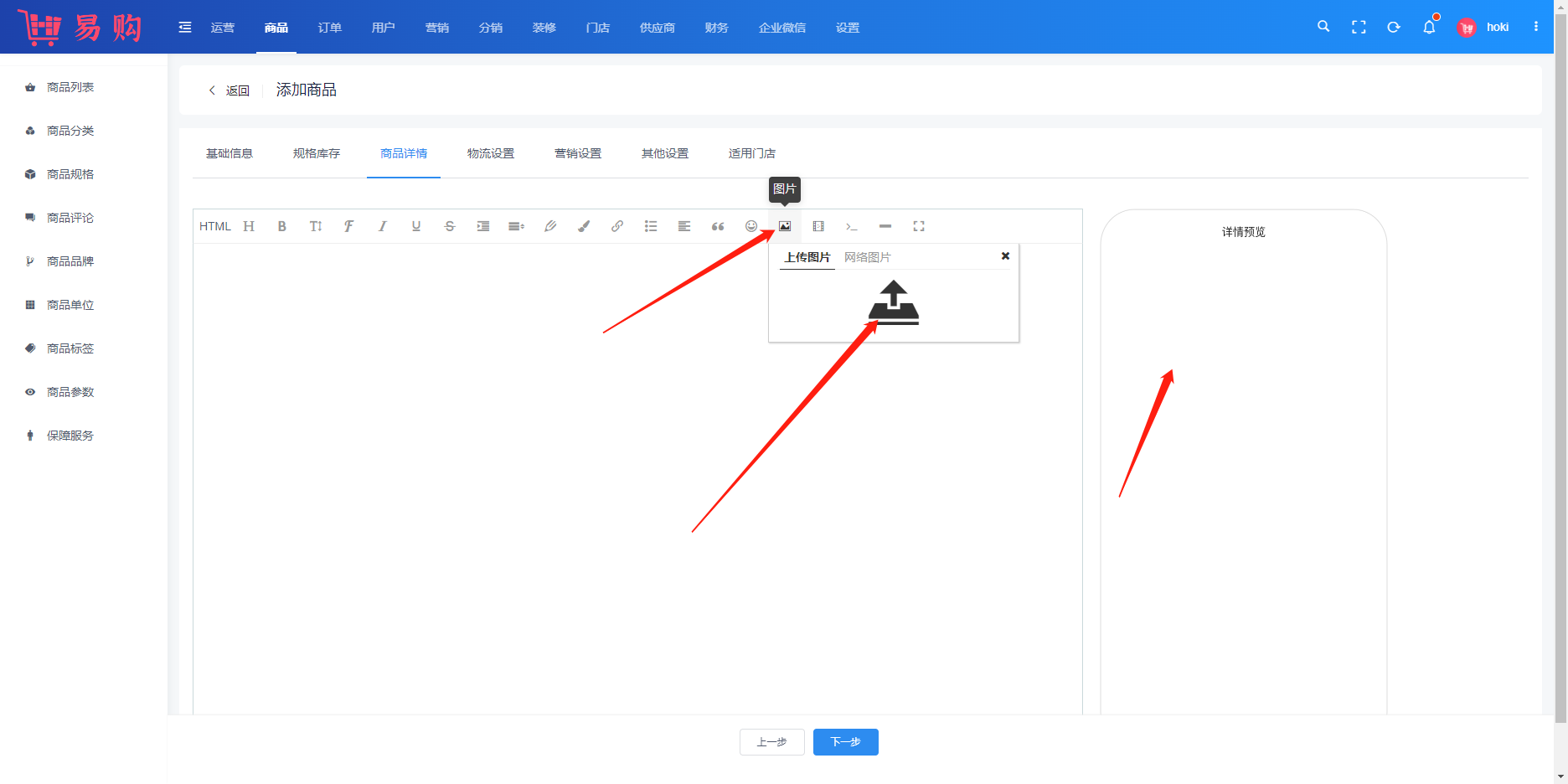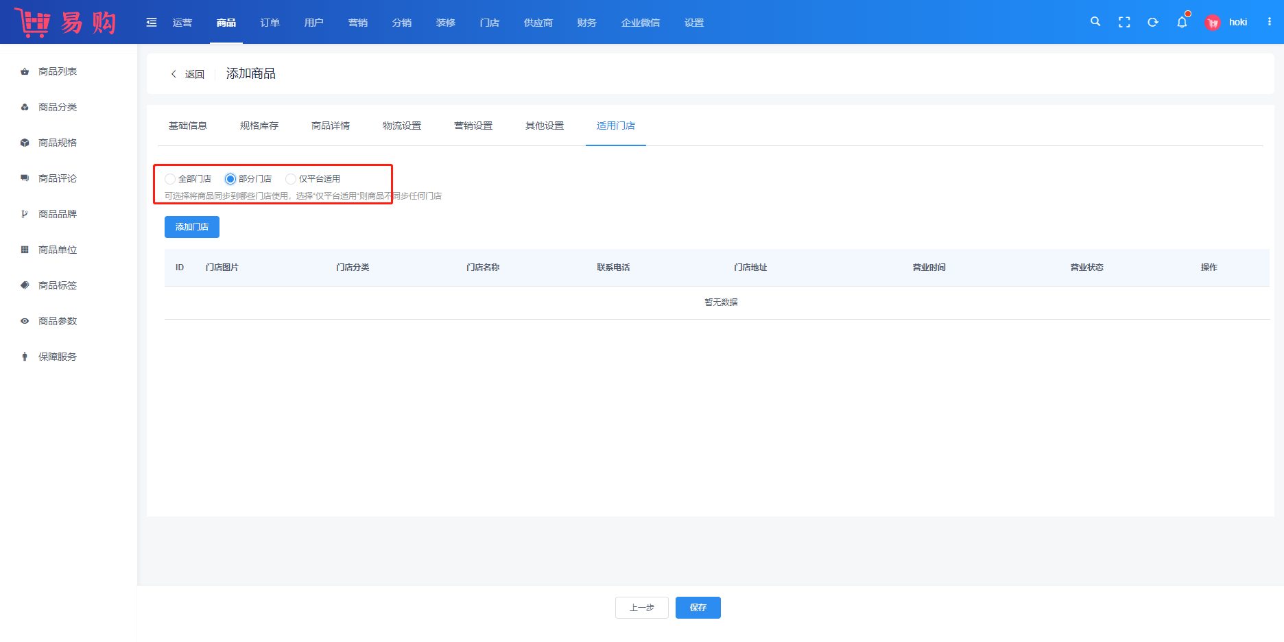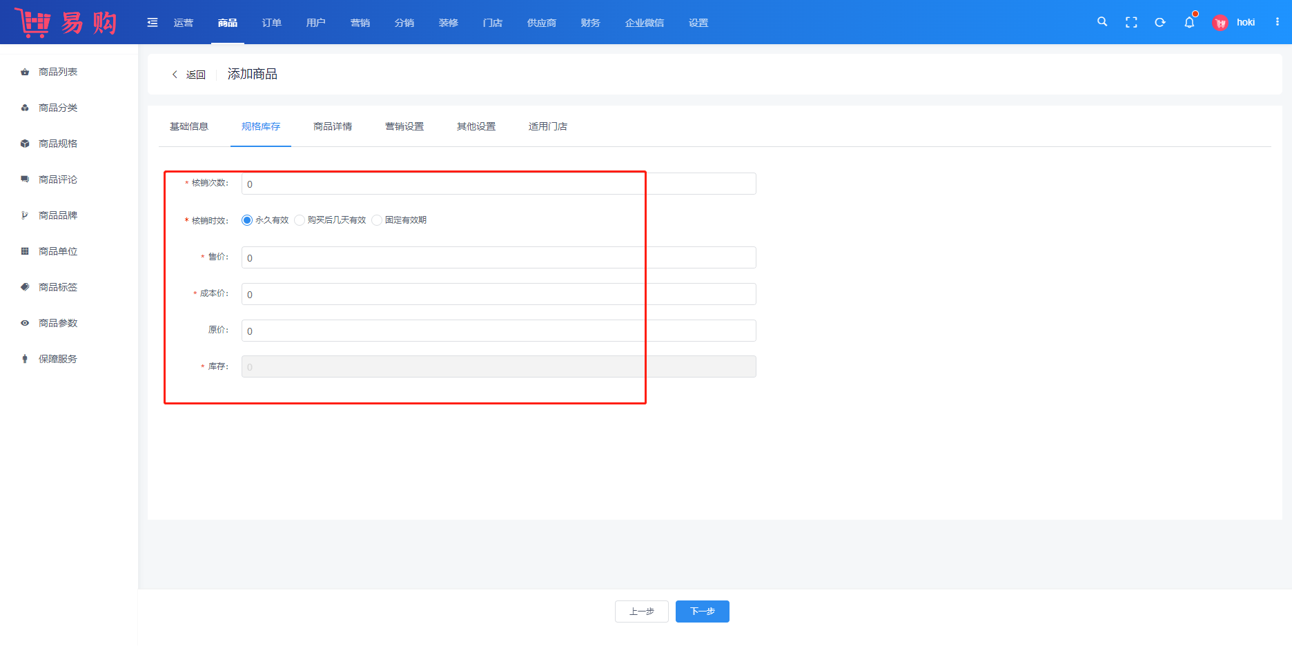 ## 添加商品 #### 一、功能介绍 商品模块是商城的重要模块,商城的运营、活动等均围绕商品展开,添加商品也是运营的第一步 ### 二、操作流程 商品 > 商品列表 > 添加商品  ### 三、功能说明 #### ⚠️ 提前设置 #### 商品分类 商品 > 商品分类 #### 商品规格 商品 > 商品规格 #### 商品运费模板 设置 > 配送设置 > 运费模板 ### 四、普通商品添加 #### 1、商品信息 ```json 商品类型:商品分为普通商品、卡密商品、虚拟商品(虚拟/卡密商品不能加入预售,但可以作为活动商品) 商品分类:选择已有分类或者快捷新增分类 商品名称:名称格式尽量统一,字符数量相差不要过大,因为字符也会影响美观度 商品品牌:选择已有品牌或者快捷新增品牌 单位:选择已有单位或者快捷新增单位 商品编码:方便对接erp系统 商品条码:商品吊牌或标签上的条码,可用于店家扫码搜索商品或扫码加入购物车 商品轮播图:最多可添加10张,图片支持常见格式:jpg、png,单张图片不能超过2M(系统内所有上传图片附件都不能超过2M)。 ``` 主图视频: `外部链接视频:视频连接需要可以直接打开播放,通常以.mp4 结尾` `本地上传视频:本地上传需先配置云储存,不支持直接上传到服务器` 上架设置:分为立即上架、定时上架、放入仓库 定时下架:开启后设置定时下架时间  ####2、规格库存 ①、单规格  ②、多规格  ####3、商品详情 商品详情可添加图片、文字、视频 ⚠️ 注:内容视频与主图视频一样,支持外链视频或本地配置云储存后上传   ####4、物流设置 ```json 物流方式:分为快递与到店核销 运费设置:可设置包邮、固定邮费、运费模板 ```  ####5、营销设置 ```json 虚拟销量:可单个商品设置虚拟销量 赠送积分:用户购买商品后,额外赠送此积分 赠送优惠券:可添加优惠券,用户购买此商品后,会自动赠送 关联用户标签:可多选相关的用户标签,精准营销 付费会员专属:开启后仅付费会员可以看见和购买(开启后不能加入优惠活动) 单独设置:分为佣金设置和付费会员价设置 单独设置佣金 单个商品单独设置返佣金额。商品存在多规格的话,每个规格也可单独设置返佣金额;设置的数字即返佣金额 单独设置付费会员价 单个商品设置付费会员价格,设置后,购买过付费会员的用户,即可用此价格购买商品 预售商品:开启后可设置预售活动时间、发货时间(开启后不能加入优惠活动) 商品推荐:关联相关推荐分类,“精品推荐”、“首发新品”等,开启后该商品推荐至首页对应模块分类下 活动优先级:有默认、拼团、秒杀、砍价四种,最左侧的活动标签优先显示,可拖拽给活动排序 选择优品推荐商品 ```  ####6、其他设置 ```json 商品关键字:多个关键字用英文逗号分开,关键字会影响用户前台搜索商品排名 商品简介:商品简介需简洁明了,字数适中 商品口令:可添加淘宝/抖音等商品口令,添加之后用户可以在移动端复制口令,进入对应的APP弹出口令对应商品 商品推荐图:非必填,若商品列表页需要有大图展示时,可设置此图替代商品封面图 自定义留言:用户可在下单页面填写所设置的相关信息,其中包括邮件、数字、日期、时间、手机号、身份证号、文本框、图片,灵活度较高 ```  ####7、适用门店 可选择将商品同步到哪些门店使用,选择“仅平台适用“则商品不同步任何门店  ###五、卡密商品添加(仅说明区别于普通商品之处) ####1、规格设置 在单规格中可添加卡密  添加卡密  ####2、其他设置 卡密商品和虚拟商品都可以设置不支持退款  ###六、次卡商品添加(仅说明区别于普通商品之处) 1、规格设置 在单规格中添加核销次数、时间设置