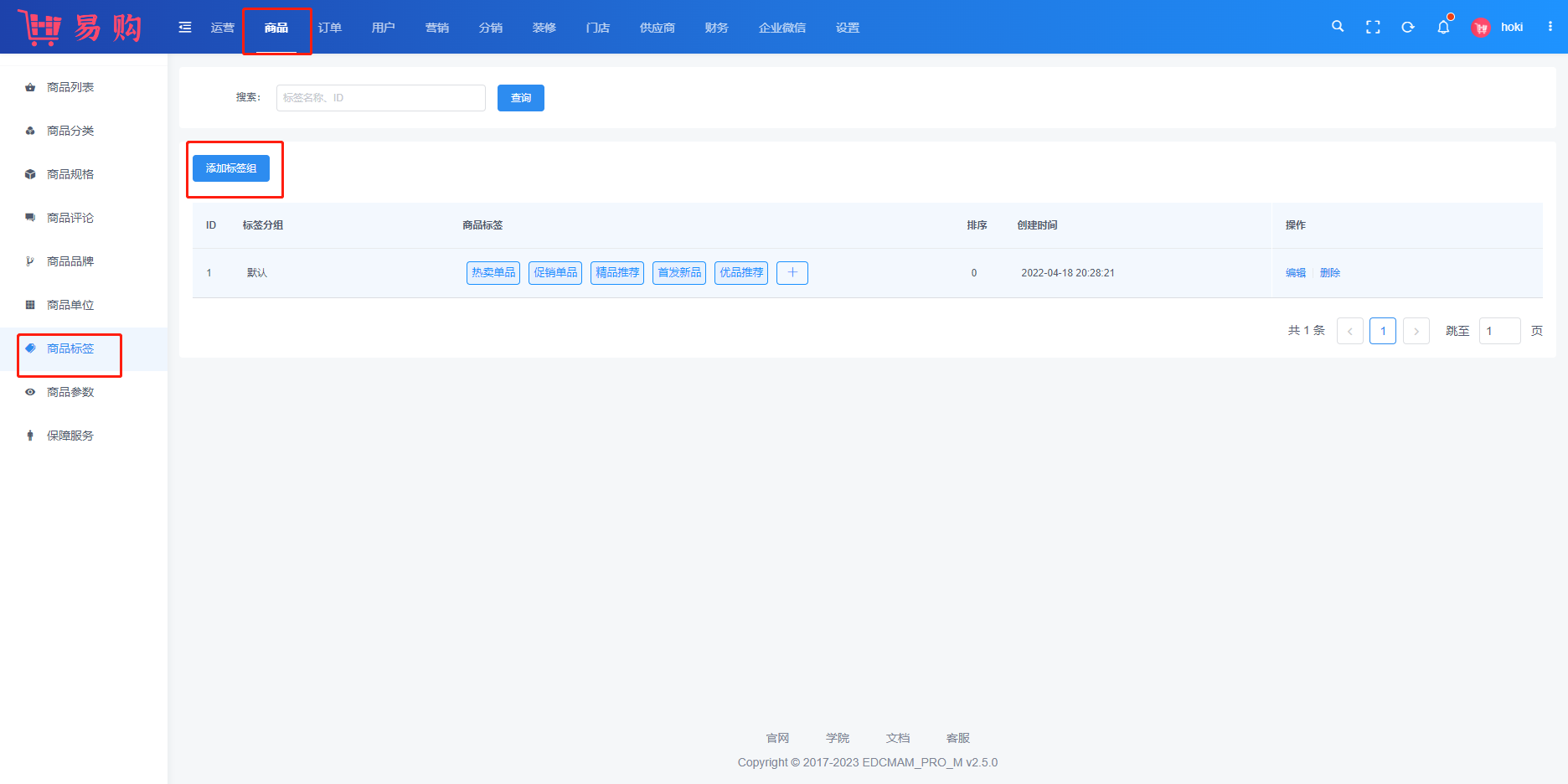 #商品标签 ###一、功能介绍 商品标签主要用于后台商品管理,提高后台管理效率。 ###二、操作流程 商品 > 商品标签 ###三、功能说明 1.新建标签组   2.添加/编辑商品时选择标签或新建标签