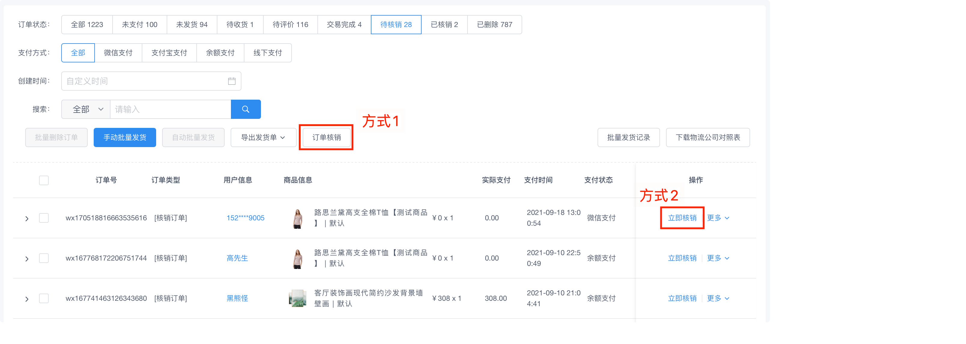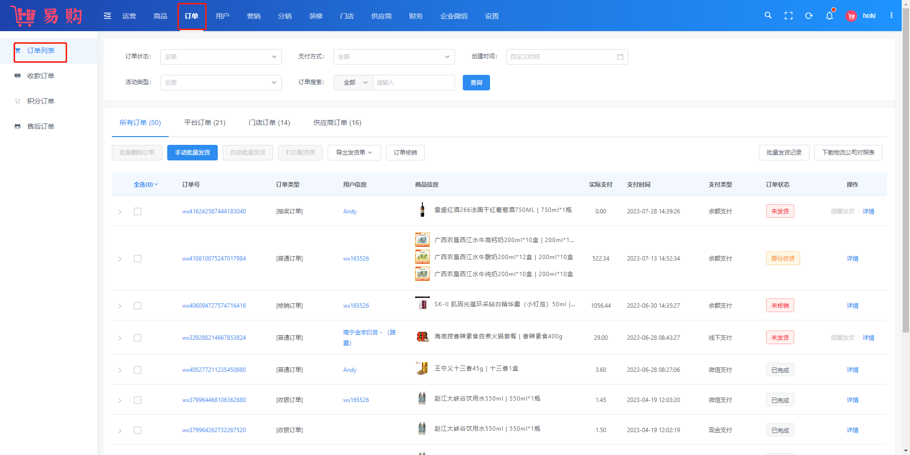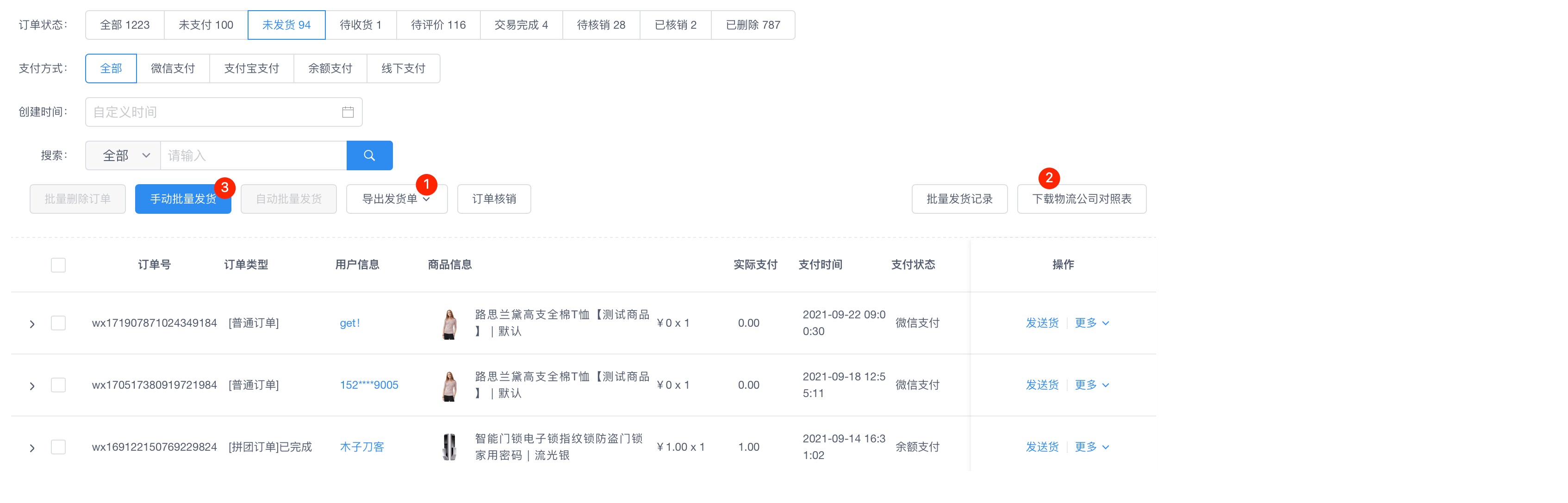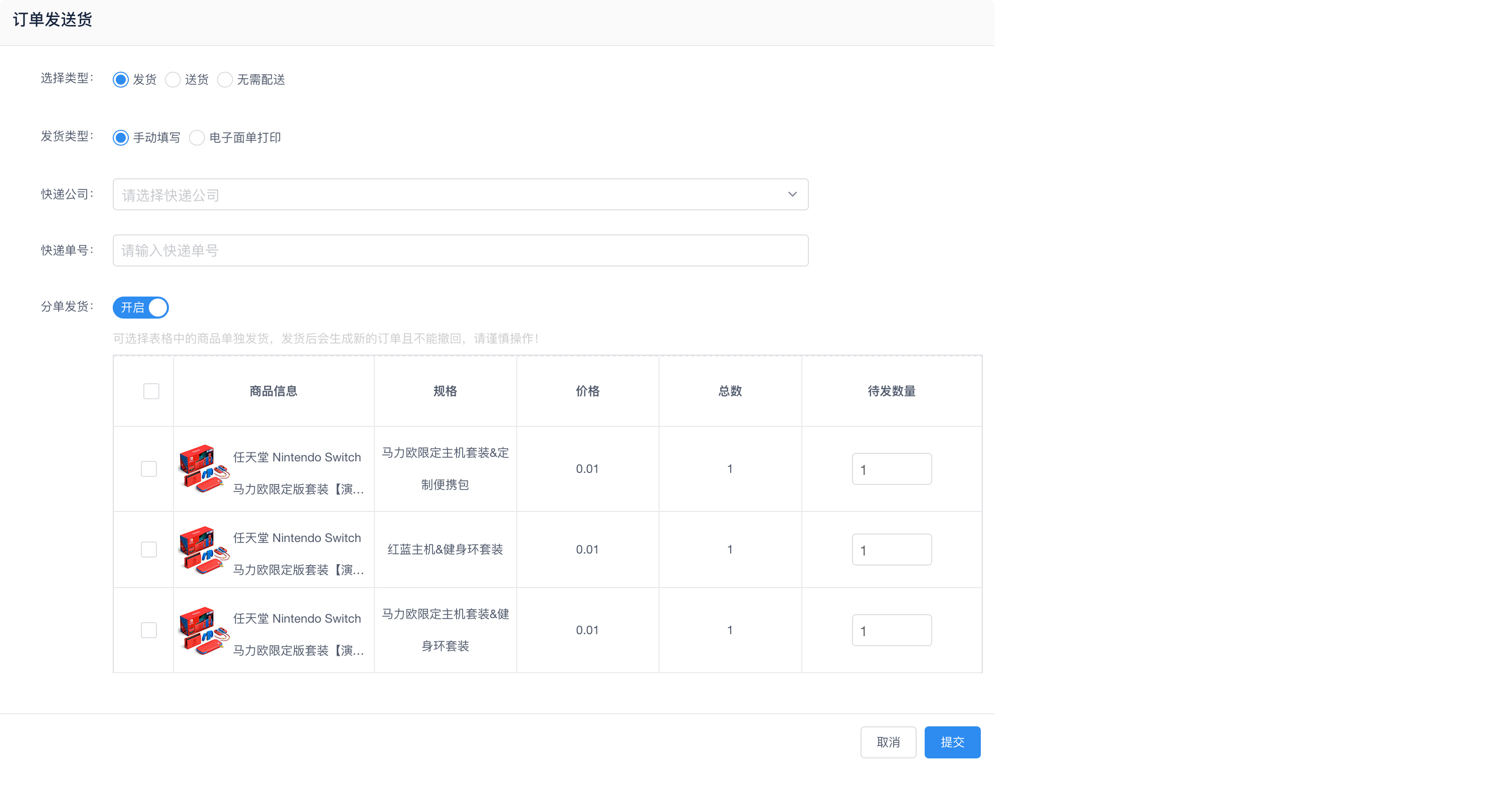 #订单发货 ###一、功能介绍 订单发货是订单模块的主要功能,包含单个订单发货、批量发货、电子面单打印、分单发货、订单核销等功能 ###二、操作流程 订单 > 订单列表  ###三、功能说明 ####订单发送货 1. 订单发货 选择物流公司,填写快递单号 此功能适用于线下手动发货,发完之后在后台手动录入发货的单号  ####2. 订单送货 选择配送员,完成发货 此功能适用于商城有自己的配送员,自己负责发货,如经营同城配送模式  ####3. 无需配送 无需填写物流信息,后台填写备注后用户的订单有展示 此功能适用于虚拟的商品发货,通过备注信息的方式发货  ####分单发货 订单中有多件商品,且需要在不同的地方发货时,可以选择分单发货 可选择订单中的商品单个发货或组合发货 分单发货后,会生成不同的子订单,用户退款时可选择子订单单独退款  #### 订单核销 核销订单基本上归属于门店,平台仍保留有订单的核销功能 可输入核销码核销,也可以在订单上点击“立即核销“按钮进行核销  #### 批量发货 1. 手动批量发货 第一步:导出发货单 第二步:下载物流公司对照表 第三步:在发货单手动填写上待发货订单对应的物流单号,物流公司可在“物流公司对照表“查看 第四步:选择手动批量发货,导入填写的发货单 第五步:完成导入,批量发货成功  ####2. 自动批量发货 第一步:选中需发货的订单 第二步:选择打印电子面单/送货/虚拟发货,三种方式选择其一即可 第三步:批量发货完成  #### 电子面单打印 1、电子面单打印功能,主要适用于订单较多,不方便单个录入的使用场景 2、比如电商直播订单较多时,就需要使用电子面单打印功能,有效节省人力及提高发货效率 3、系统中使用此功能,需要开通一号通及配置电子面单打印机 ###开通一号通:设置 > 一号通 > 电子面单 ###配置电子面单打印机:设置 > 系统设置 > 电子面单