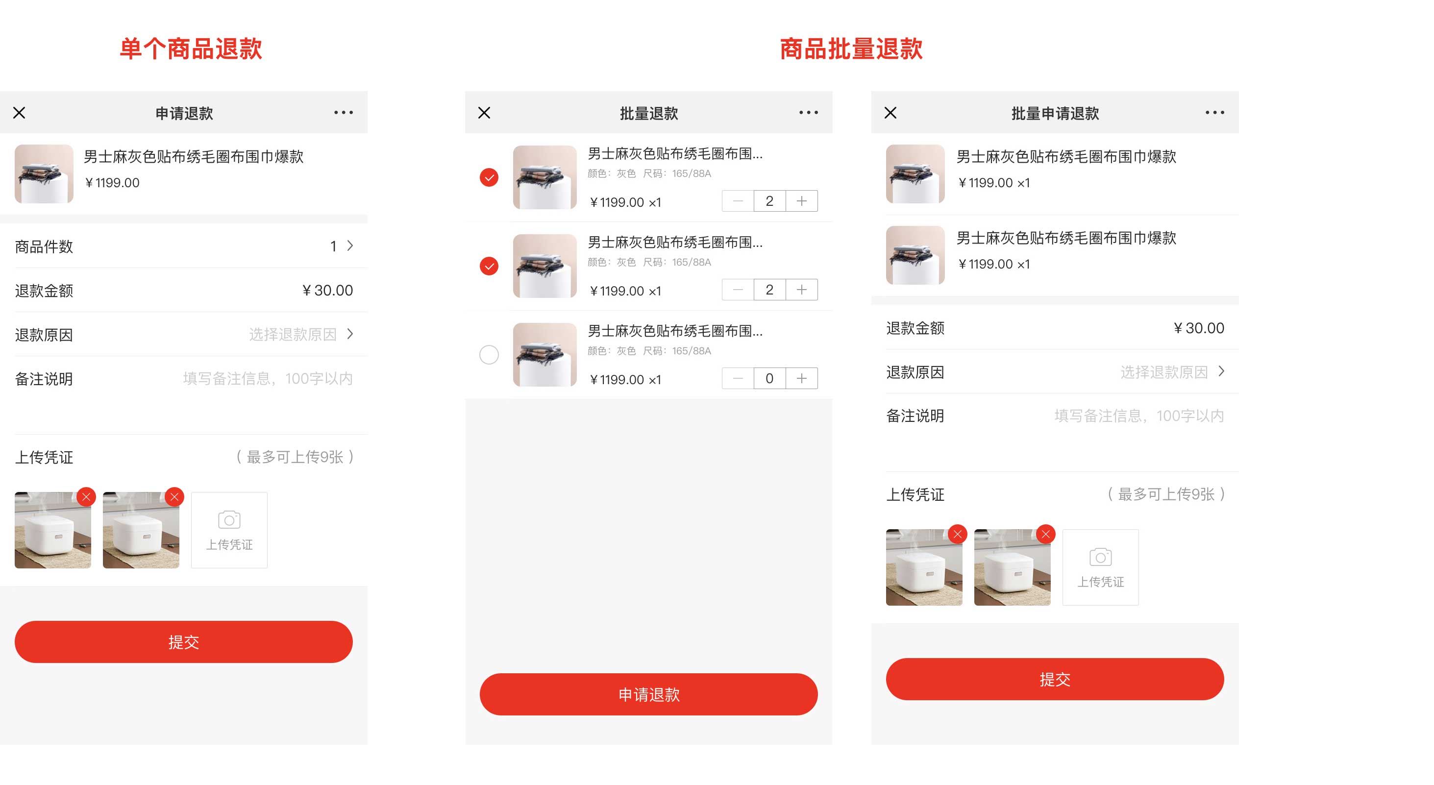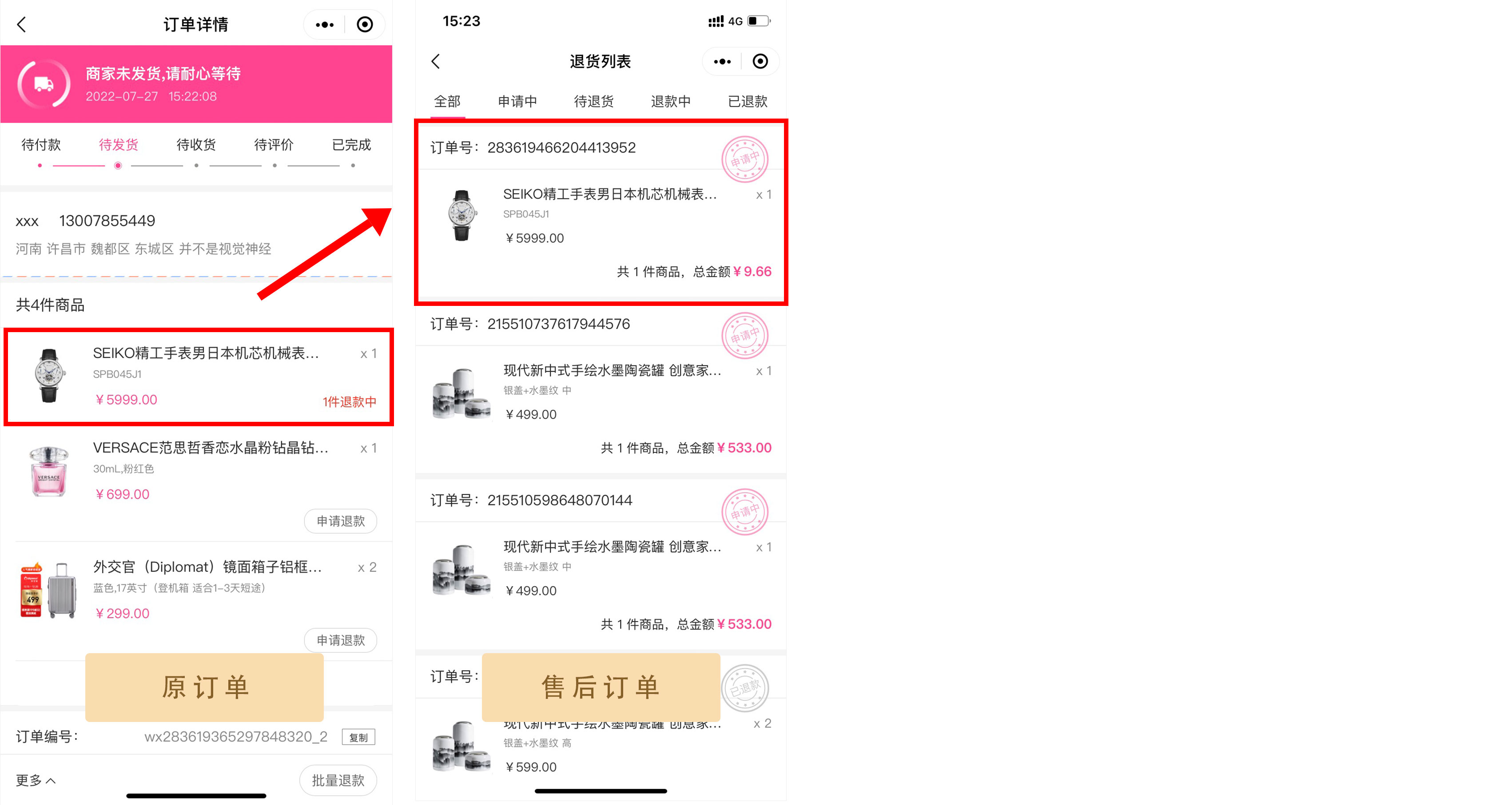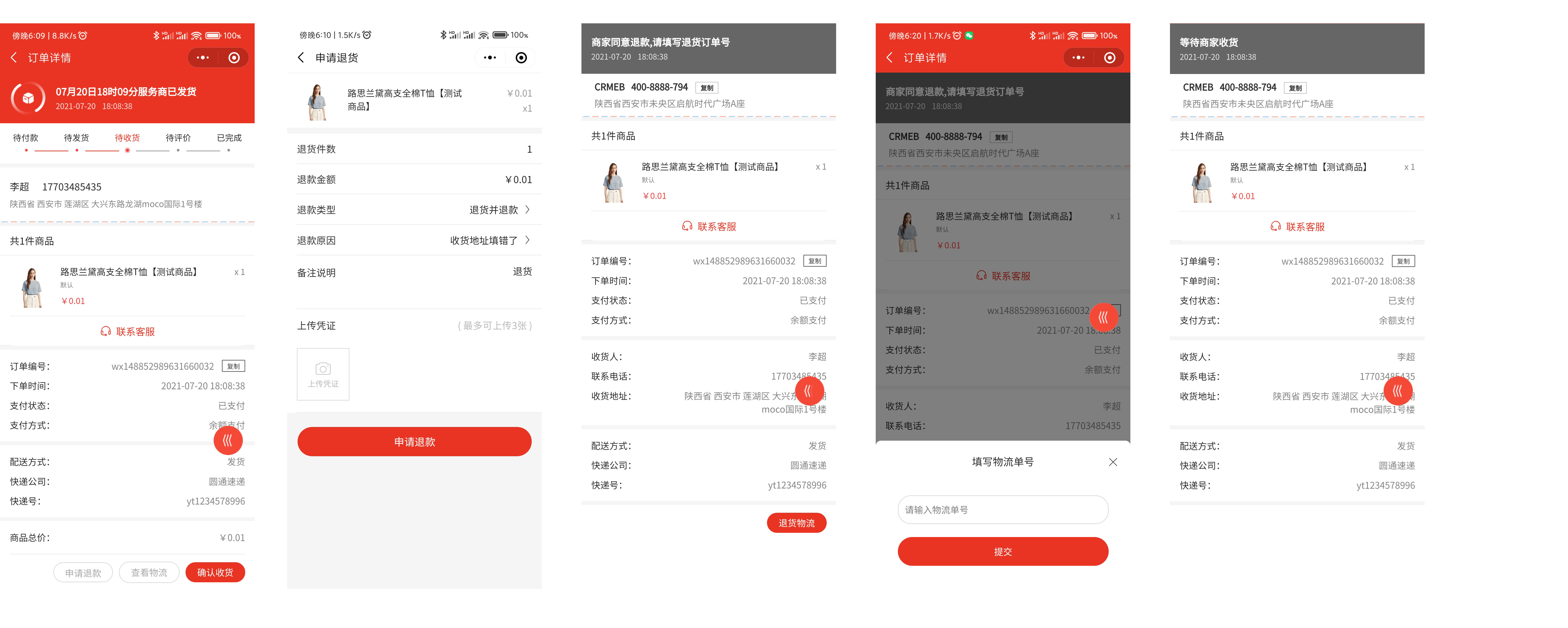 ##订单退款 ###一、功能介绍 客户在购买商品后任意订单状态均可进行退款维权 支持单个商品退款和商品批量退款两种方式  ###二、操作流程 订单 > 订单列表 ###三、功能说明 ####订单未发货 订单未发货时,用户可申请退款。用户申请后,后台进行退款处理 用户端页面演示:  ####订单已发货 订单已发货后,用户可申请 仅退款 或 退款退货 ####(1)仅退款 用户无需将货物退回,商家直接将金额原路退回  ####(2)退款退货 用户退款申请商家同意后,需将商品通过快递寄给商家,商家确认后金额原路退回  ####订单部分退款 当订单存在多件商品只退款其中n件的情况下,退款的订单进入售后订单中,原订单显示退款商品 ####移动端展示  ####后台展示