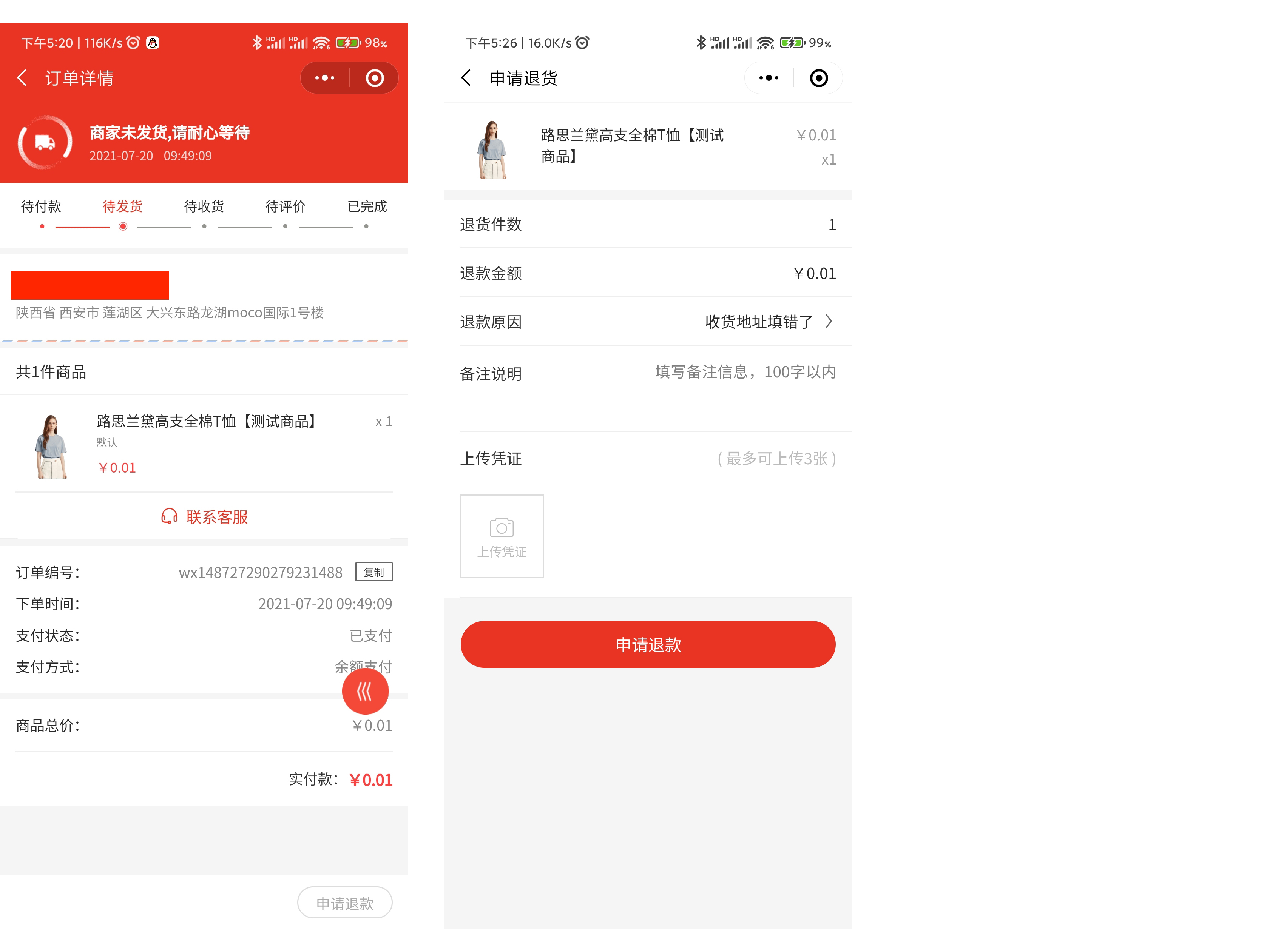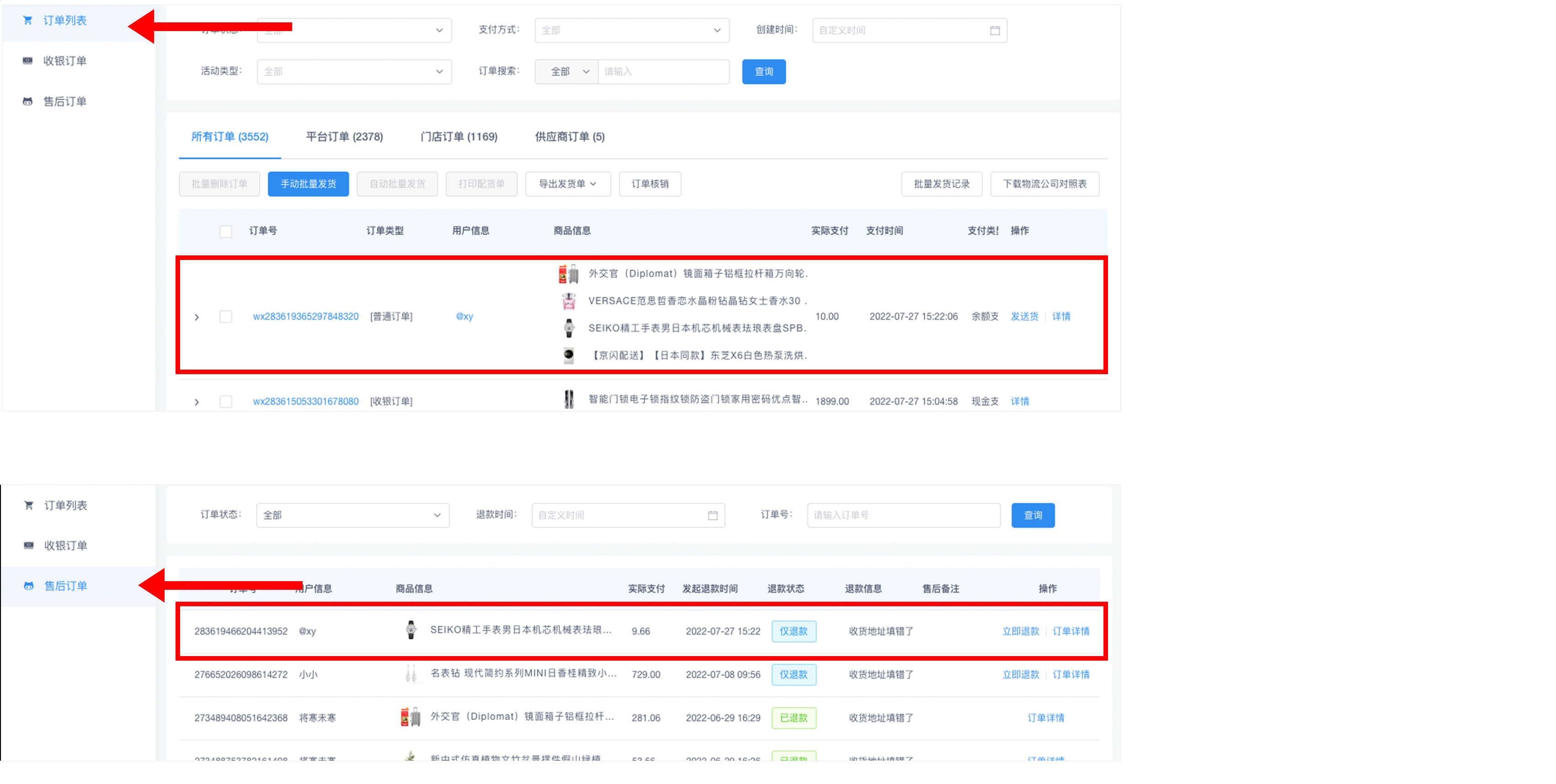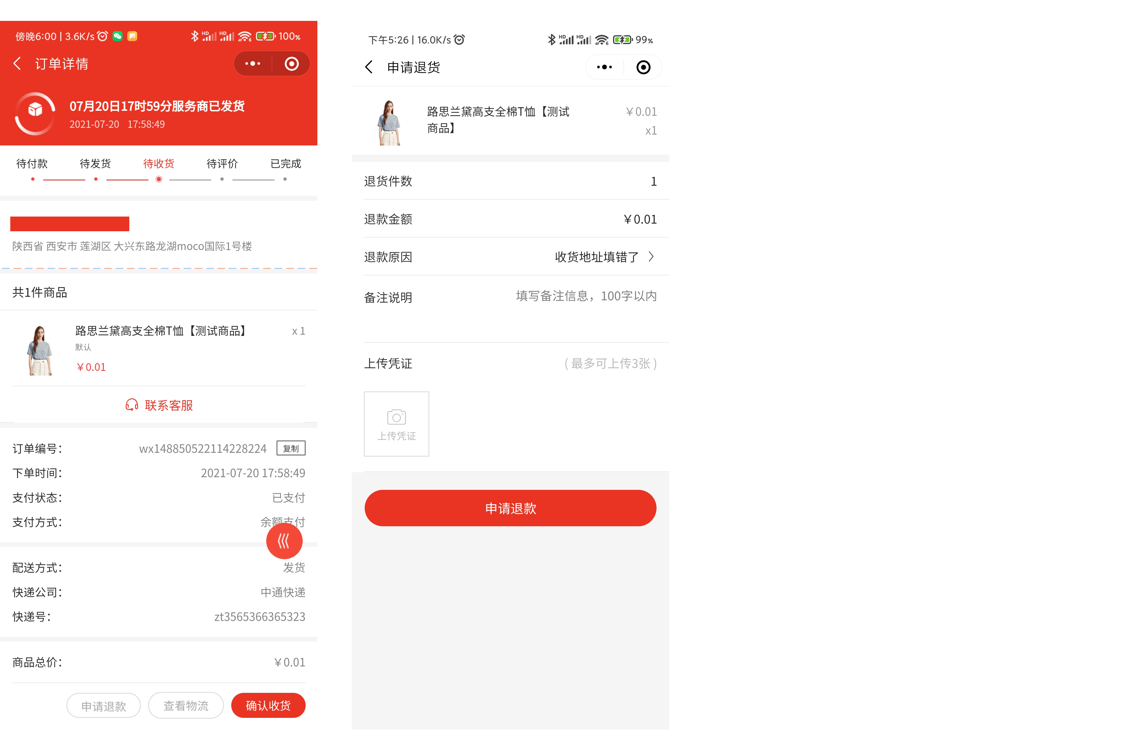 ##订单退款 ###一、功能介绍 客户在购买商品后任意订单状态均可进行退款维权 支持单个商品退款和商品批量退款两种方式  ###二、操作流程 订单 > 订单列表 ###三、功能说明 ####订单未发货 订单未发货时,用户可申请退款。用户申请后,后台进行退款处理 用户端页面演示:  ####订单已发货 订单已发货后,用户可申请 仅退款 或 退款退货 ####(1)仅退款 用户无需将货物退回,商家直接将金额原路退回  ####(2)退款退货 用户退款申请商家同意后,需将商品通过快递寄给商家,商家确认后金额原路退回  ####订单部分退款 当订单存在多件商品只退款其中n件的情况下,退款的订单进入售后订单中,原订单显示退款商品 ####移动端展示  ####后台展示